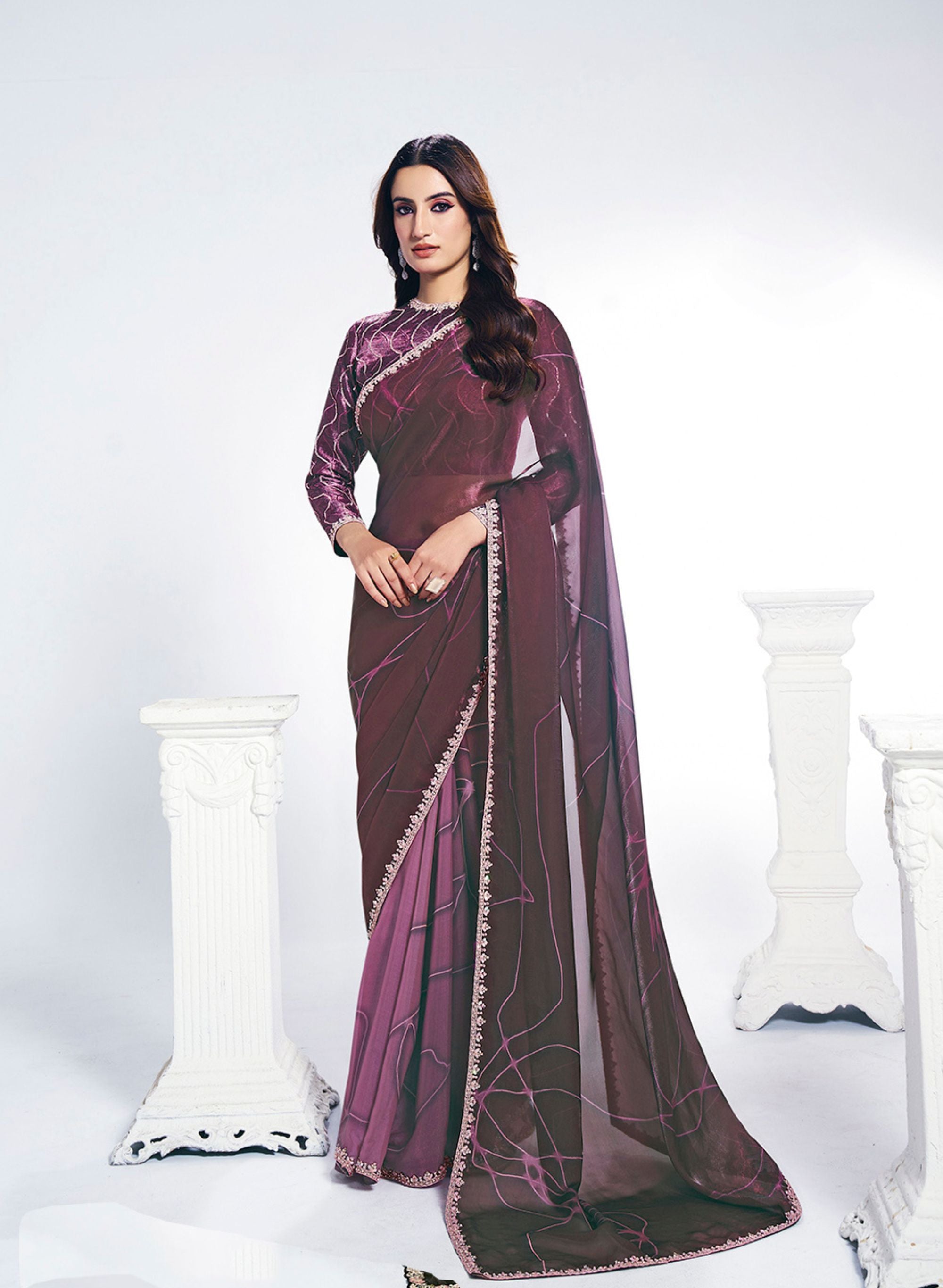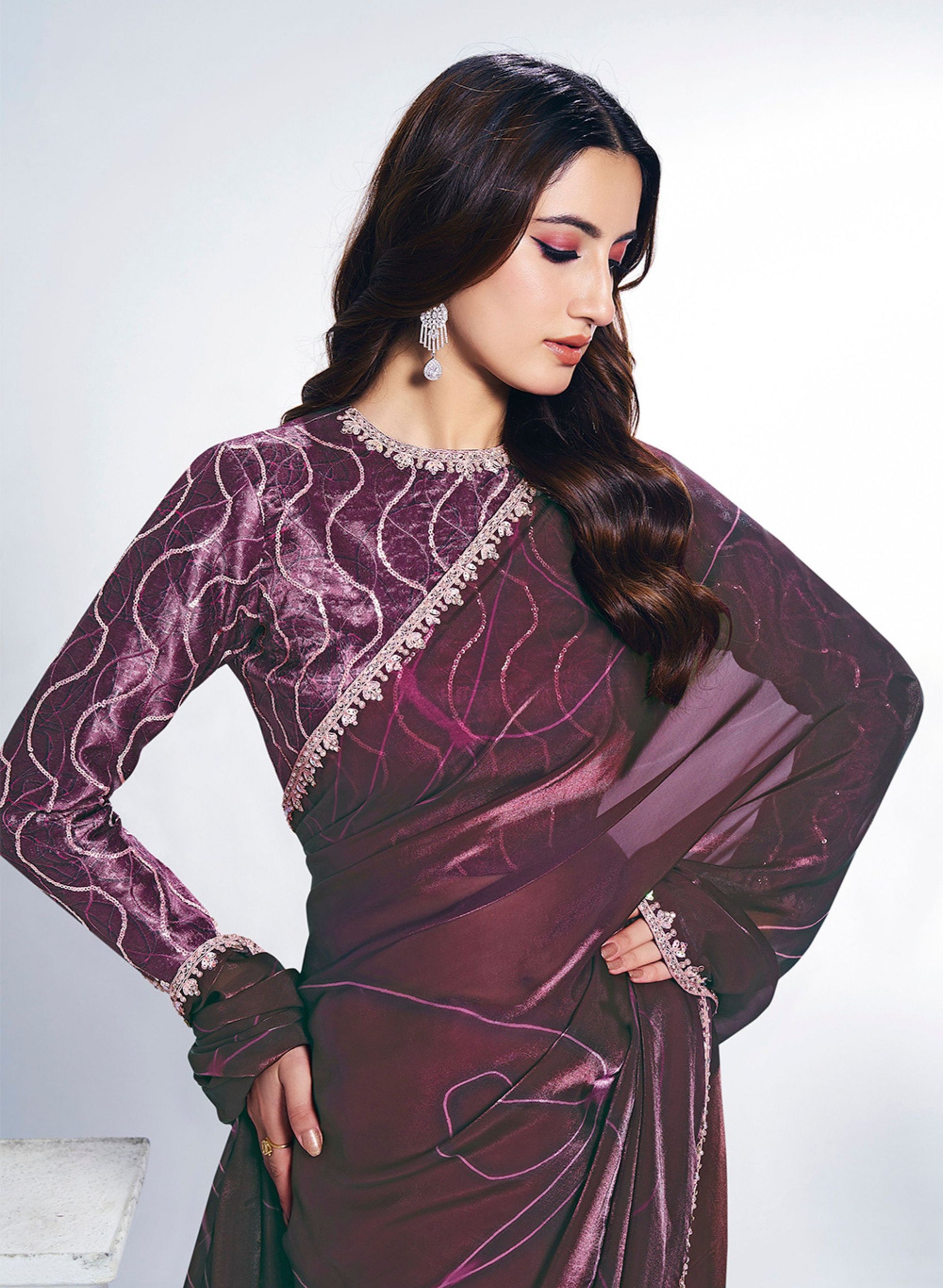 Bring sophistication to your wardrobe with this Elegant Wine Pink Saree with Border and Matching Blouse Party Wear designed for parties, receptions, and festive occasions. This saree features a graceful blend of wine and pink tones with subtle abstract prints, paired with a delicately embroidered lace border for a refined look. The matching full-sleeve blouse with detailed pattern work enhances its elegance, making it perfect for modern women who love a chic yet traditional outfit. Crafted from lightweight georgette, this saree drapes beautifully, ensuring comfort and style for all-day wear. Pair it with statement earrings, a clutch, and heels for a complete festive look.