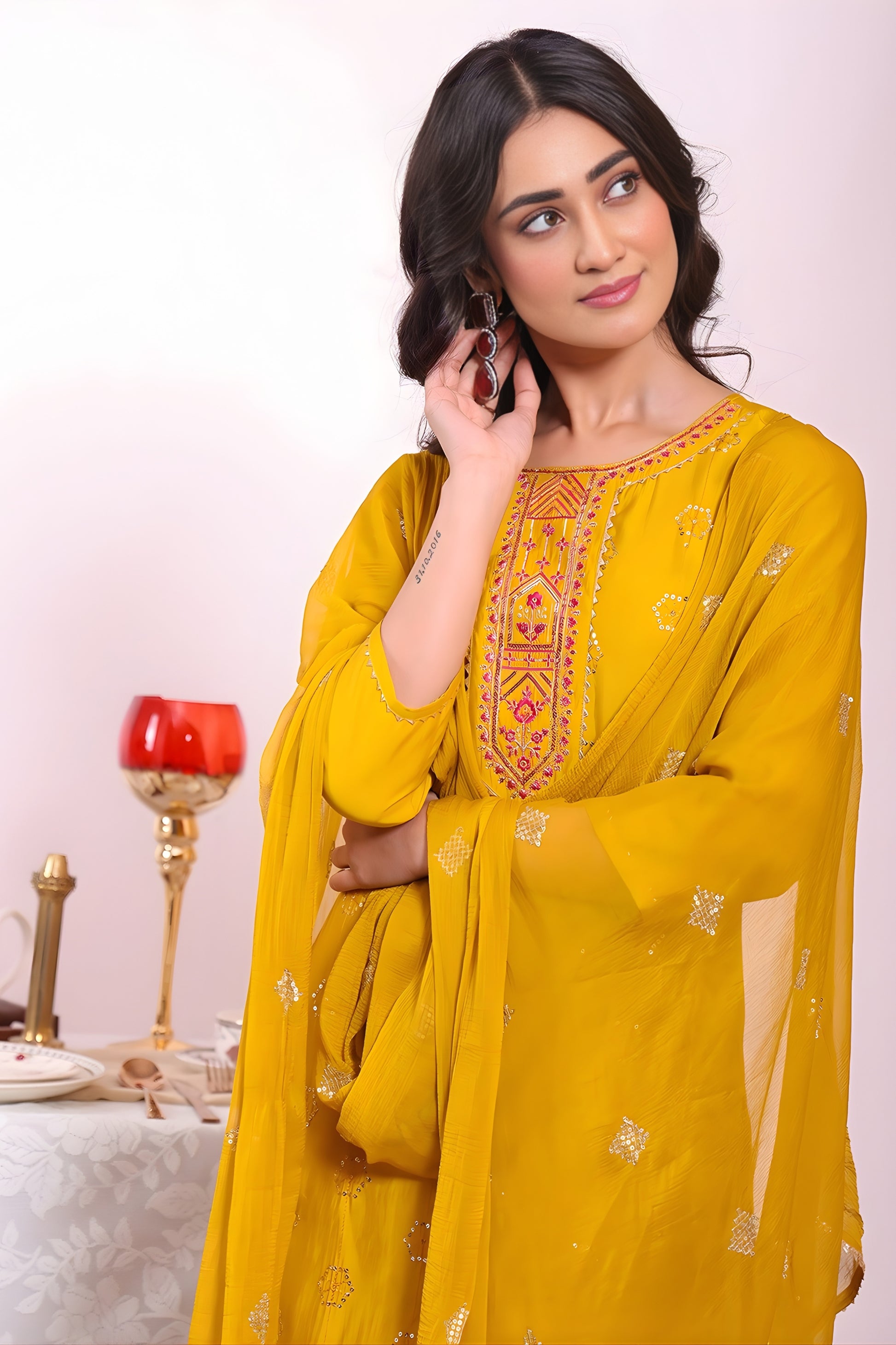 Add a vibrant touch to your ethnic wardrobe with this Mustard Yellow Poly Silk Embroidered Readymade Salwar Suit with Dupatta for Women. Designed for modern women who love elegant traditional outfits, this beautiful suit set combines premium fabric, stylish embroidery, and a graceful silhouette perfect for festive and special occasions. Crafted from high-quality Poly Silk fabric, the kurta offers a smooth texture, lightweight comfort, and a luxurious appearance. The front embroidery adds a delicate designer touch that enhances the beauty of the outfit. Paired with a matching bottom and a soft flowing dupatta, this readymade kurta pant suit set creates a complete ethnic look that is both stylish and comfortable.
