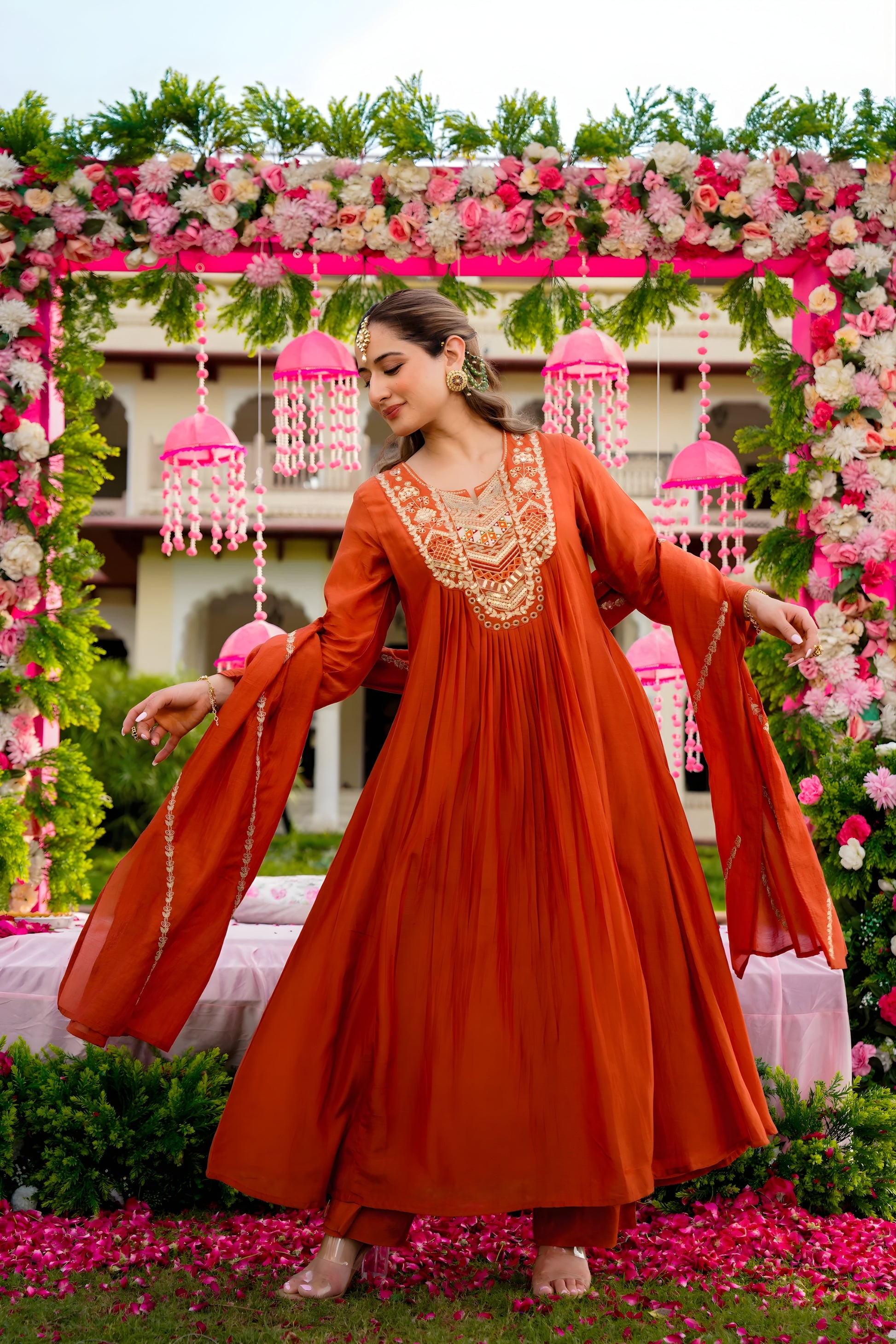 Make a stunning style statement with this Fancy Rust Orange Embroidered Vichitra Silk Salwar Suit with Dupatta, designed to bring elegance and grace to your wedding and festive wardrobe. Crafted from premium Vichitra silk fabric, this salwar suit offers a rich texture, smooth finish, and beautiful fall that enhances your overall ethnic look. The kurta features intricate embroidery on the neckline and yoke, adding a touch of traditional charm and sophistication. Paired with a comfortable matching salwar and a gracefully draped embroidered dupatta, this ensemble blends classic craftsmanship with modern elegance. The warm rust orange shade makes it a perfect choice for wedding functions, festive celebrations, parties, and traditional occasions.