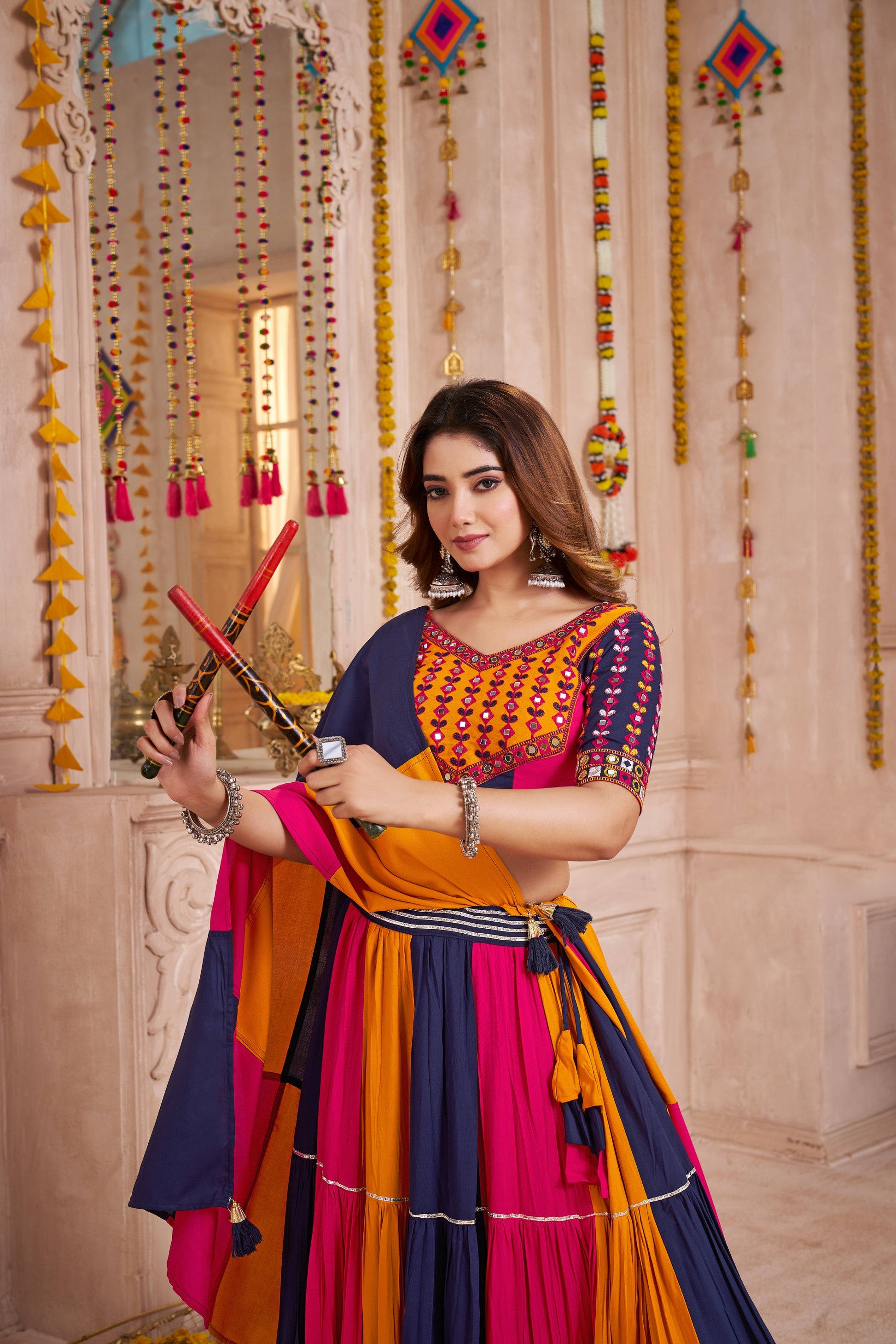 Turn heads this festive season with our Multicolor Gujarati Navratri Chaniya Choli, designed to bring vibrance and tradition together. The flared chaniya features bold hues of navy blue, mustard yellow, and pink, creating a stunning color-blocked effect that’s perfect for Garba and Dandiya nights. The embroidered blouse with traditional Gujarati mirror work and intricate detailing adds a festive charm, while the matching dupatta completes the look with elegance. Crafted in lightweight fabric, this outfit ensures comfort and style for long celebrations.