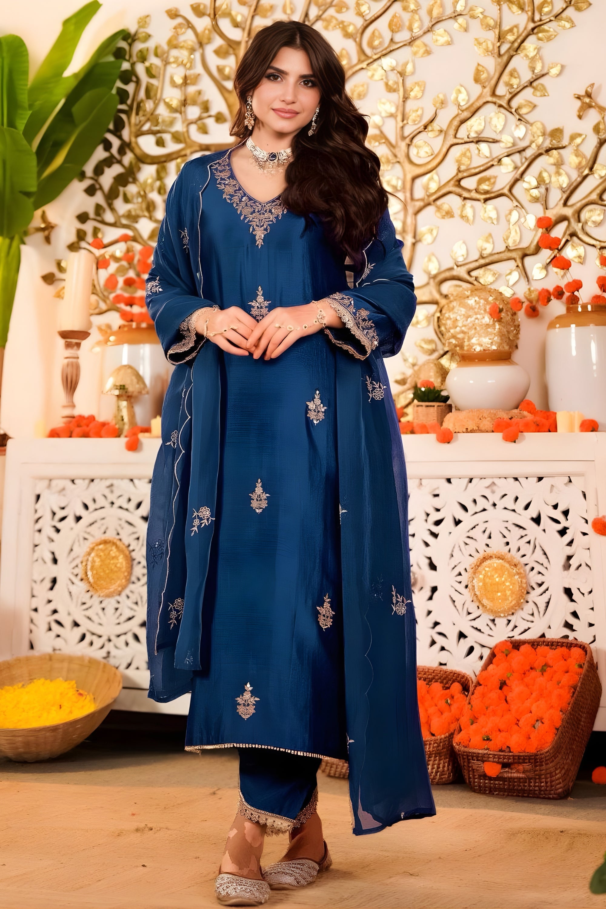 Add timeless elegance to your festive wardrobe with this Glorious Navy Blue Embroidered Vichitra Silk Salwar Suit with Dupatta, perfect for weddings and special occasions. Crafted from premium Vichitra silk fabric, this ensemble offers a rich texture, graceful fall, and luxurious comfort for all-day wear. The suit is beautifully adorned with delicate embroidery on the neckline, sleeves, and scattered motifs, creating a refined and sophisticated look. Complemented by a matching embroidered dupatta, this salwar suit blends traditional craftsmanship with contemporary styling. The deep navy blue shade adds a regal charm, making it an ideal choice for wedding functions, festive celebrations, receptions, and traditional events.