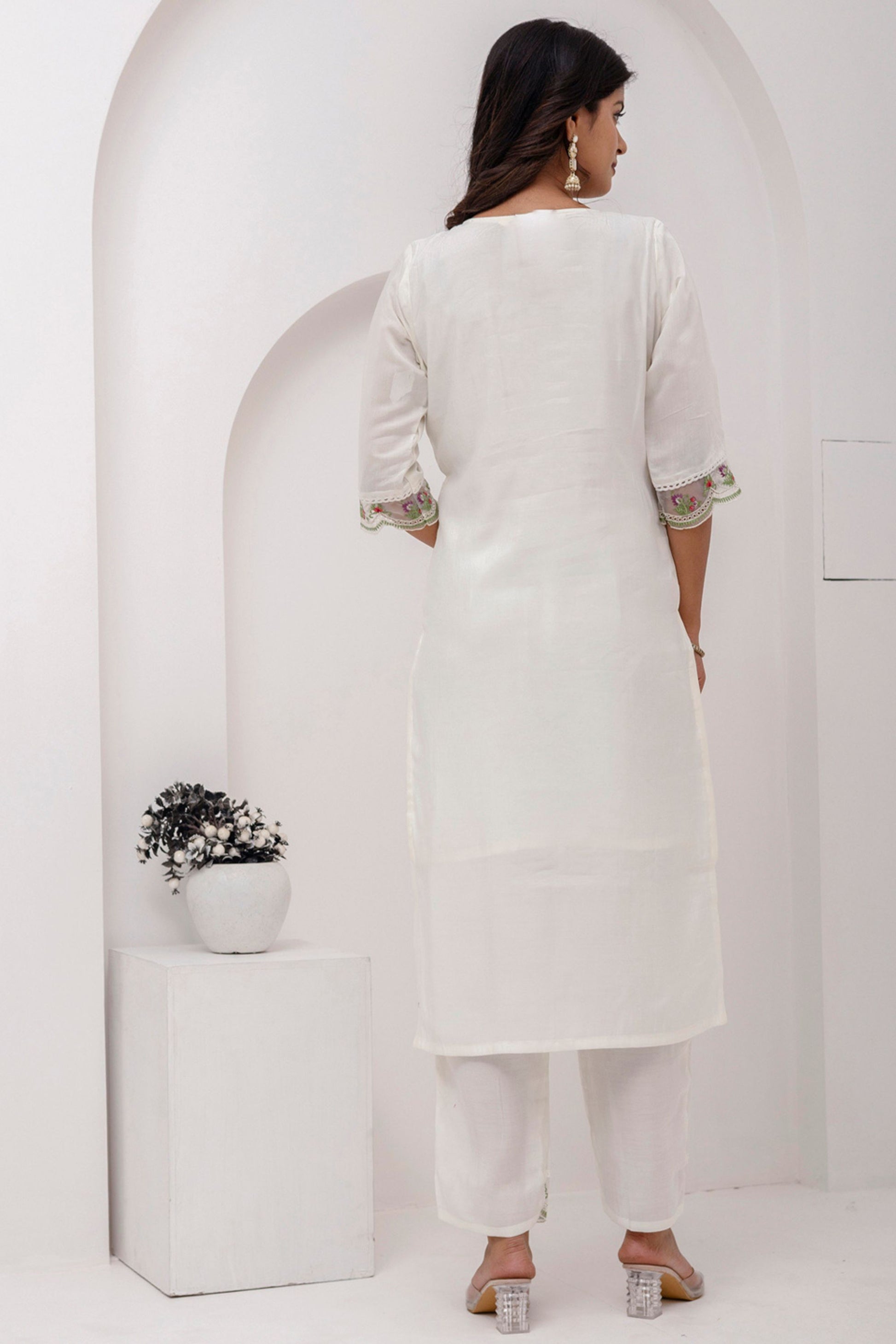 Embrace timeless elegance with this Graceful White Viscose Silk Embroidered Salwar Suit with Floral Dupatta. Crafted from premium viscose silk fabric, this outfit offers a luxurious feel and graceful drape. The kurta features intricate floral embroidery on the neckline, hem, and sleeves, paired beautifully with matching embroidered pants. The lightweight dupatta adorned with delicate floral motifs and tassel details completes the sophisticated look. Perfect for festive occasions, family gatherings, or elegant daytime events, this salwar suit blends traditional charm with modern finesse.