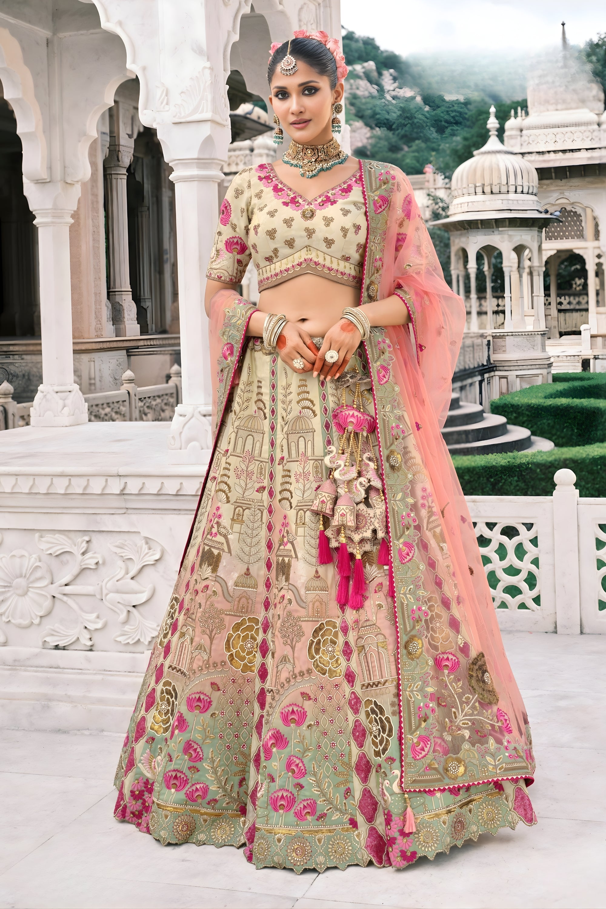 Gorgeous Beige and Green Embroidered Silk Lehenga Choli with Pink Net Dupatta for Wedding