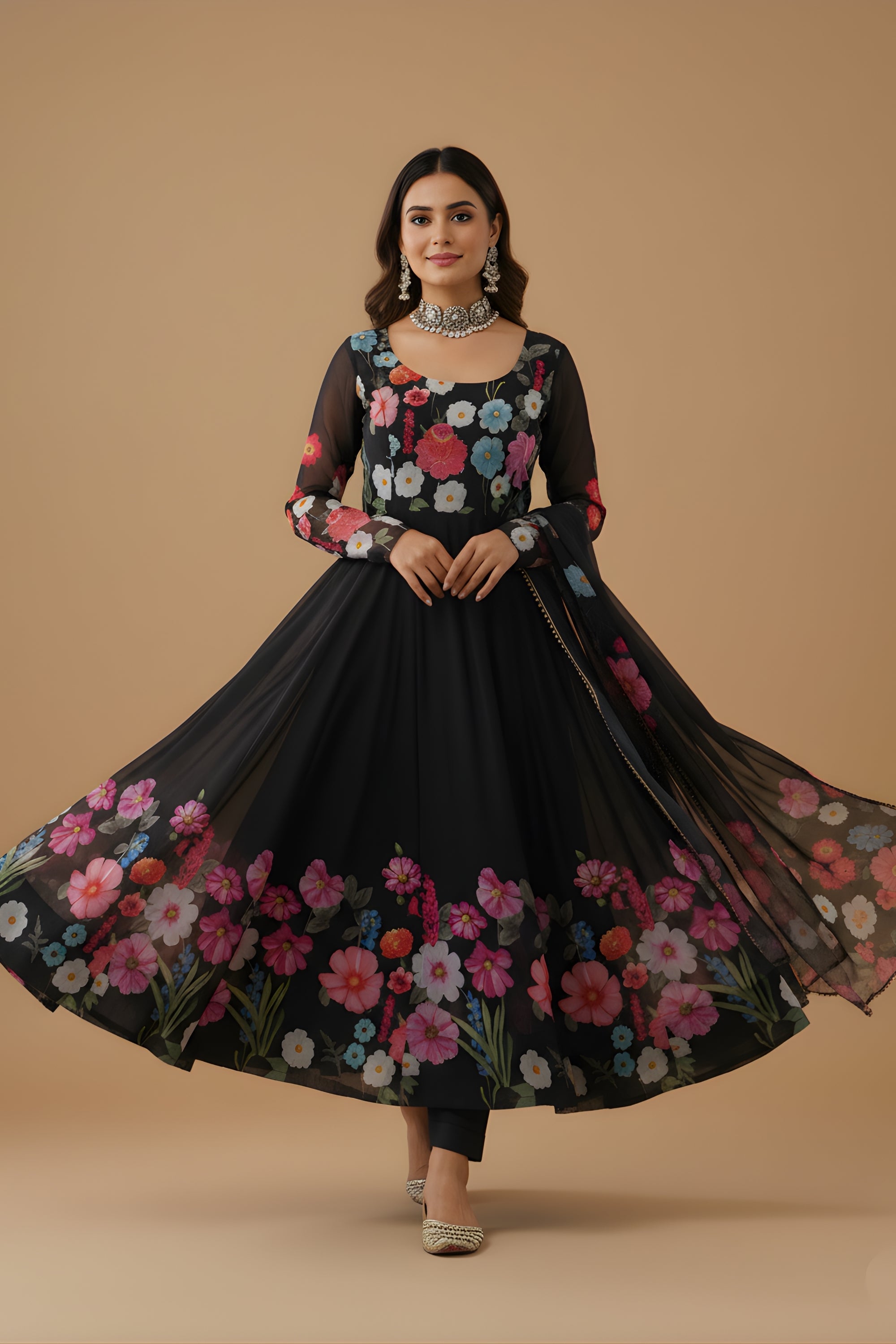 Gorgeous Black Floral Printed Readymade Salwar Suit with Flared Kurta and Matching Dupatta