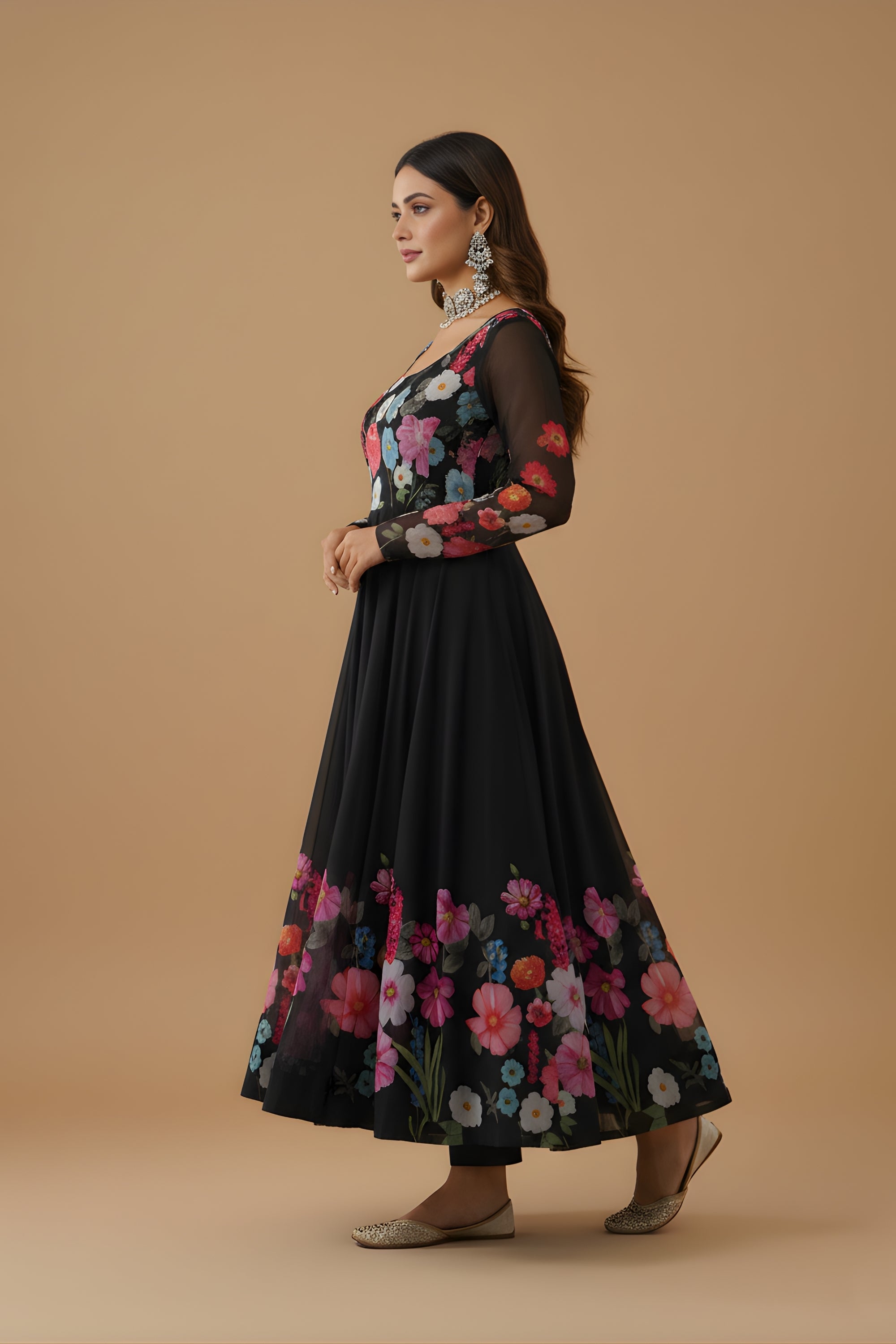Make a timeless style statement with this Gorgeous Black Floral Printed Readymade Salwar Suit, designed for women who love graceful ethnic wear with a modern touch. Crafted from soft, lightweight and breathable fabric, this outfit features a rich black base highlighted with vibrant floral prints, creating a striking and elegant look. The kurta is styled with a classic round neckline and a beautifully flared silhouette, offering effortless movement and a flattering fit. Paired with a comfortable matching bottom and a coordinated floral printed dupatta with delicate border detailing, this ensemble brings together sophistication and comfort in perfect balance. Ideal for festive celebrations, parties, evening functions, family gatherings, weddings, and special occasions, this readymade salwar suit ensures you look effortlessly elegant throughout the day.