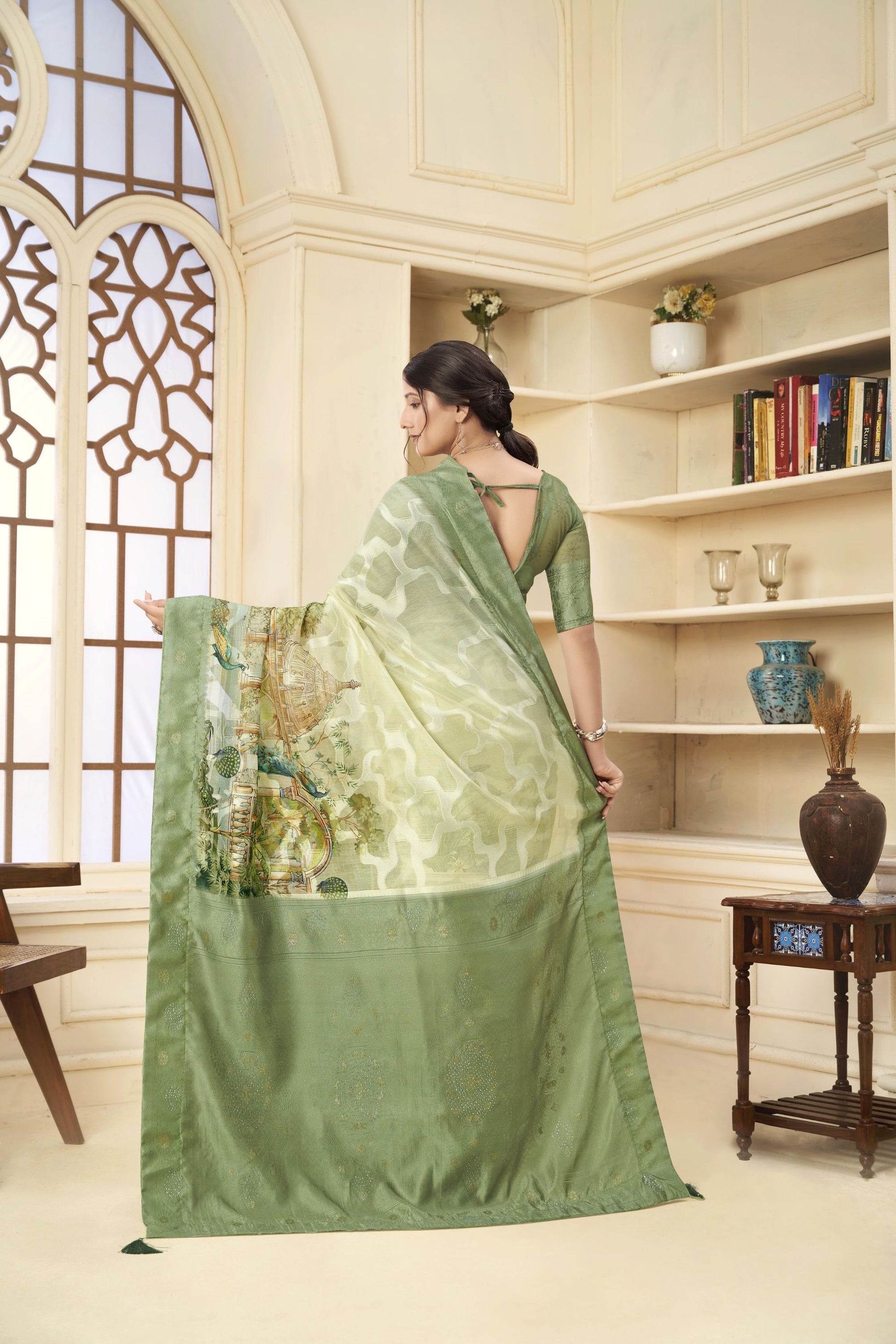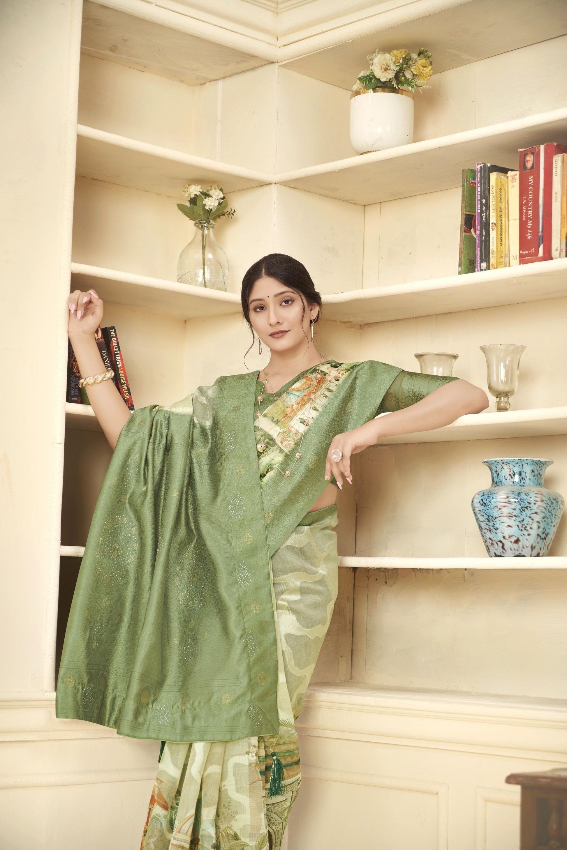 Gorgeous Green and Beige Printed Linen Silk Saree with Zari Work and Blouse Piece