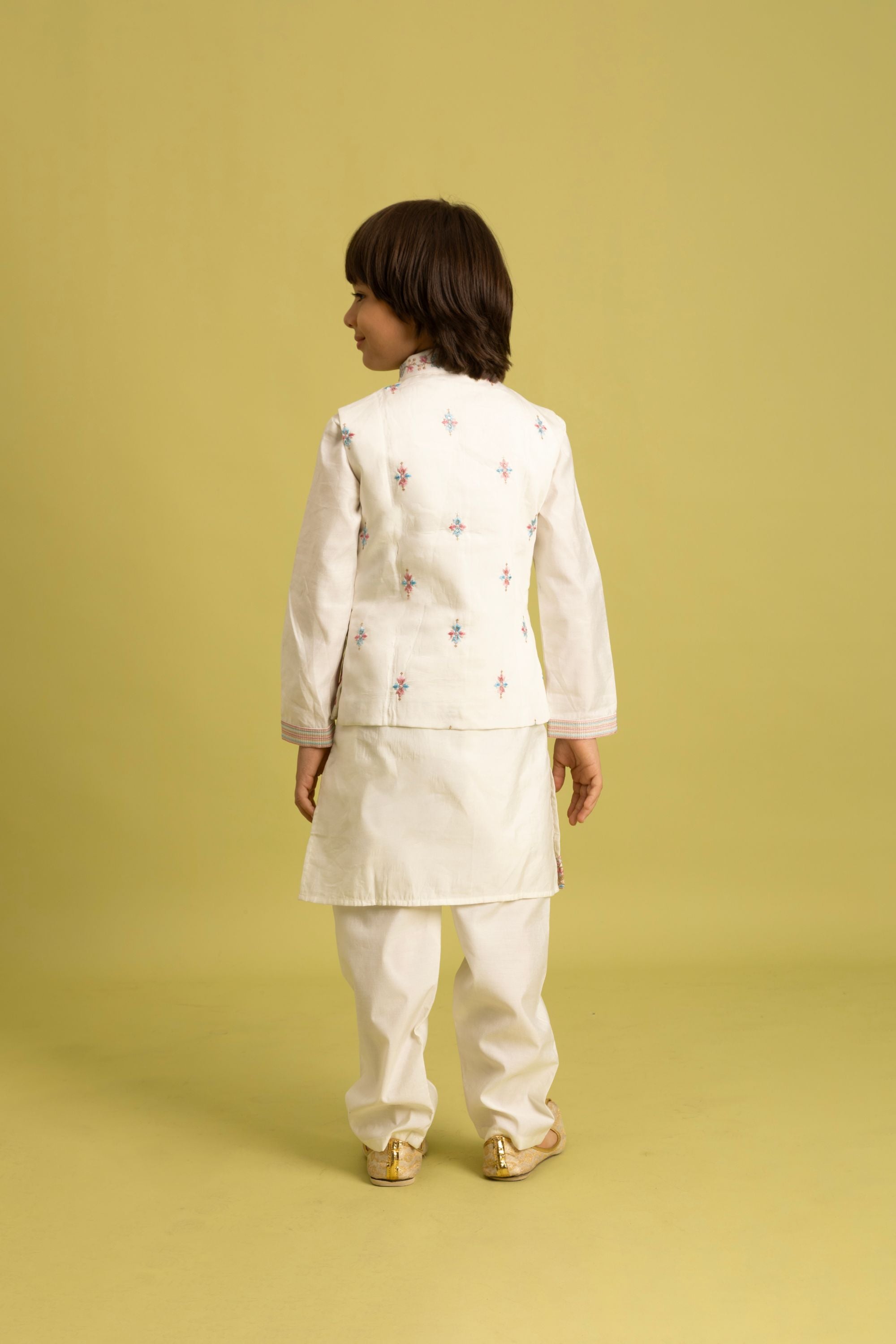 Give your little one a charming traditional look with this Graceful White Viscose Silk Embroidered Kurta Set with Floral Nehru Jacket for Boys. Crafted from soft and premium viscose silk fabric, this outfit combines comfort with elegance. The beautifully embroidered floral Nehru jacket adds a festive flair, making it perfect for weddings, cultural events, and festive celebrations. The set includes a stylish kurta, matching churidar, and a floral embroidered jacket for a complete ethnic ensemble.