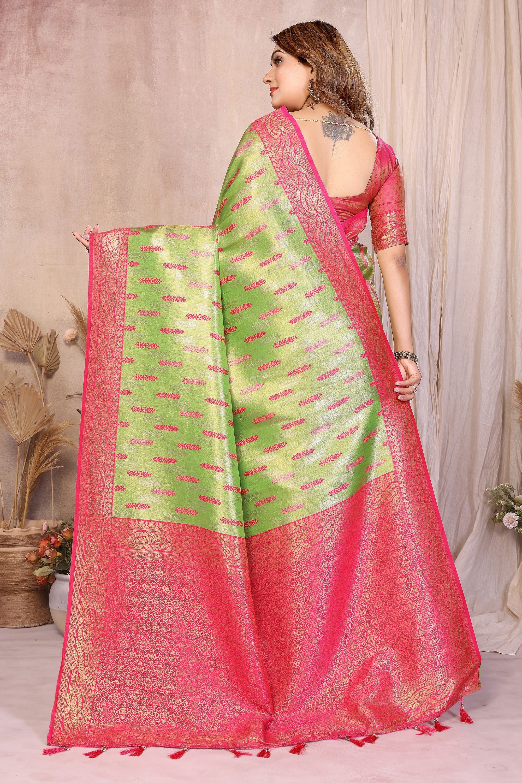 Elevate your festive elegance with this stunning Green Pink Banarasi Silk Saree with Rich Zari Weaving and Contrasting Pallu , crafted with luxurious zari weaving and intricate traditional motifs. The vibrant green body beautifully complements the rich pink border and pallu, making it a perfect choice for weddings, receptions, cultural functions, and special celebrations. Made from premium-quality soft silk, this saree offers a graceful drape, exceptional shine, and long-lasting comfort. The detailed golden zari work on the border and pallu adds a royal appeal, while the contrasting blouse enhances the overall traditional charm. Whether you’re dressing up for a festive event or gifting a loved one, this Banarasi silk saree promises unmatched beauty, sophistication, and timeless style.