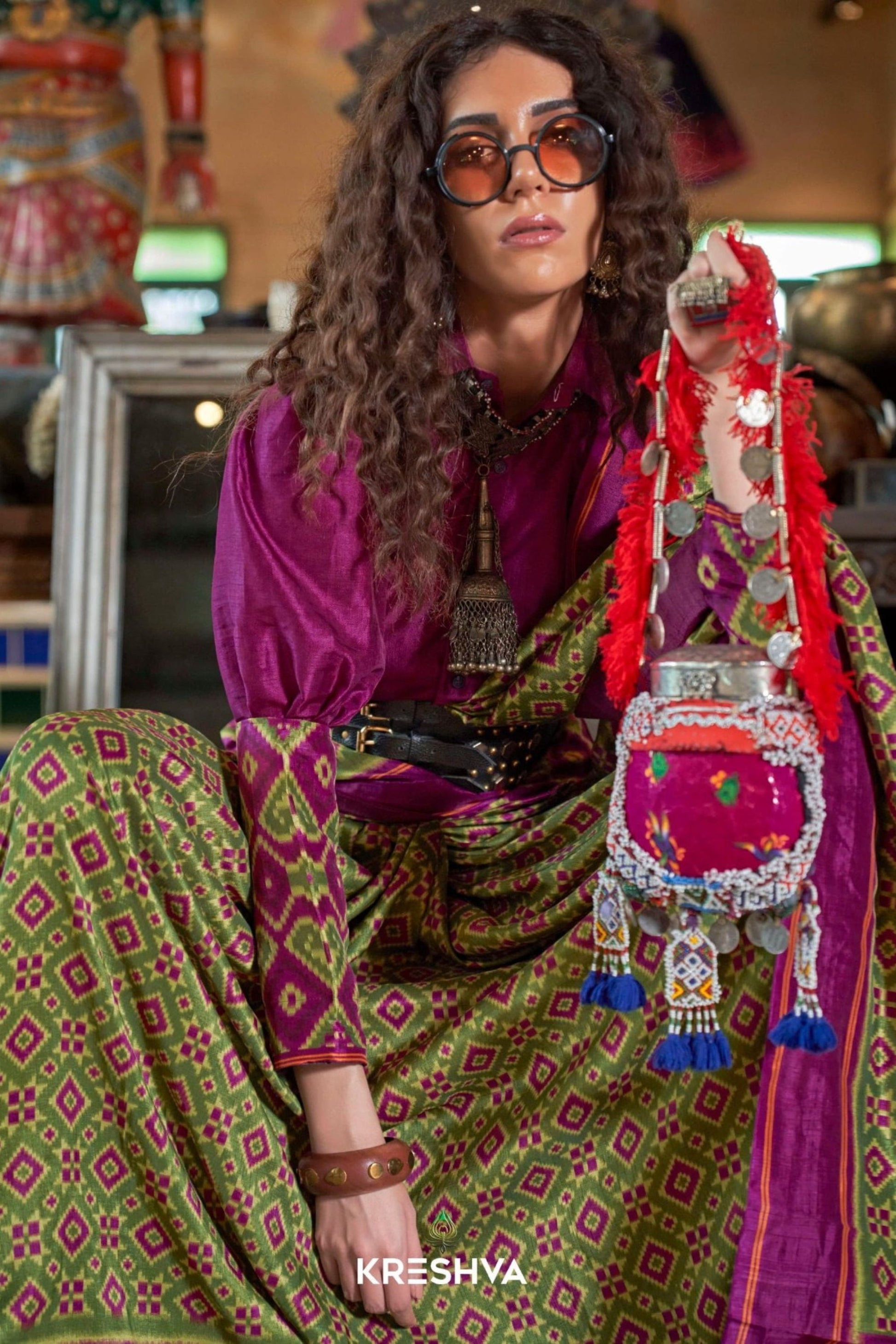 Green Purple Patola Silk Saree with Traditional Ikat Weave