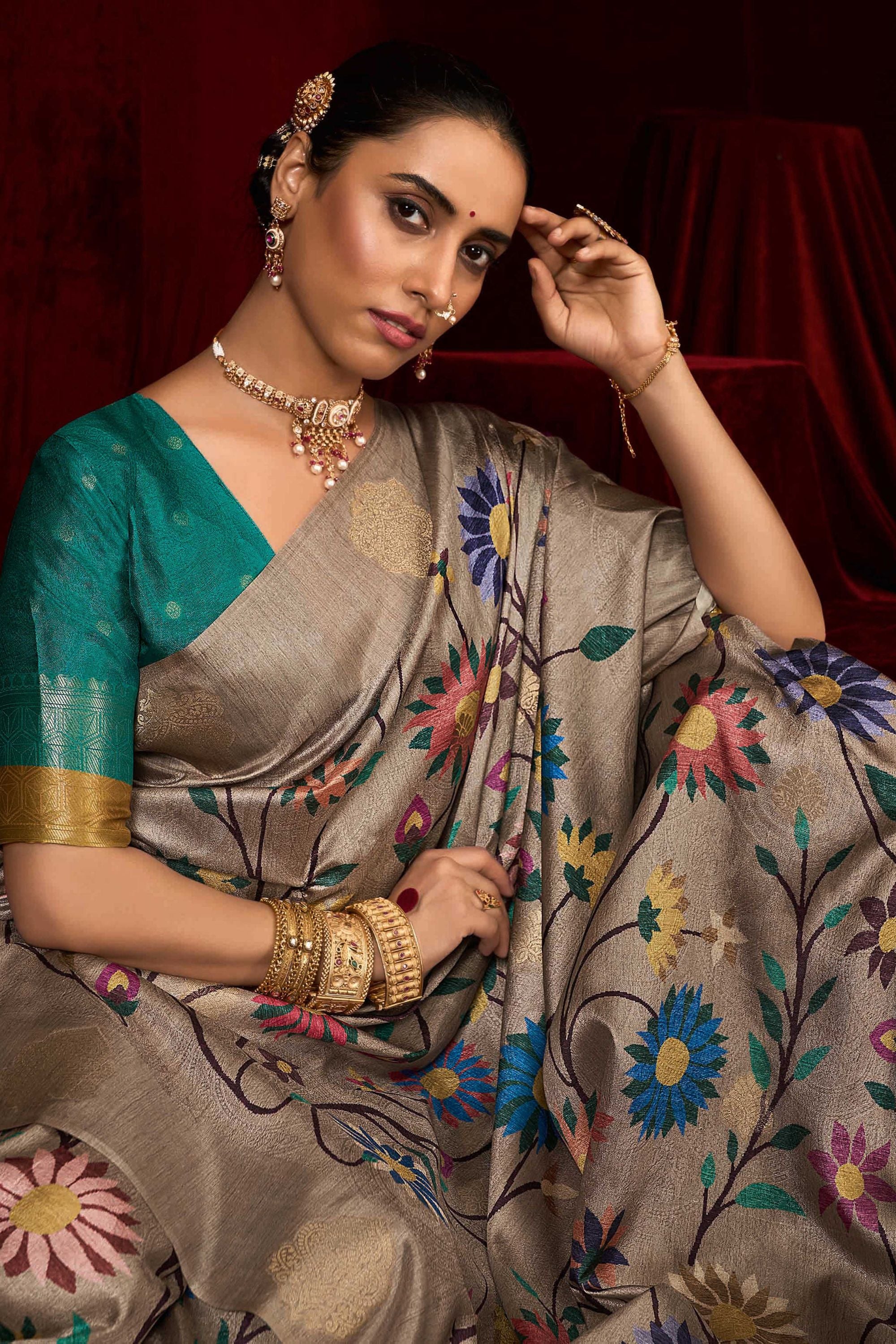 levate your ethnic wardrobe with this  Grey Banarasi Silk Saree with Green Contrast Pallu Crafted from premium Banarasi silk, this saree showcases intricate zari motifs, vibrant floral patterns, and a luxurious drape that enhances every silhouette. The contrasting green pallu adds a regal charm, making it a perfect choice for weddings, festive celebrations, poojas, and grand occasions. Paired with a matching blouse, this saree offers timeless elegance with a modern appeal. Add this masterpiece to your collection for a stunning, traditional-yet-stylish look.
