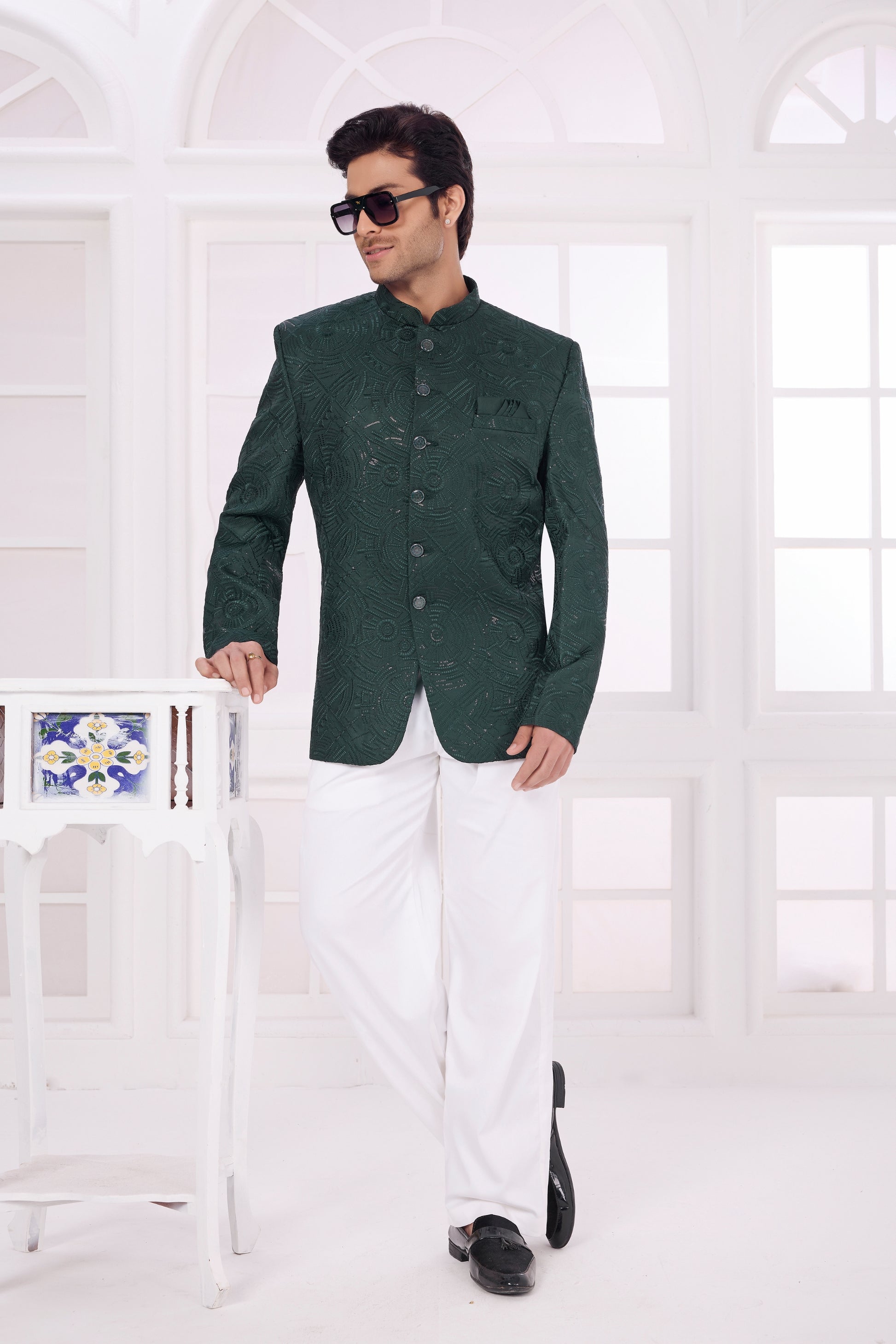 Elevate your ethnic style with this men’s dark green textured Jodhpuri jacket, designed for weddings, festive occasions, receptions, and traditional celebrations. Featuring an elegant self-textured pattern and a sharp band collar, this Indo-Western jacket delivers a rich, royal appearance with modern tailoring. Crafted from premium-quality fabric, this Jodhpuri blazer offers superior comfort, breathability, and long-lasting durability. The structured fit enhances your silhouette while allowing easy movement, making it ideal for long events and celebrations. Style it with white or beige trousers, churidar pants, or traditional mojris to complete a sophisticated ethnic look.  This product includes only the Jodhpuri jacket. *Pant is not included