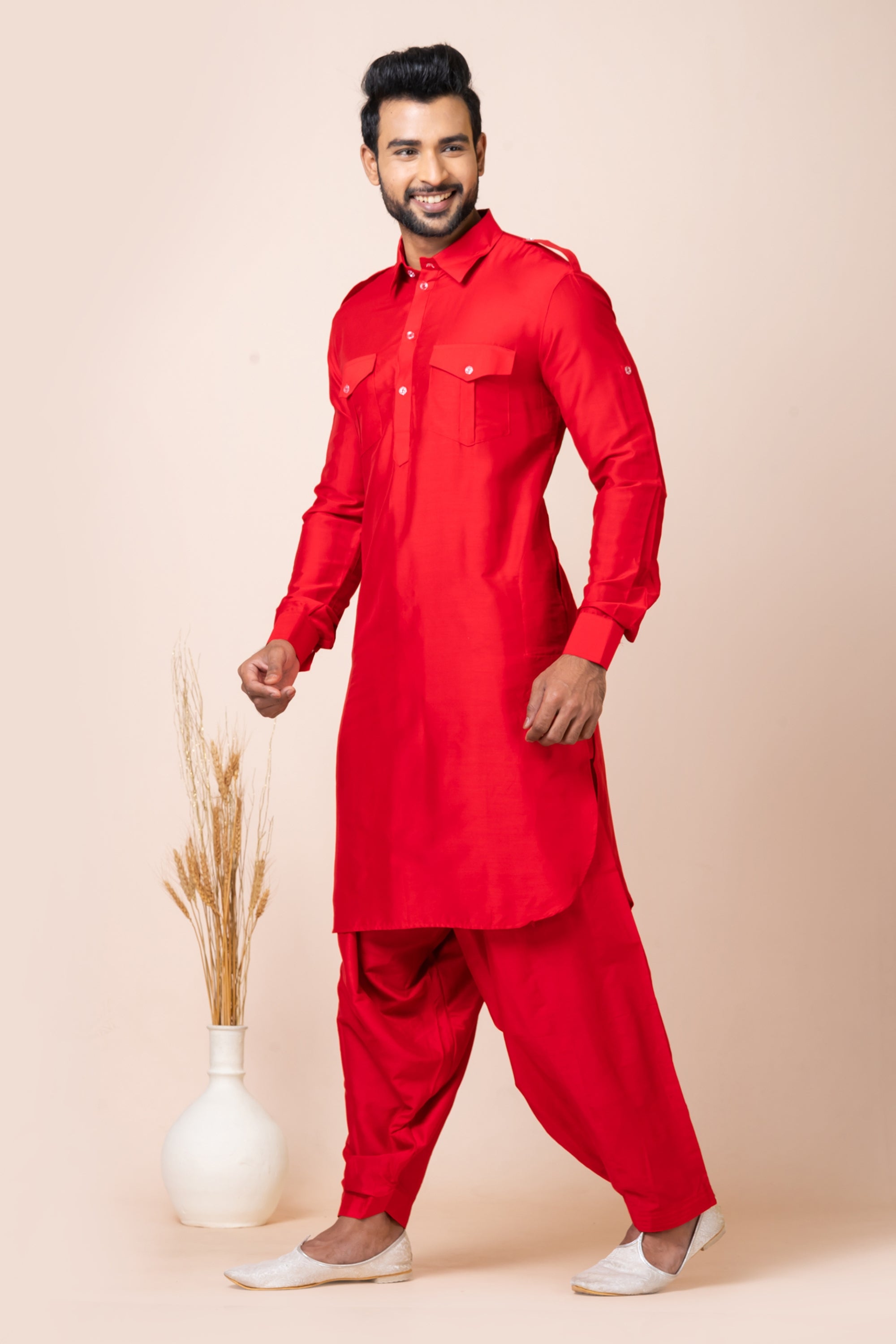Make a bold and stylish statement with this Handsome Red Color Viscose Pathani Kurta Pajama for Men, designed for men who love classic ethnic fashion with modern comfort. Crafted from premium quality viscose fabric, this Pathani suit offers a soft, breathable feel and a smooth finish, making it ideal for long festive and wedding celebrations. The kurta features a traditional Pathani collar, front button placket, shoulder detailing, and dual chest pockets, adding a sharp and masculine look. Paired with a matching pajama, this outfit delivers a complete traditional appearance suitable for weddings, festivals, engagement ceremonies, parties, and cultural functions. The rich red color symbolizes celebration and elegance, making it perfect for special occasions like weddings, Diwali, Eid, and family events.