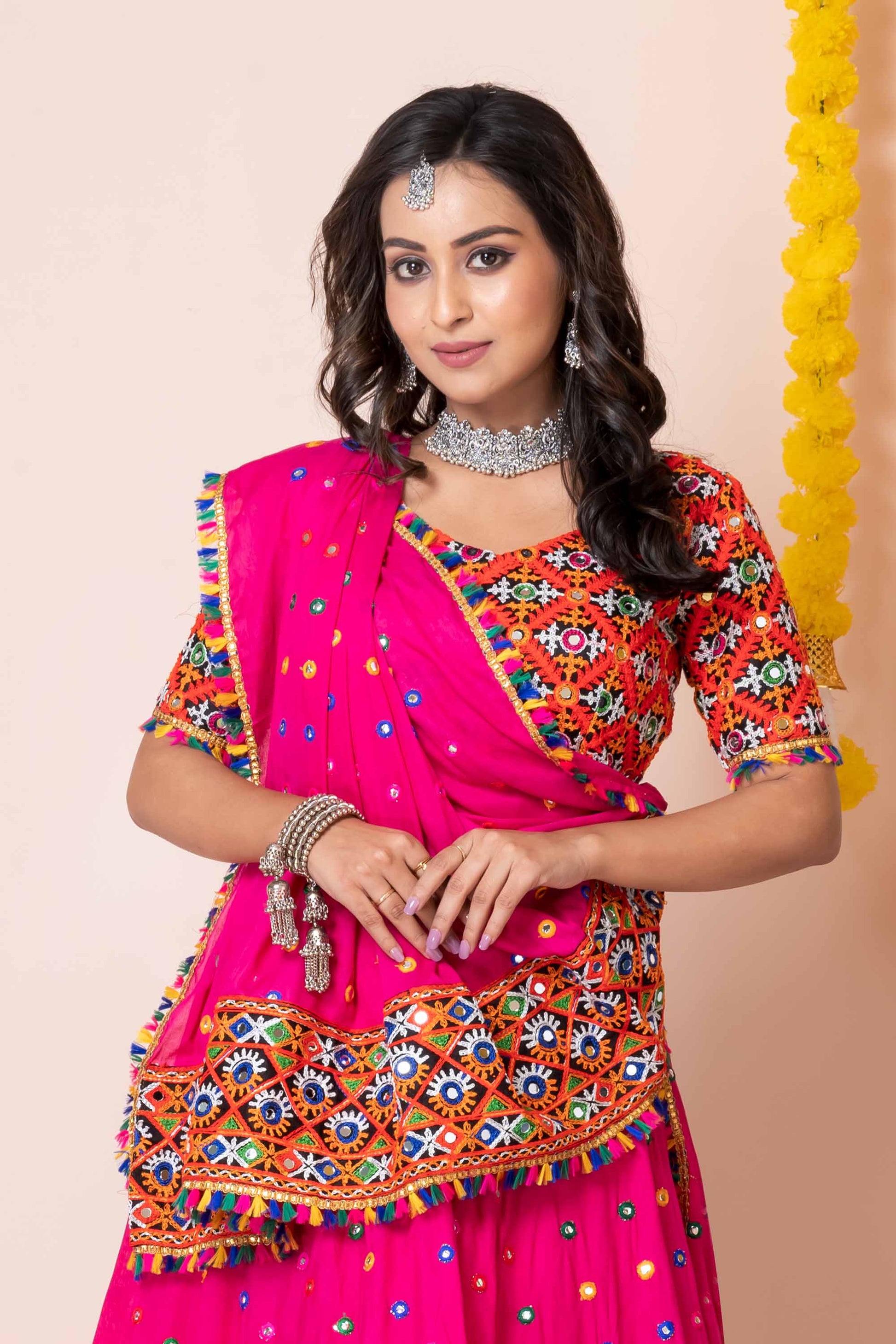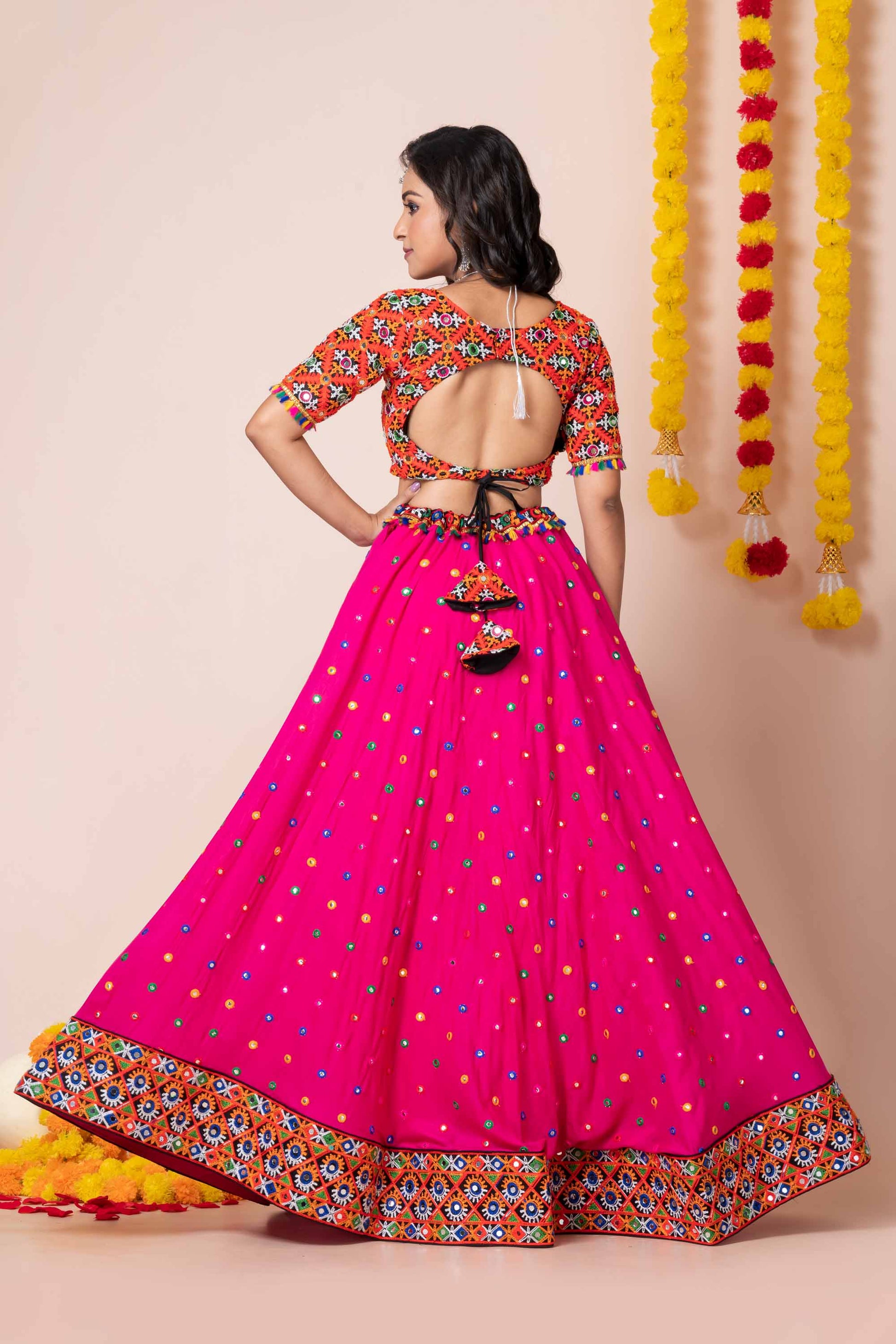 Hot Pink Navratri Lehenga Choli with Multicolor Mirror and Thread Embroidery for Garba