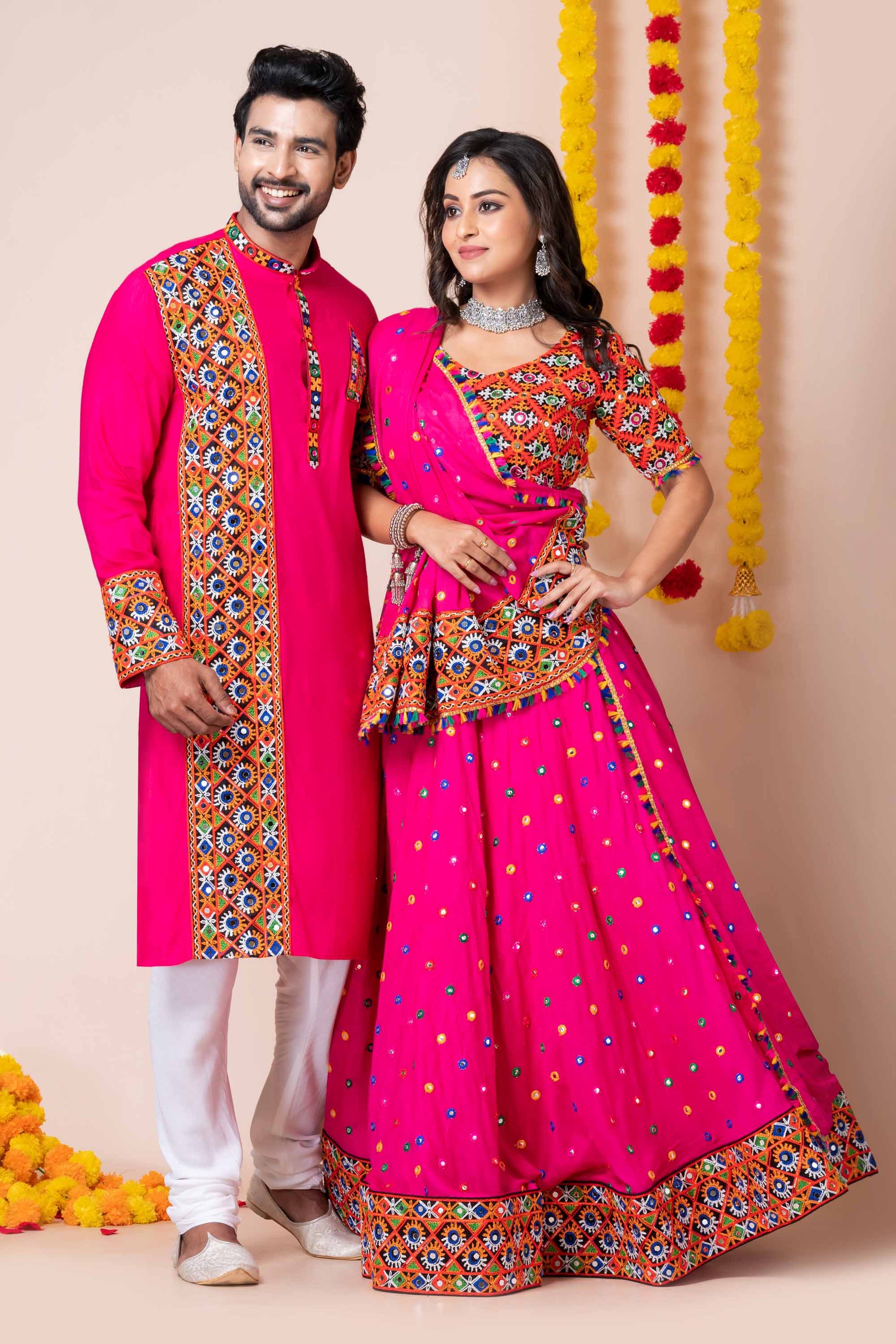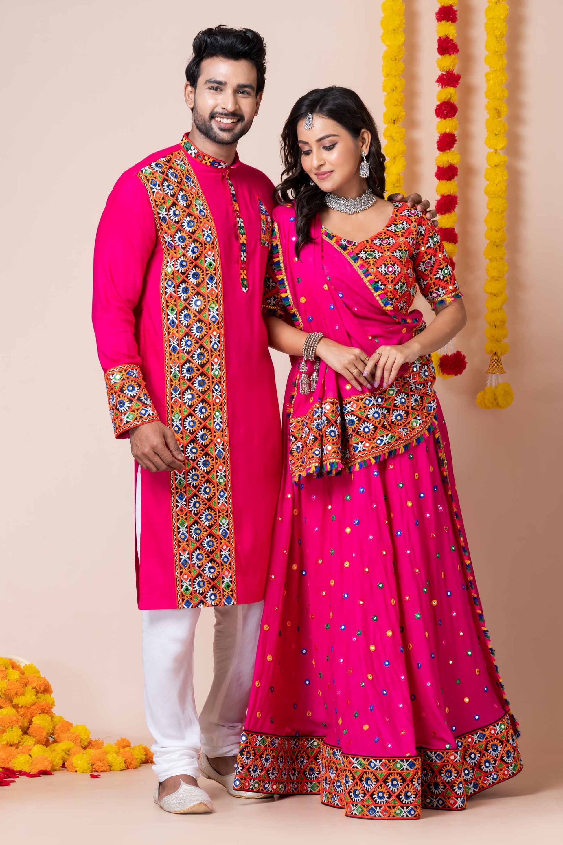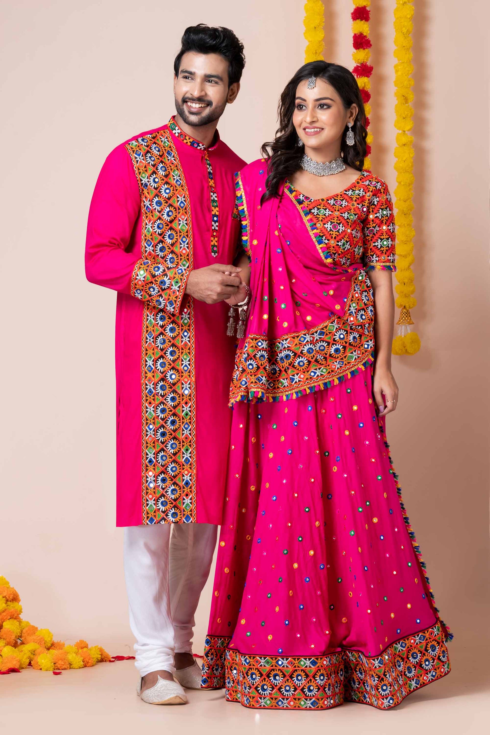 Celebrate the vibrant spirit of Navratri with this Hot Pink Rayon Couple Outfit, beautifully adorned with traditional multicolor Kutchi mirror and thread embroidery. This coordinated ethnic set includes a stunning lehenga choli for women and a matching kurta for men, both designed in rich rayon fabric that ensures comfort and elegance. The intricate handwork and dazzling mirror embellishments reflect the essence of Gujarati Garba nights and Dandiya festivities. Perfect for festive celebrations, this couple’s outfit brings together style and tradition, making it an ideal choice for Navratri nights, themed parties, or cultural events. Stand out together and spread festive joy with this eye-catching matching ensemble.