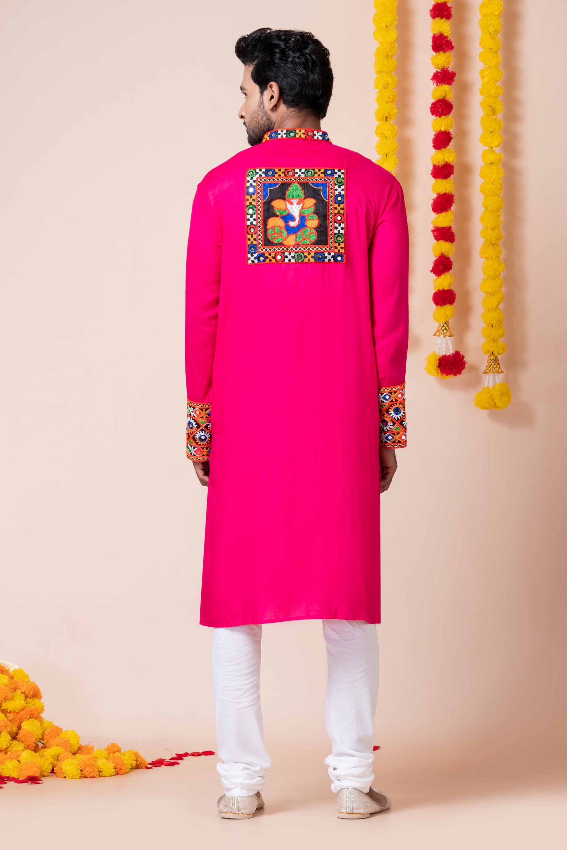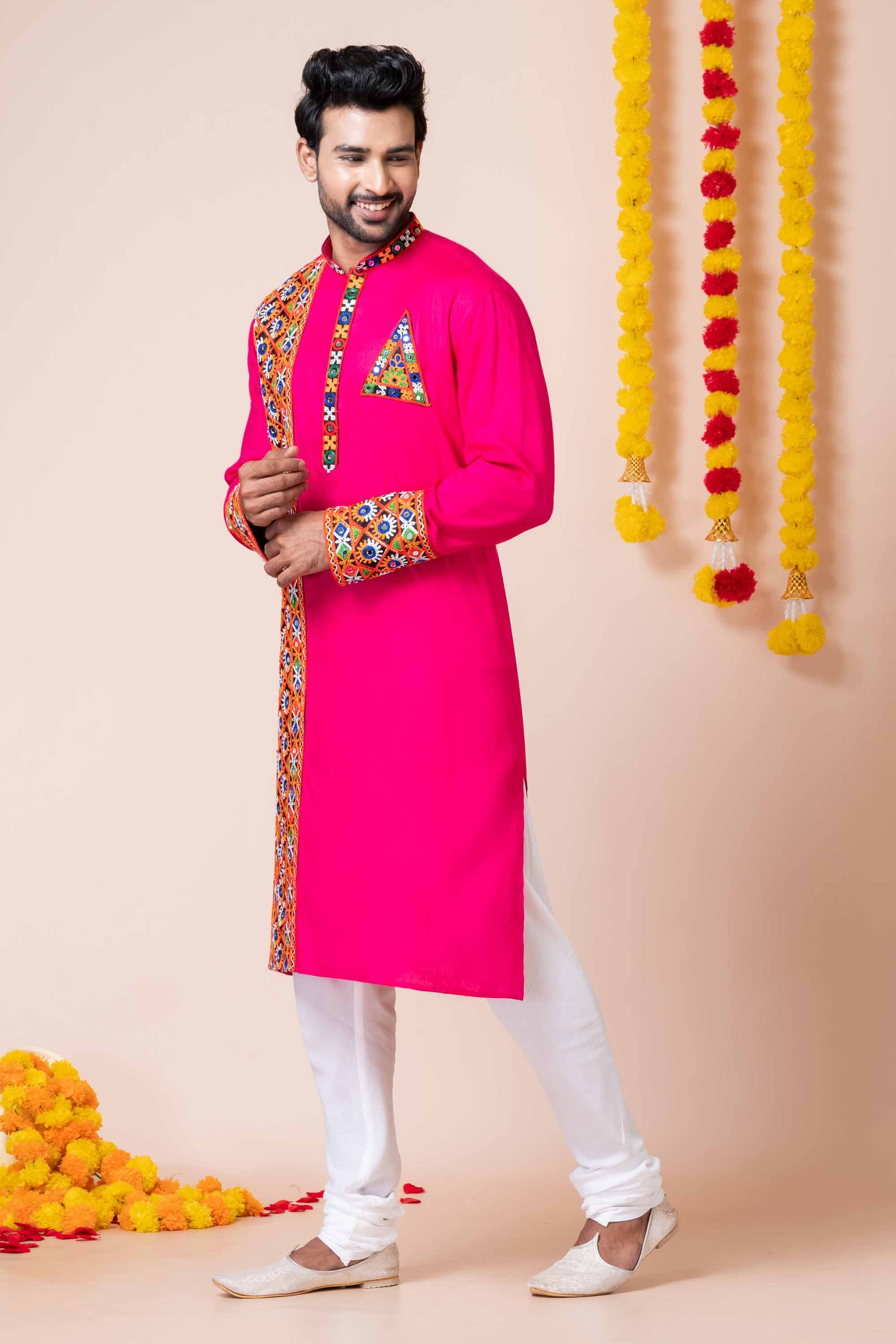 Celebrate the spirit of Navratri in vibrant style with our Hot Pink Rayon Kurta, beautifully embellished with multicolor mirror embroidery. Crafted from premium rayon fabric, this kurta offers a perfect blend of comfort and traditional elegance. The intricate mirror and thread work along the placket, cuffs, and side panel add a festive charm, ideal for Garba nights and Dandiya celebrations. The straight-cut silhouette paired with a band collar ensures a flattering and stylish look for men. Pair it with white churidar or pyjama for a complete traditional ensemble.
