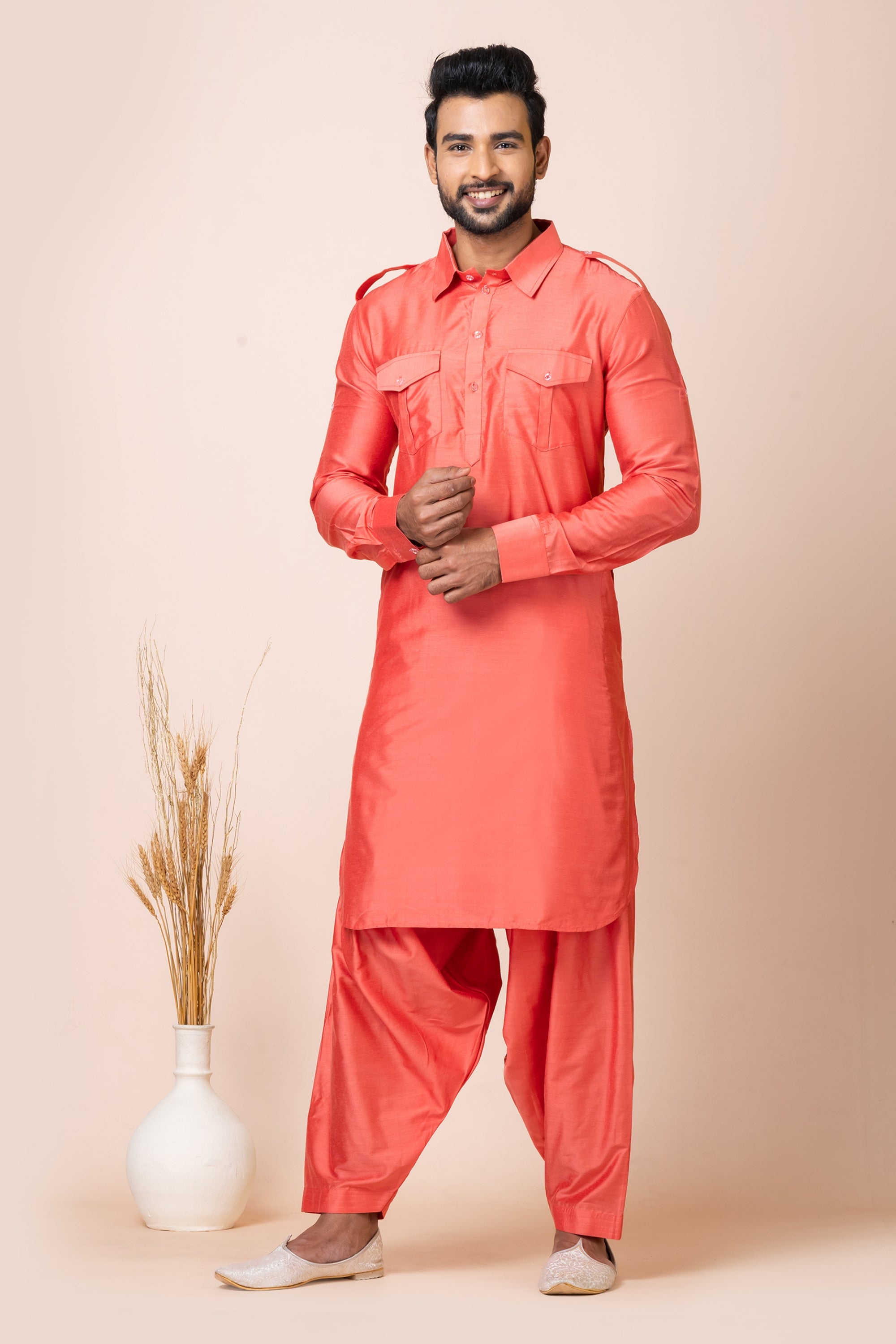 Impressive Orange Color Viscose Pathani Kurta Pajama for Men