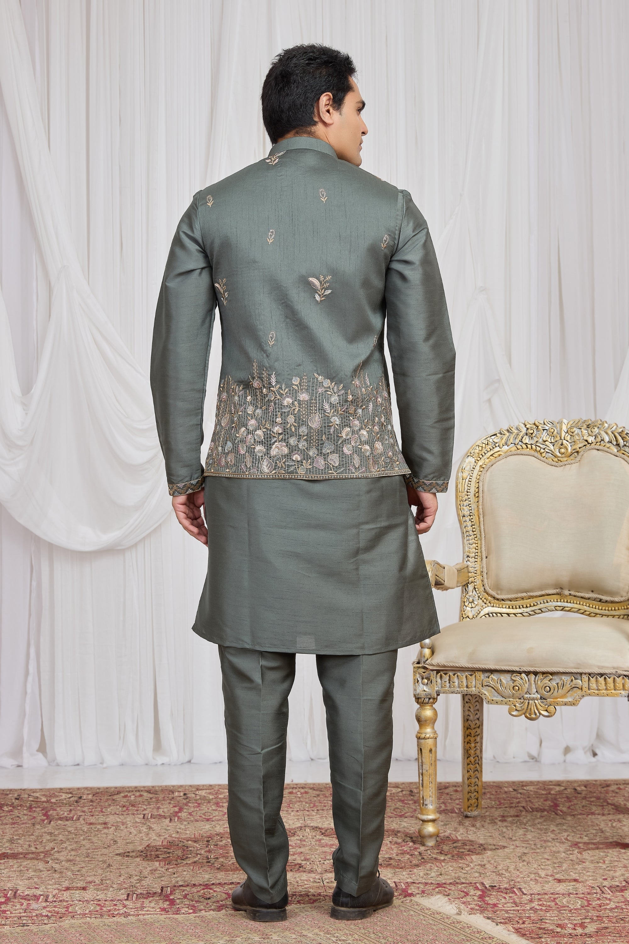 Enhance your traditional wardrobe with this Invaluable Olive Green Art Silk Embroidered Wedding Kurta Pyjama with Jacket for Men, designed to bring together classic ethnic style and modern sophistication. This refined outfit features a stylish olive green kurta paired with a matching pyjama and a beautifully embroidered jacket, creating a complete ethnic ensemble perfect for weddings and festive celebrations. Made from premium Art Silk fabric, this kurta set offers a rich texture, smooth finish, and comfortable fit suitable for long events. The intricate thread embroidery on the jacket adds a luxurious and royal appeal, making it an ideal choice for groomsmen, wedding guests, festive gatherings, receptions, and cultural functions.