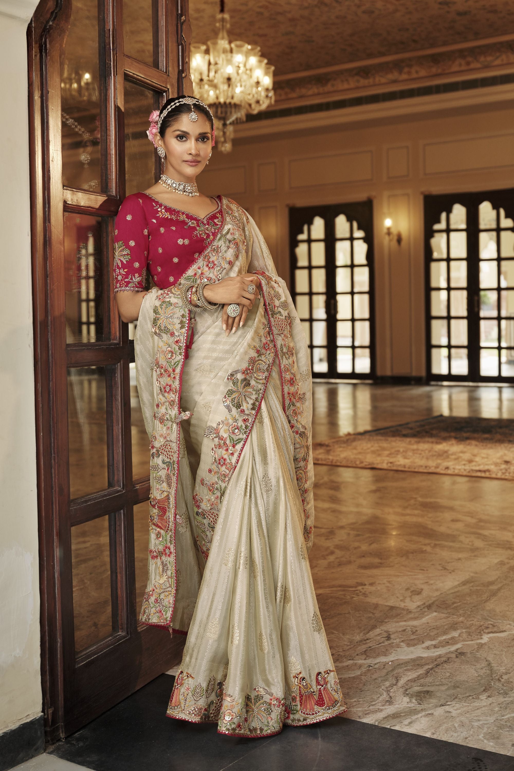 Ivory Cream Silk Blend Designer Saree Maroon Blouse And Embroidery Border