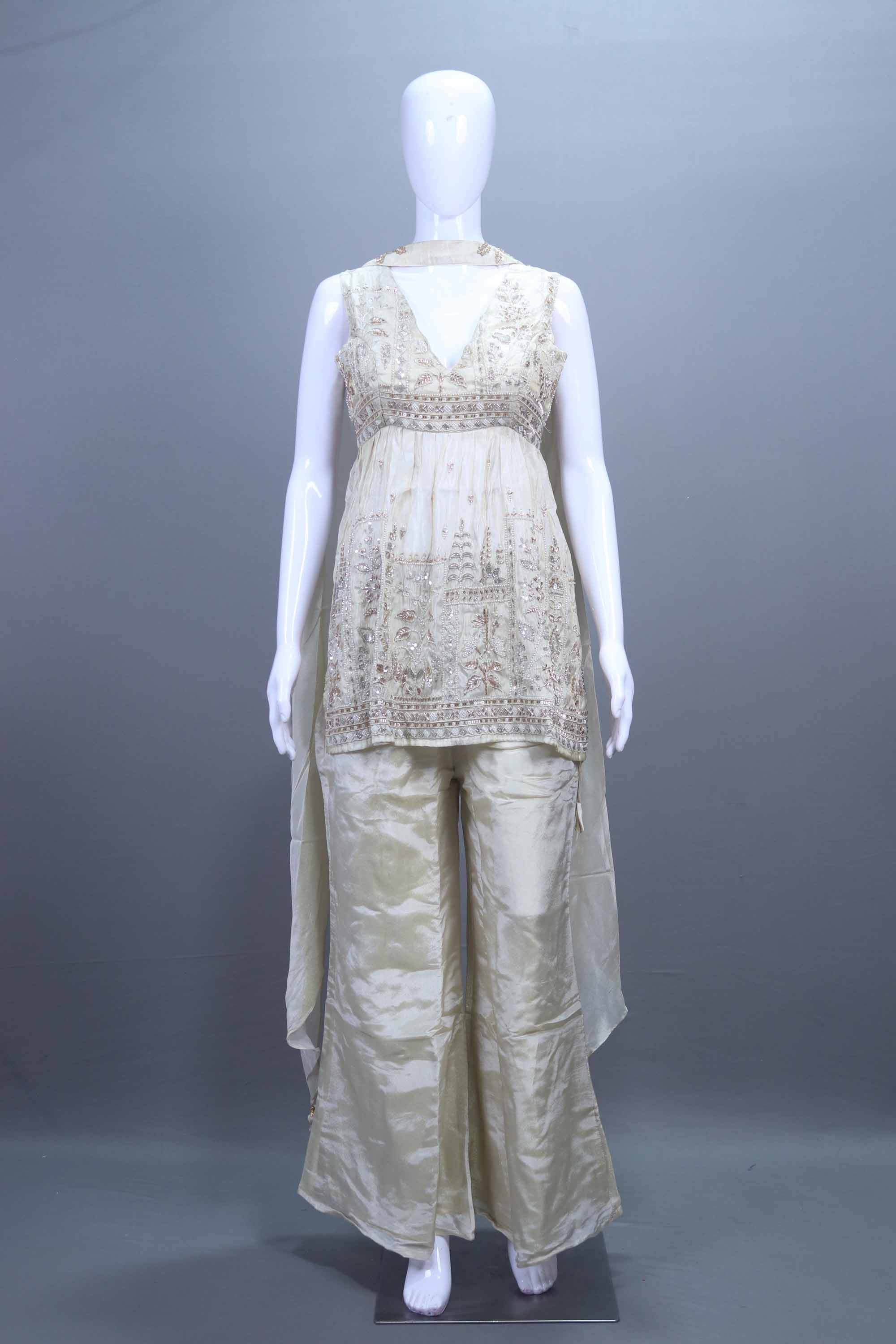 Upgrade your ethnic wardrobe with this elegant Ivory Embroidered Sharara Set with Designer Kurta and Dupatta , designed with intricate thread and sequin work. Featuring a sleeveless V-neck kurta paired with a flowy sharara bottom, this outfit delivers a modern yet traditional festive look. Made in a soft shiny fabric, it ensures comfort and sophistication at weddings, engagements, festive celebrations, haldi functions and special occasions. This designer ethnic set adds glamour with its beautiful detailing and flare, making it a perfect choice for parties and evening events.