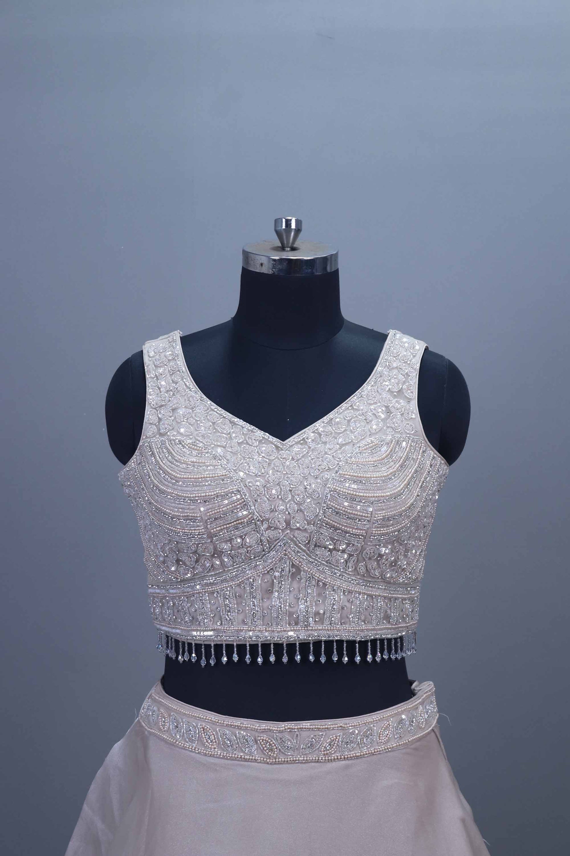 Radiate timeless elegance with this Ivory White Embellished Silk Lehenga Choli with Beaded Detailing , designed to make you shine at every occasion. The outfit features a beautifully hand-embroidered sleeveless blouse adorned with intricate bead, sequin, and pearl work, paired with a luxurious flared silk lehenga that adds grace and sophistication. The delicate beaded hemline on the blouse enhances its modern yet traditional appeal. Perfect for weddings, receptions, festive celebrations, and special parties, this lehenga choli set exudes subtle glamour and refined craftsmanship. Lightweight, elegant, and comfortable — it’s the ideal choice for those who love understated luxury.