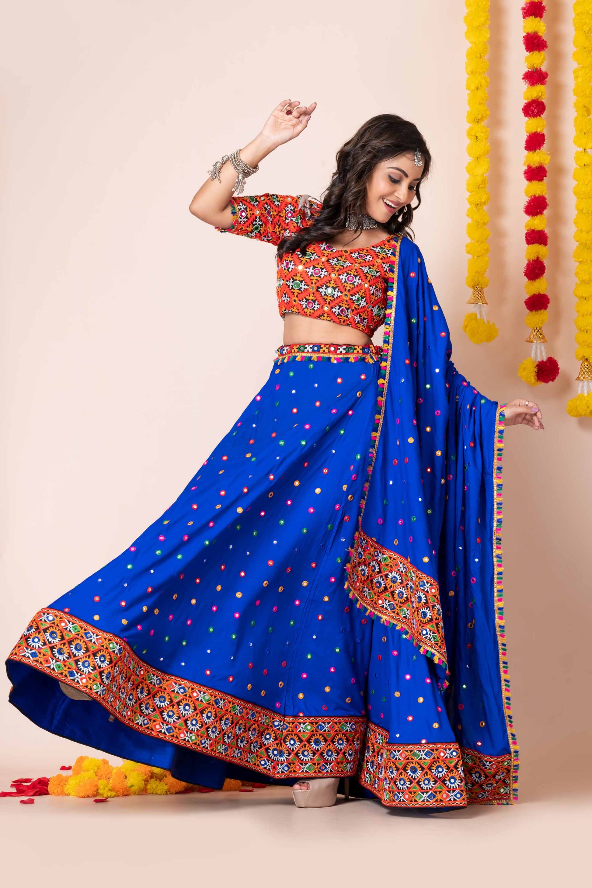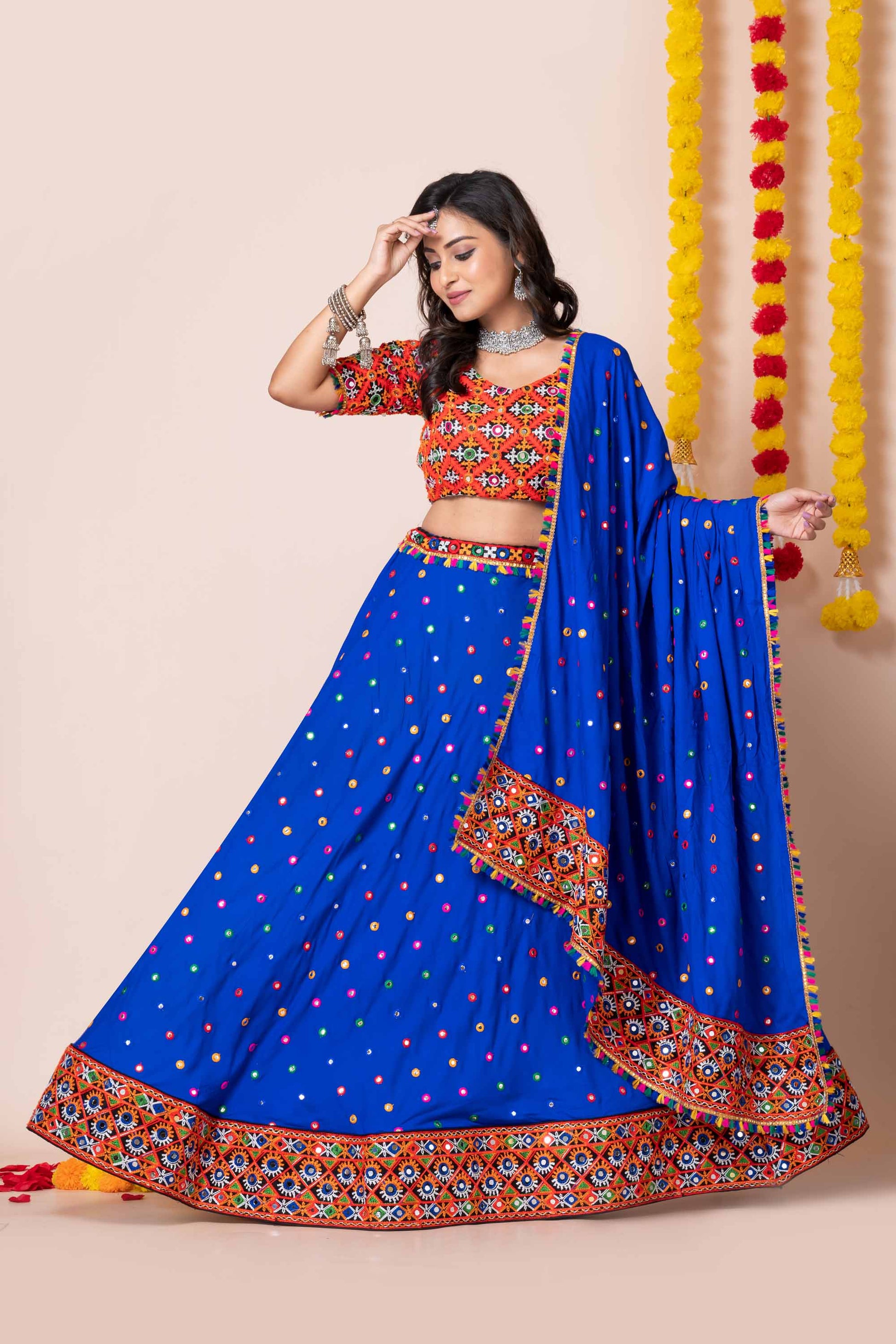 Step into festive elegance with this Royal Blue Lehenga Choli set, crafted with intricate multicolor mirror embroidery and vibrant detailing. The lehenga features a flared silhouette with traditional embroidery on the border, paired with a beautifully designed embroidered blouse and a matching traditional dupatta. Perfect for Navratri, weddings, garba nights, and festive occasions, this lehenga choli set is designed to give you a stunning ethnic look with a modern touch.