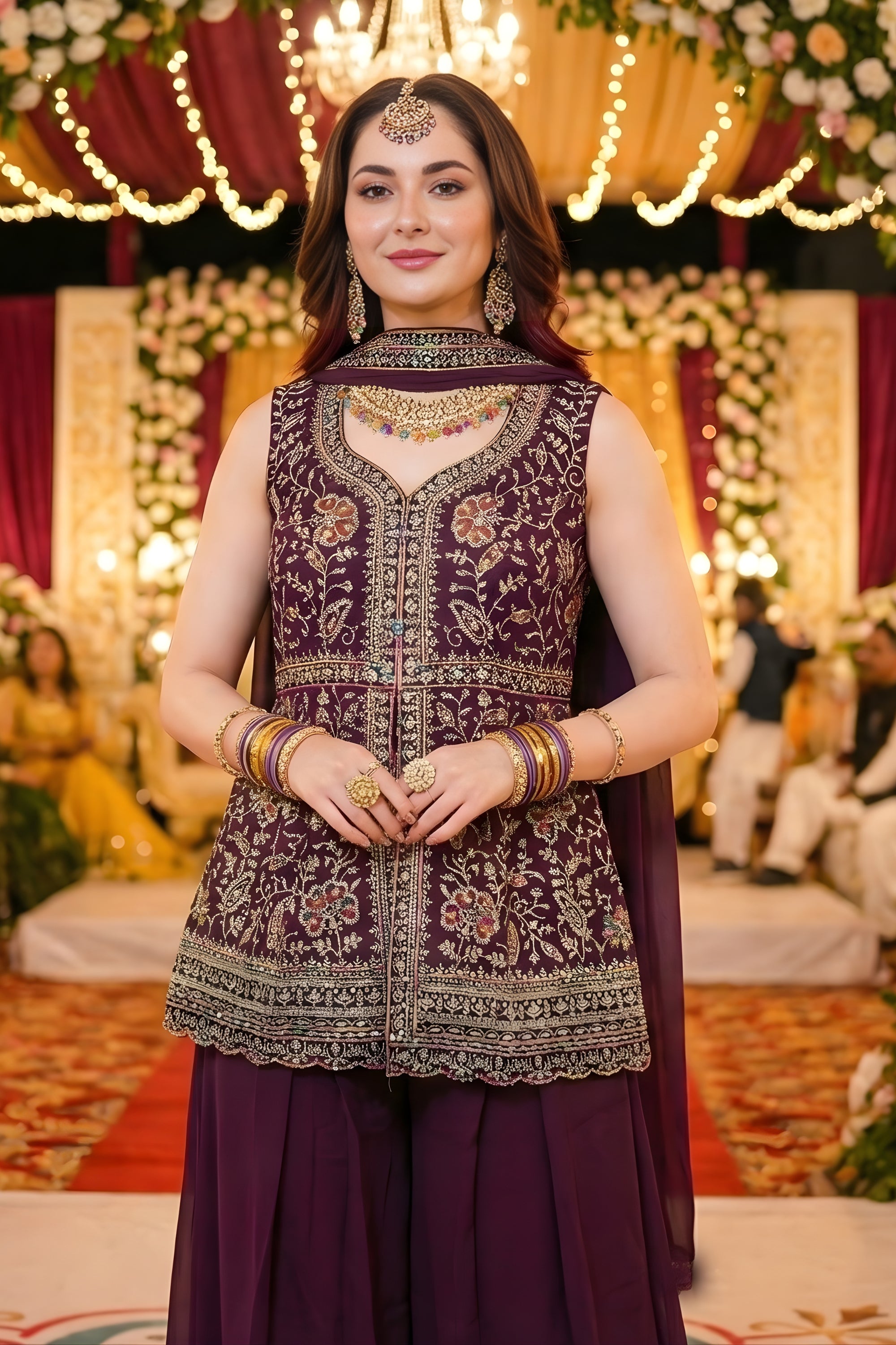 Step into timeless elegance with this Latest wine embroidered georgette sharara suit, designed to make you stand out at weddings and grand festive occasions. Crafted in rich wine-colored georgette, this ensemble features exquisite traditional embroidery that reflects royal Nawabi charm. The beautifully structured sleeveless kurta is adorned with intricate floral and zari embroidery, offering a luxurious ethnic appeal. Paired with a flowy georgette sharara bottom, the outfit creates a graceful silhouette with effortless movement. The matching dupatta completes the look, adding sophistication and balance to the ensemble.