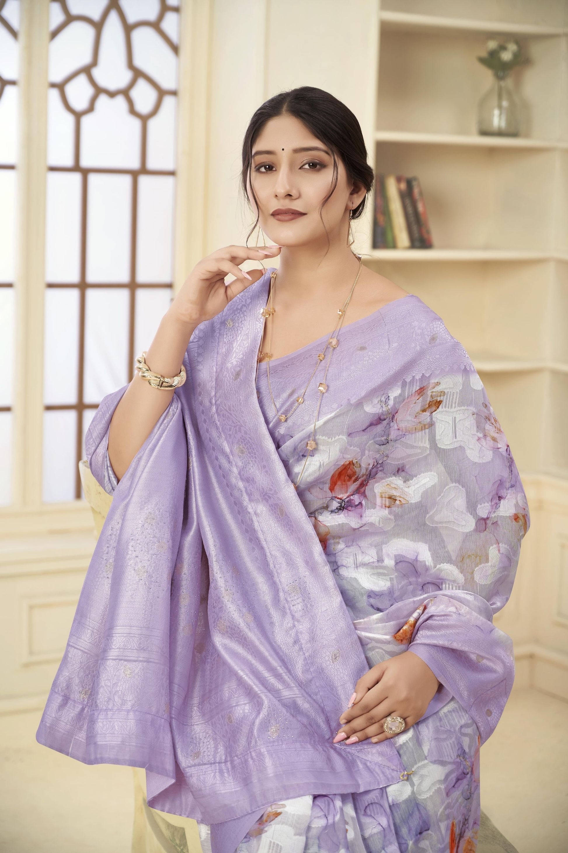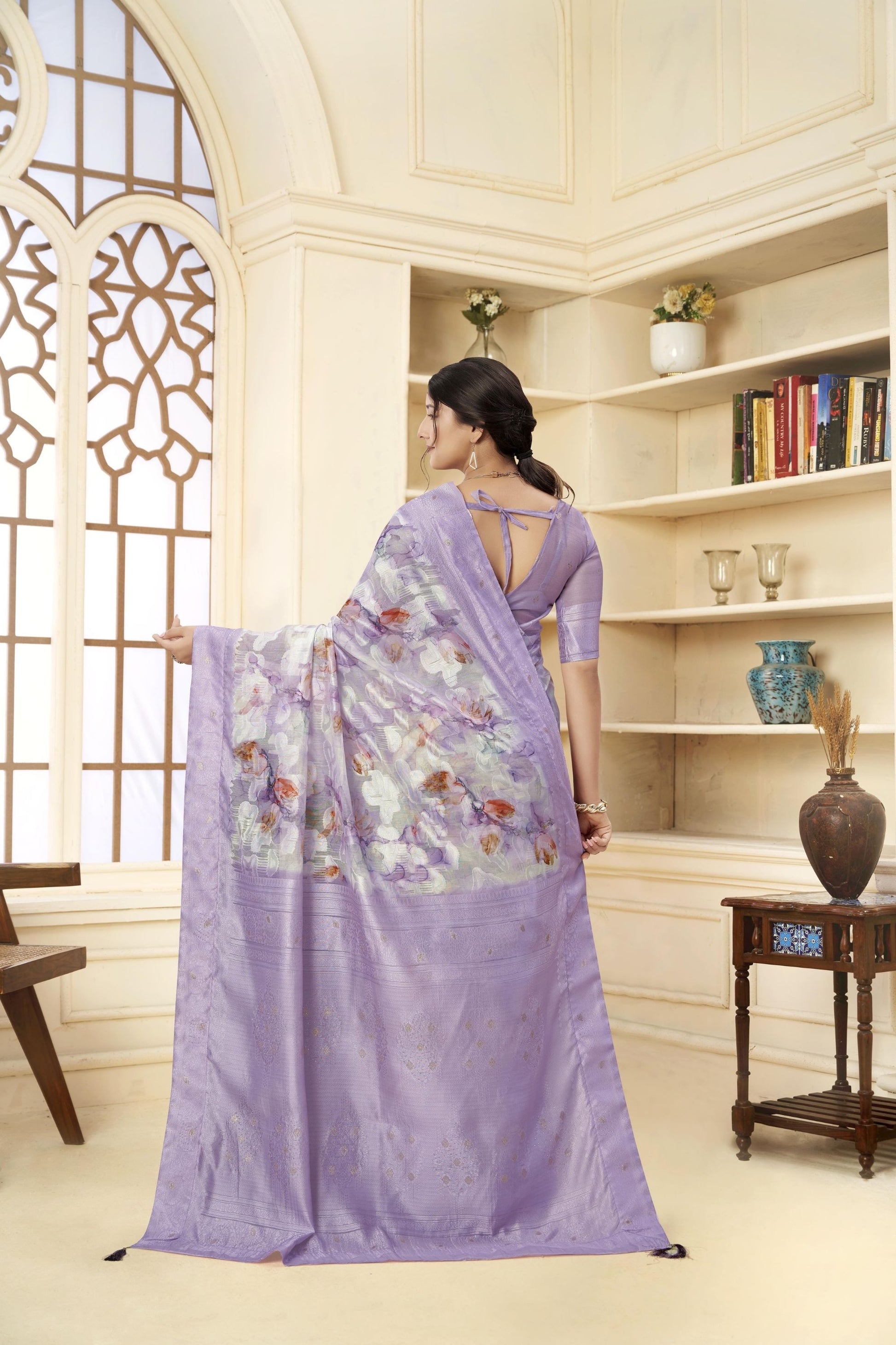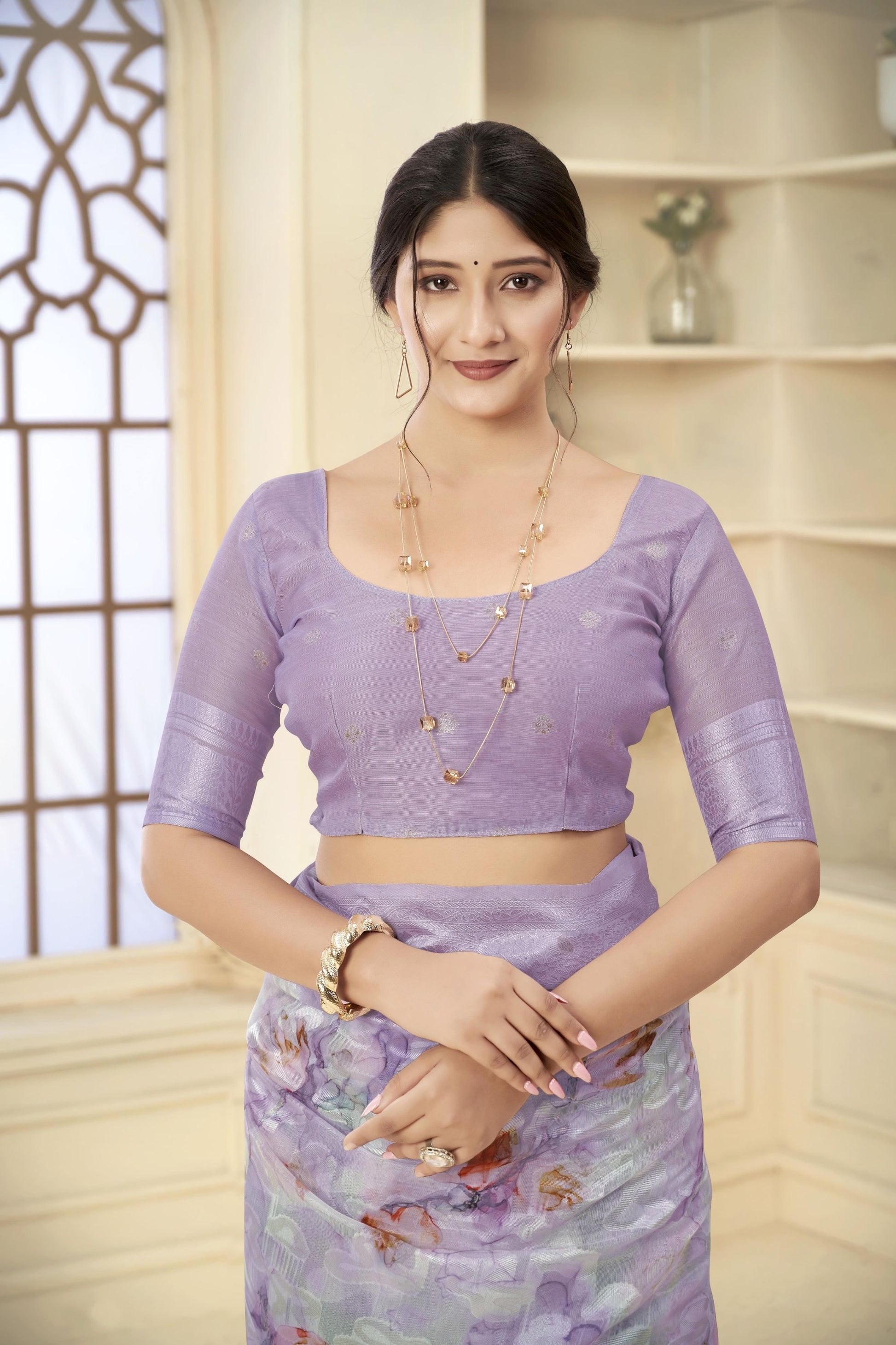 Lavender Floral Printed Linen Silk Saree with Subtle Zari Detailing and Blouse Piece
