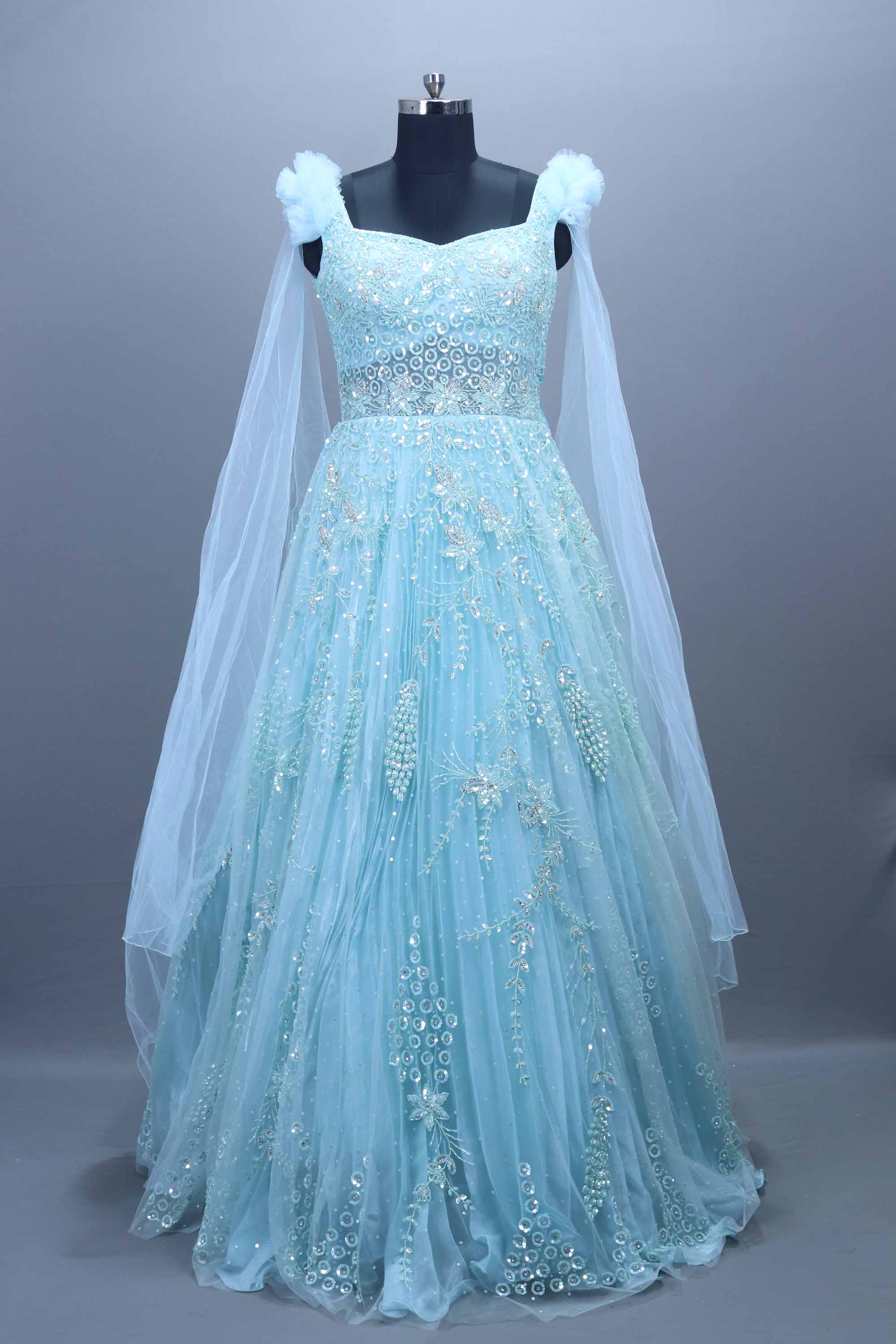 Elevate your special-occasion look with this stunning Light Blue Heavy Net Gown Mirror Work Party Wear Ball Gown crafted to make every moment unforgettable. Designed with exquisite mirror work, delicate sequins, and floral thread embroidery, this ball gown blends elegance with modern charm. The soft net fabric offers a graceful flow, while the beautifully embellished bodice and flare create a true princess silhouette. Perfect for weddings, receptions, engagements, sangeet, birthday parties, proms, and festive celebrations, this gown ensures you stand out with sophistication. The attached draped sleeves add a dreamy, fairy-tale touch, making it the ideal choice for women and girls who love glamorous fashion.