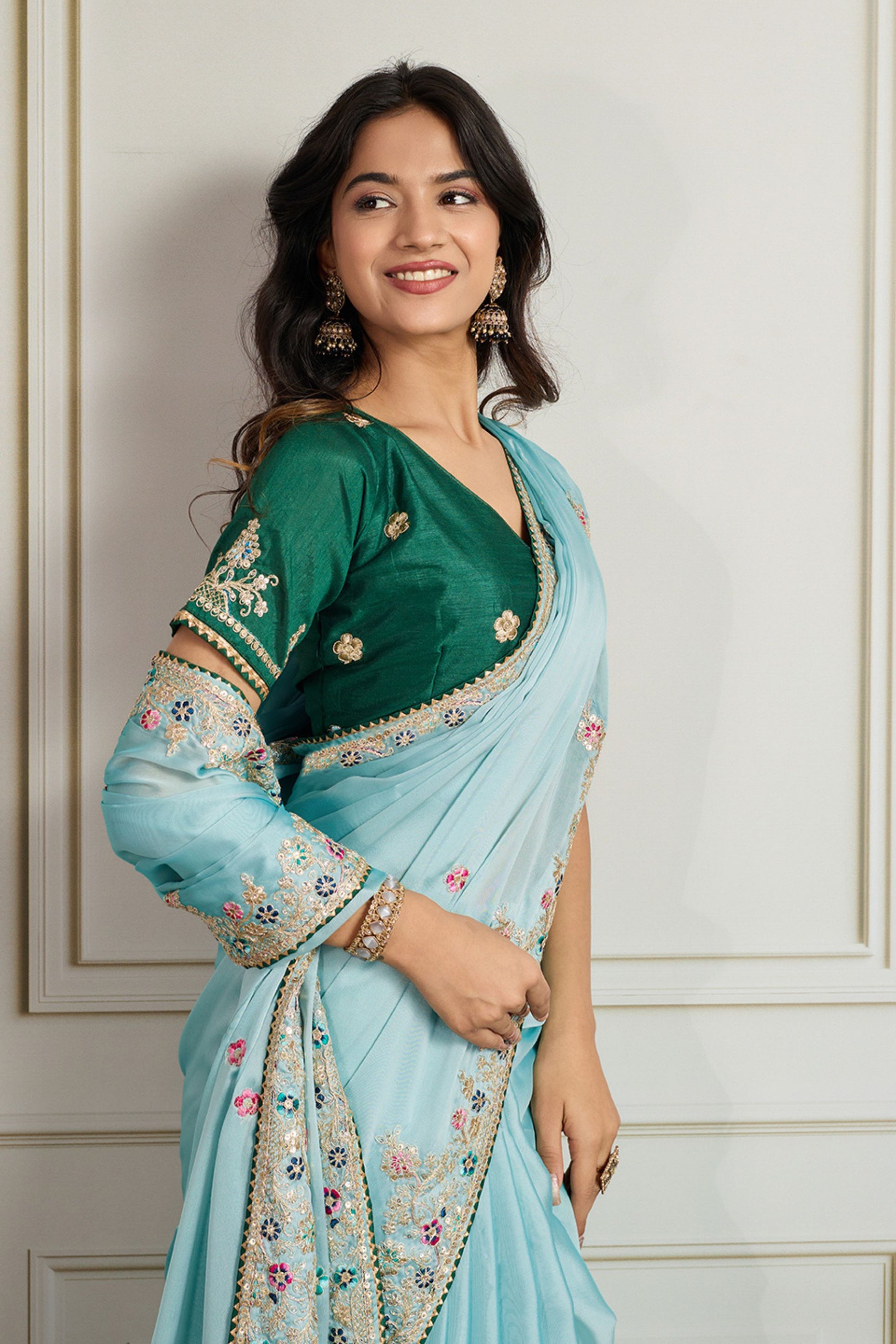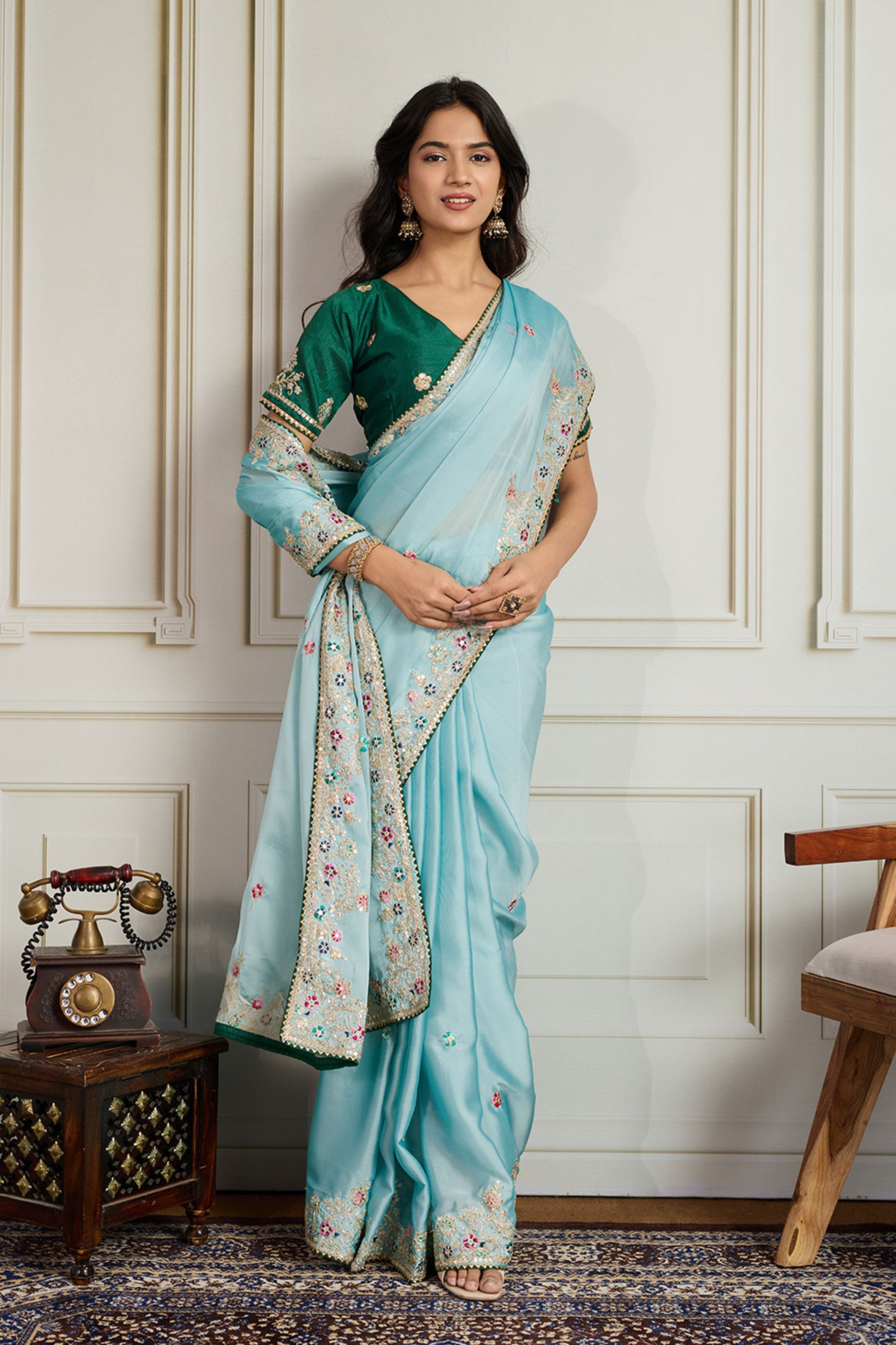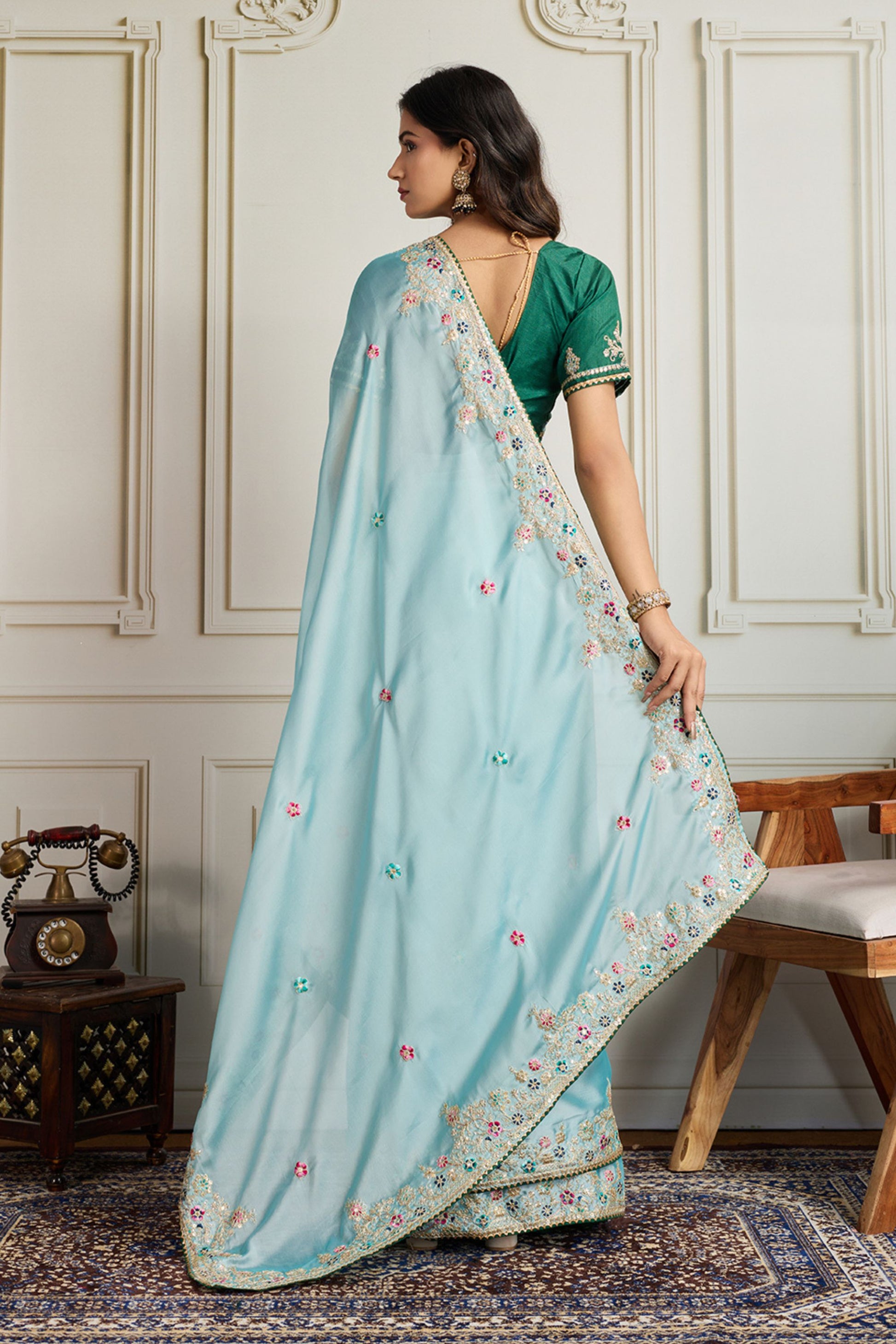 Light Blue Saree with Green Blouse Designer Party Wear Silk Saree