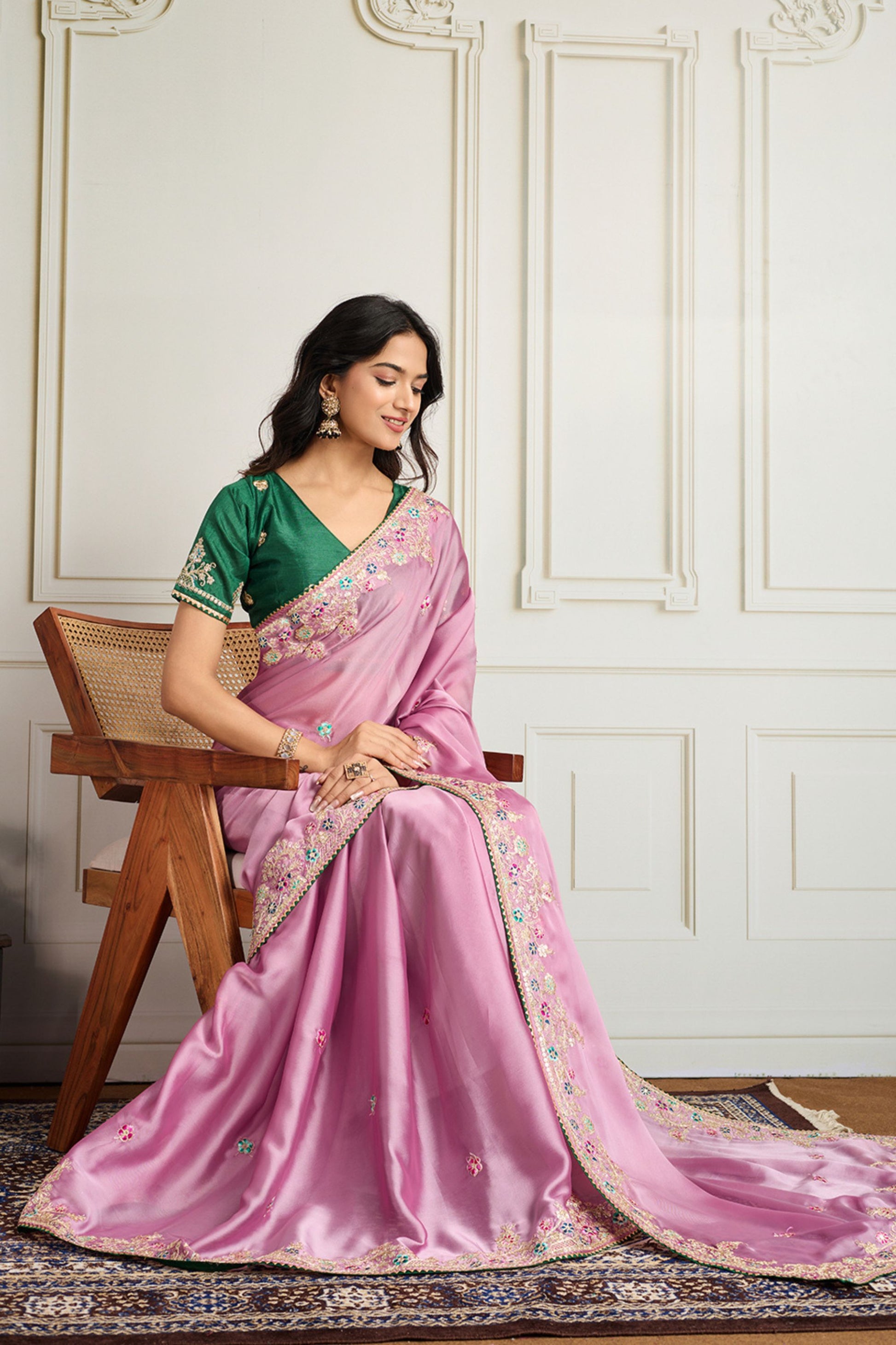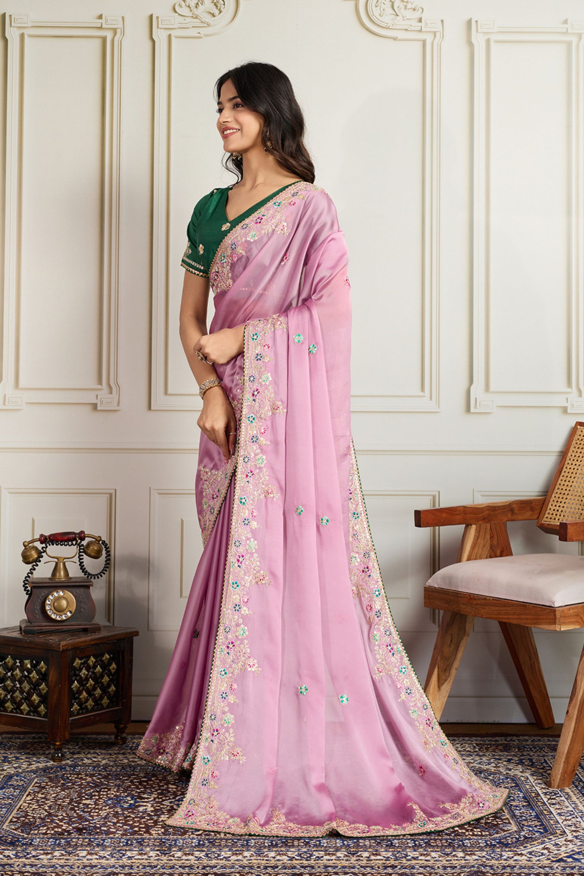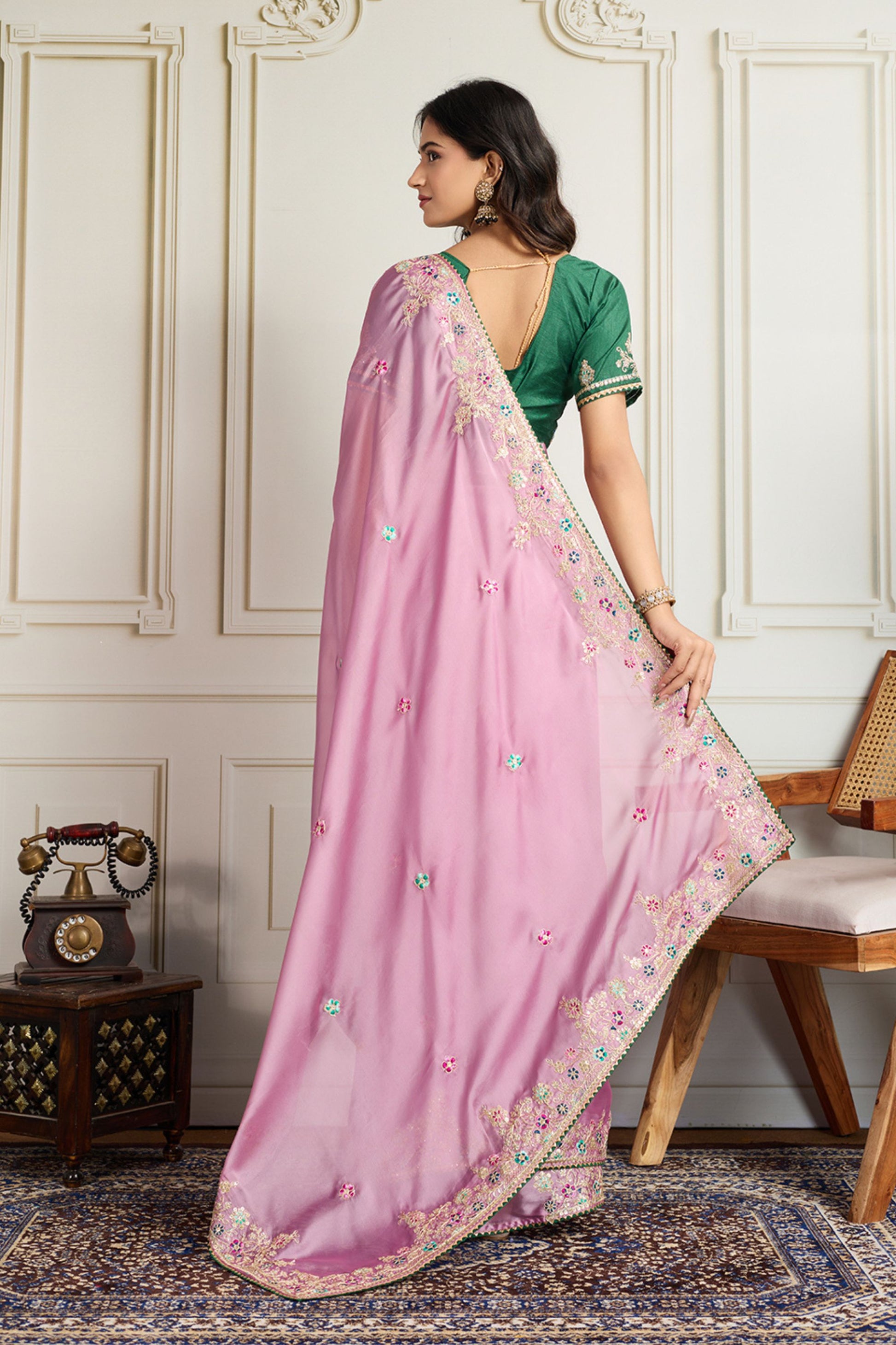 Light Pink Saree with Green Blouse Designer Party Wear Silk Saree