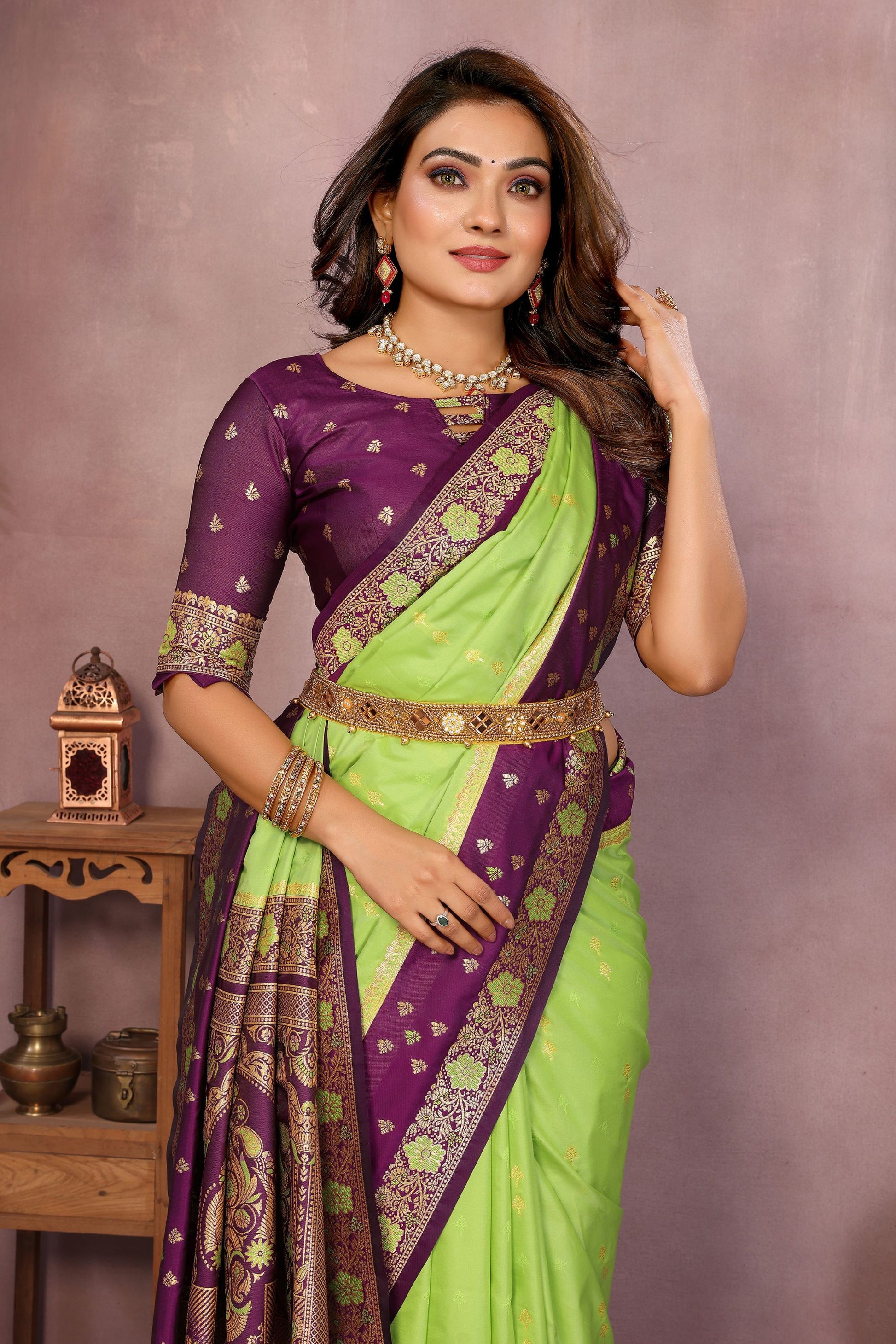 Lime Green Silk Blend Saree with Purple Zari Woven Border Rich Pallu