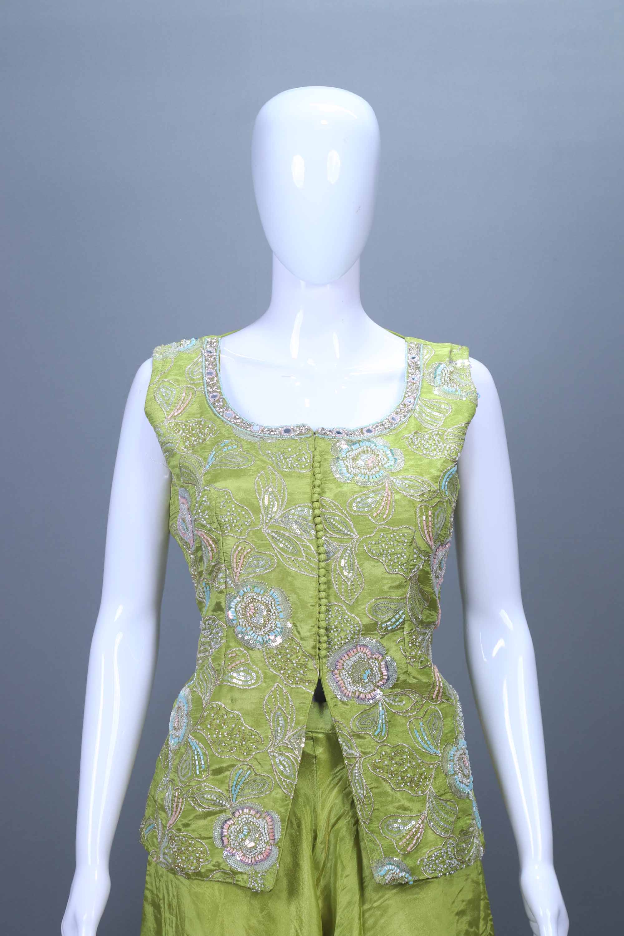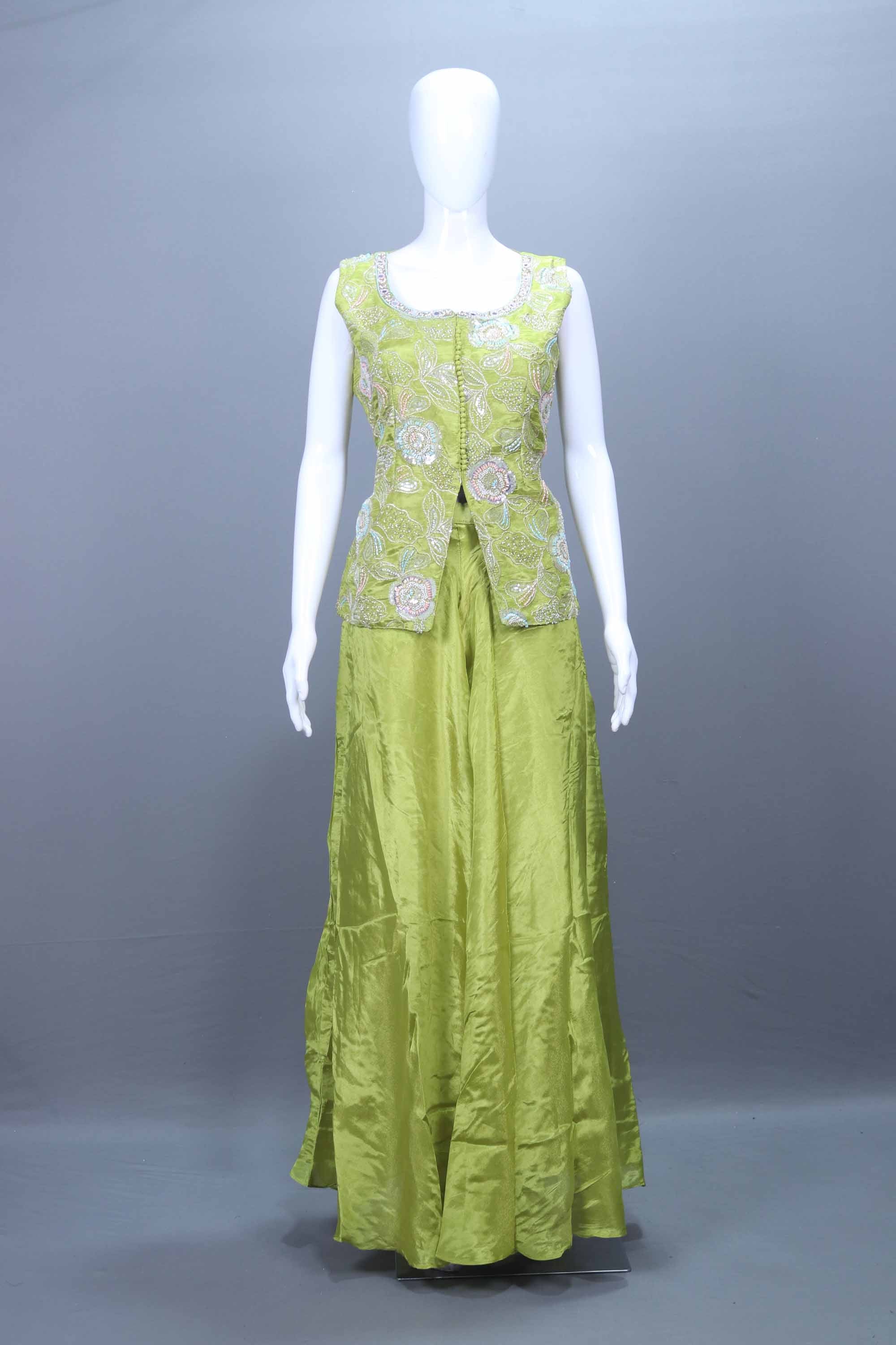 Lime Yellow Embroidered Silk Palazzo Set with Matching Dupatta
