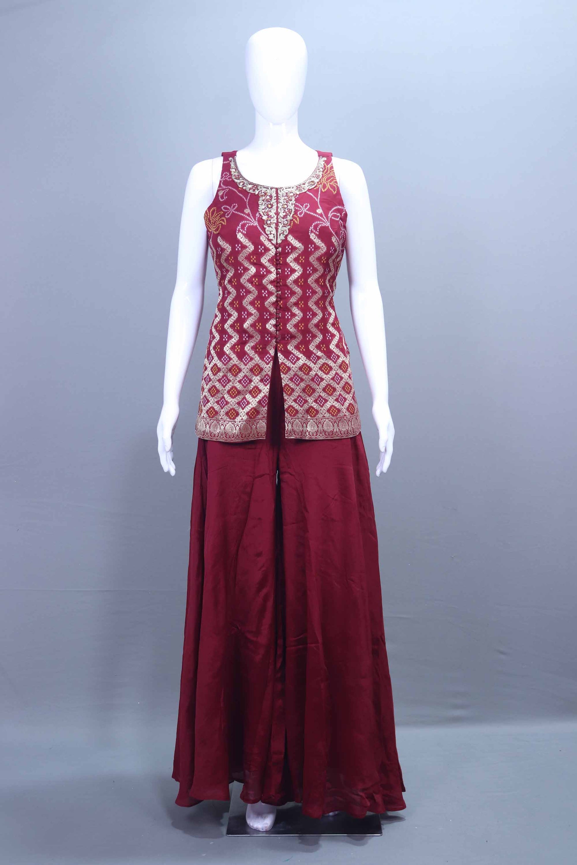 Maroon Embroidered Sleeveless Kurti with Flared Sharara Pants