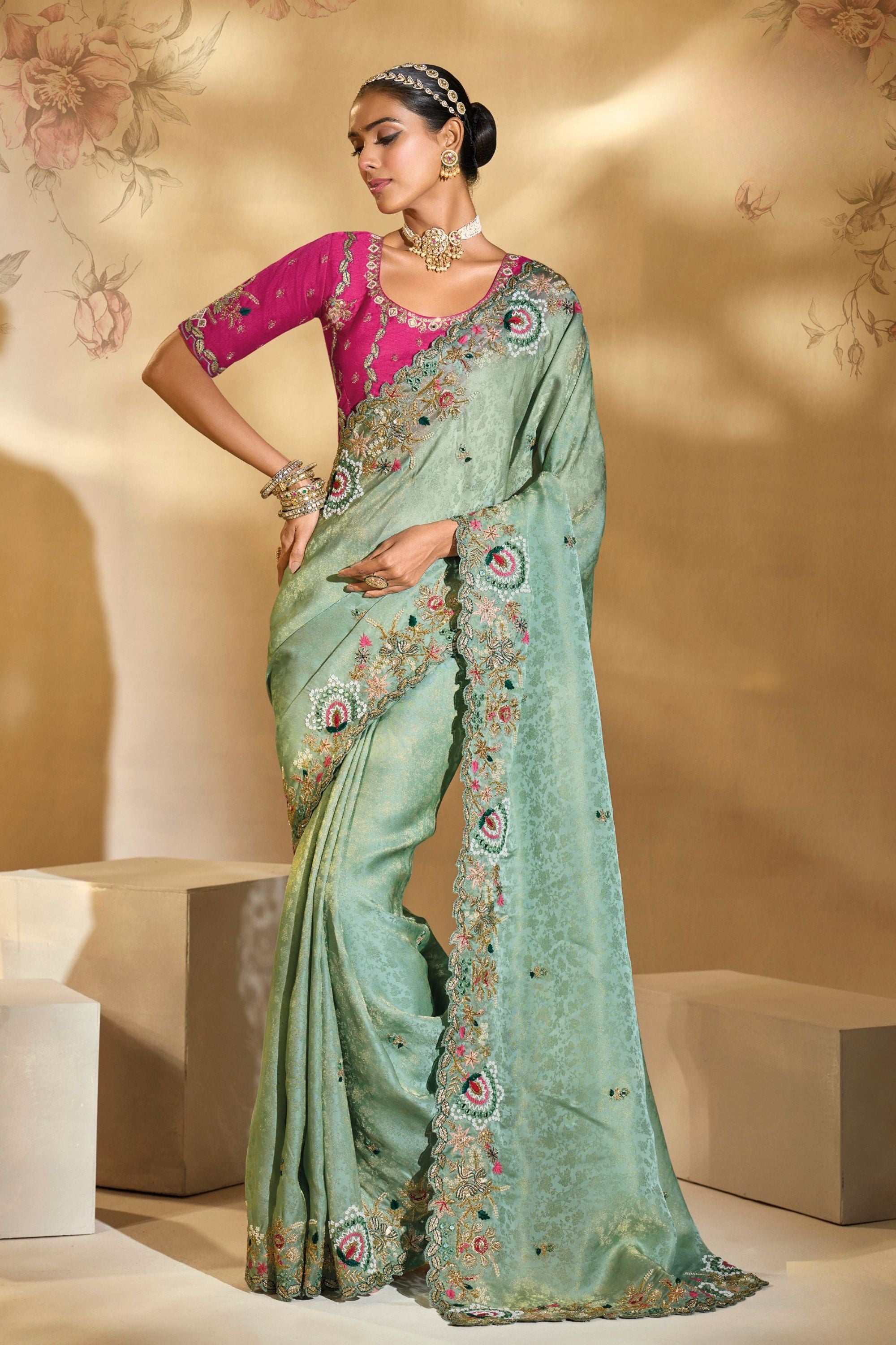 tep into timeless elegance with this Mint Green Banarasi Silk Saree Contrast Magenta Blouse exquisitely crafted with intricate floral zari embroidery and delicate threadwork. The luxurious silk fabric shimmers beautifully, while the scalloped embroidered border adds a touch of regal sophistication. Paired with a contrasting magenta blouse featuring rich embroidery, this saree perfectly balances tradition with contemporary charm. Ideal for weddings, festive occasions, and grand celebrations, this designer saree enhances your ethnic wardrobe with its graceful drape and detailed craftsmanship. Flaunt your refined taste and royal aura in this premium Banarasi silk saree that celebrates Indian artistry.