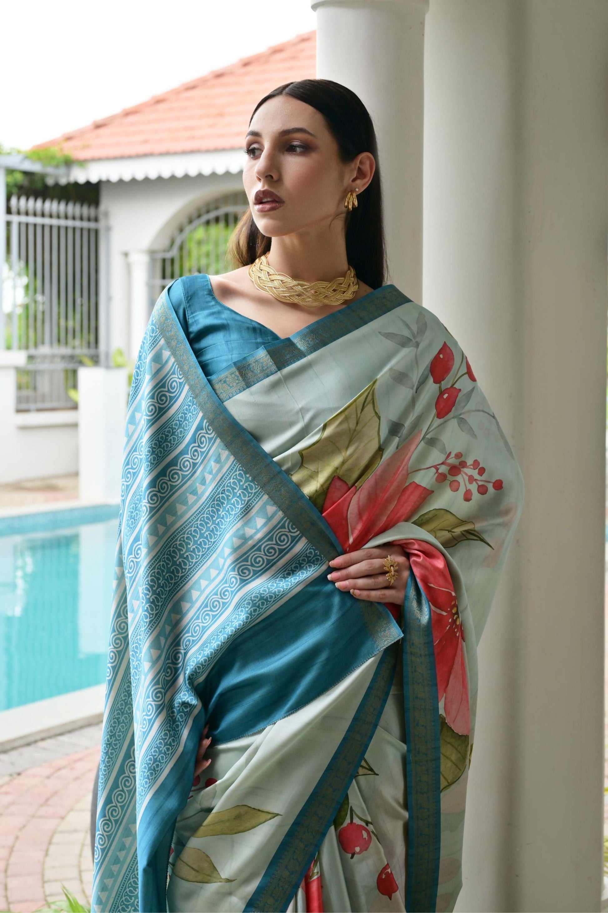 Add effortless elegance to your ethnic collection with this Mint Green Floral Printed Silk Blend Saree with Blue Woven Border, designed for women who love refined, contemporary Indian fashion. Crafted from a smooth silk-blend fabric, this saree offers a soft, lightweight drape with a subtle natural sheen, making it comfortable for all-day wear. The saree is adorned with graceful floral prints in soothing tones, beautifully complemented by a contrasting blue woven border that enhances its overall sophistication. The refreshing mint green color brings a calm, modern appeal, making it an excellent choice for festive gatherings, daytime events, parties, cultural functions, and elegant casual occasions.