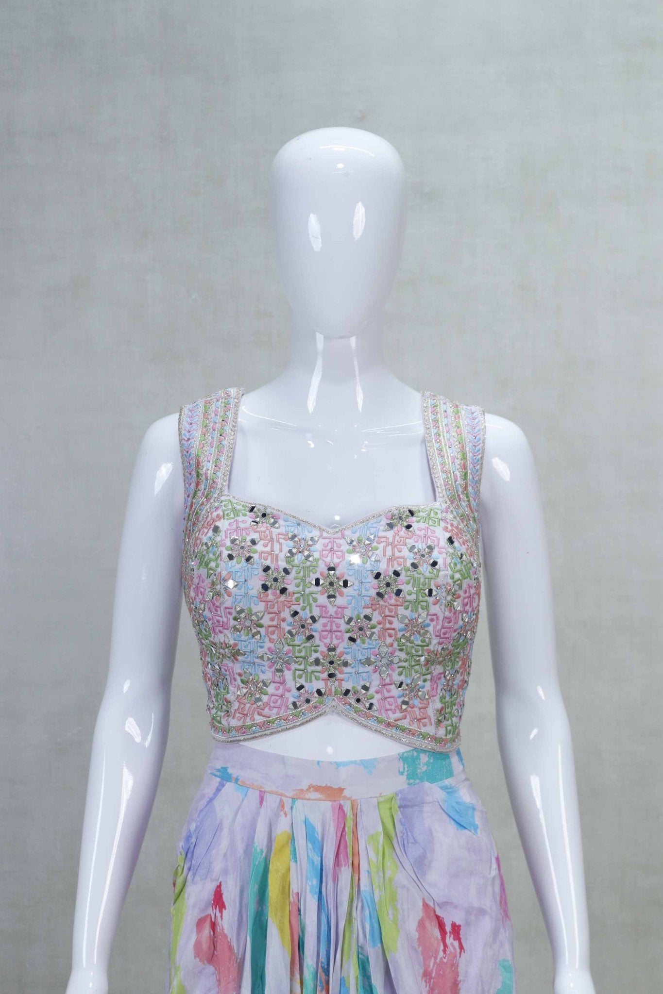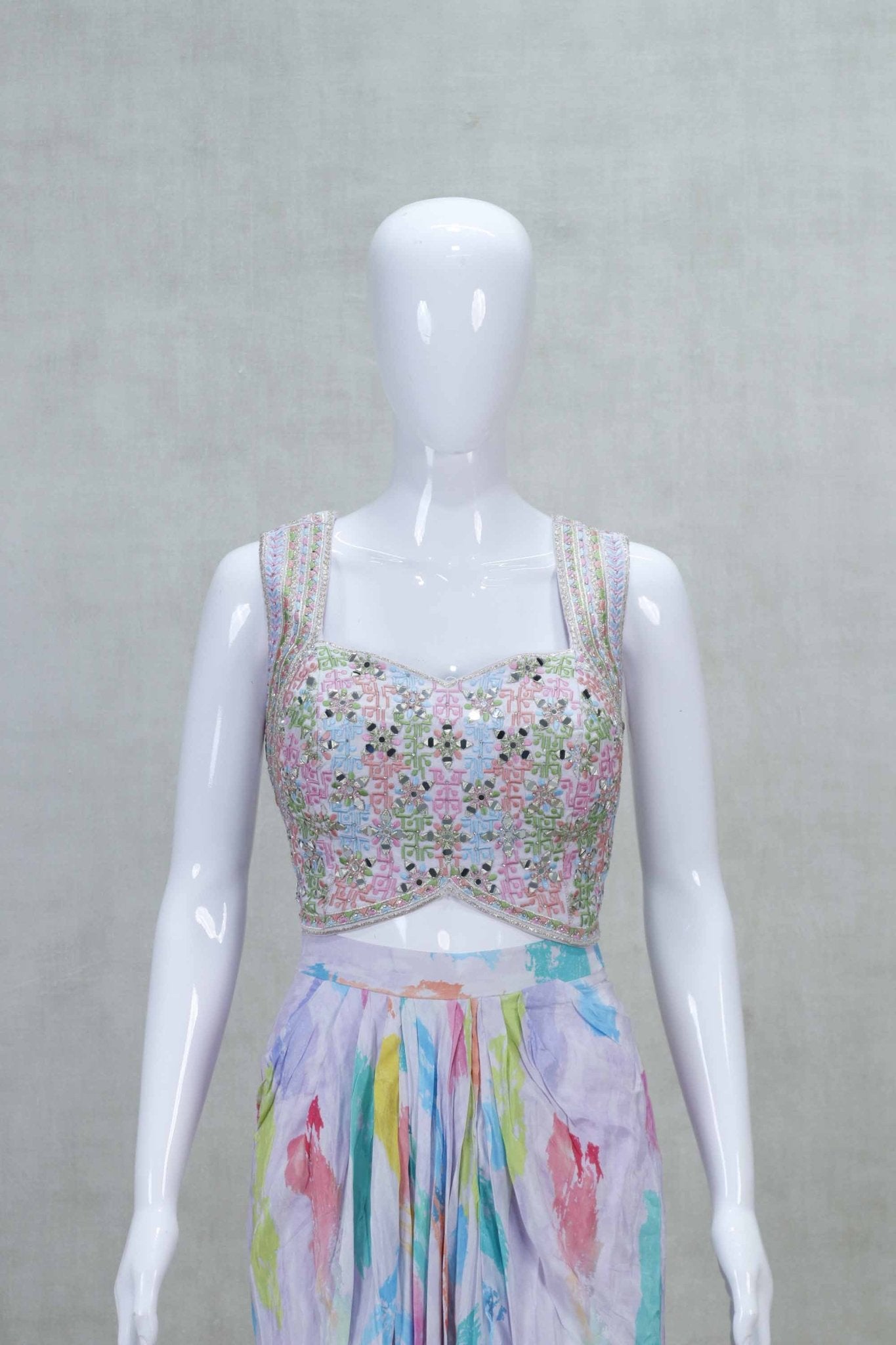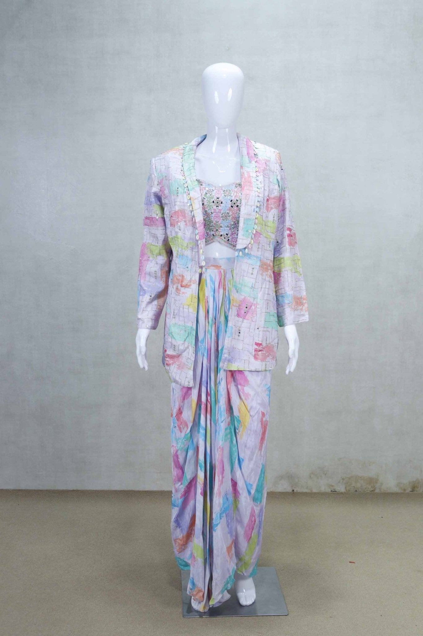 Make a vibrant statement with this Multicolor Indo-Western Dhoti Style with Embellished Top and Jacket, perfect for festive occasions and contemporary celebrations. This stylish ensemble features a beautifully draped saree in soft, abstract pastel prints, paired with a heavily embellished sleeveless blouse that adds just the right amount of shimmer. The coordinating blazer-style jacket, adorned with subtle mirror work and button detailing, brings a modern, structured edge to the traditional look. Crafted from lightweight and breathable fabric, this outfit effortlessly blends comfort with couture, making it a standout choice for weddings, parties, or destination events.