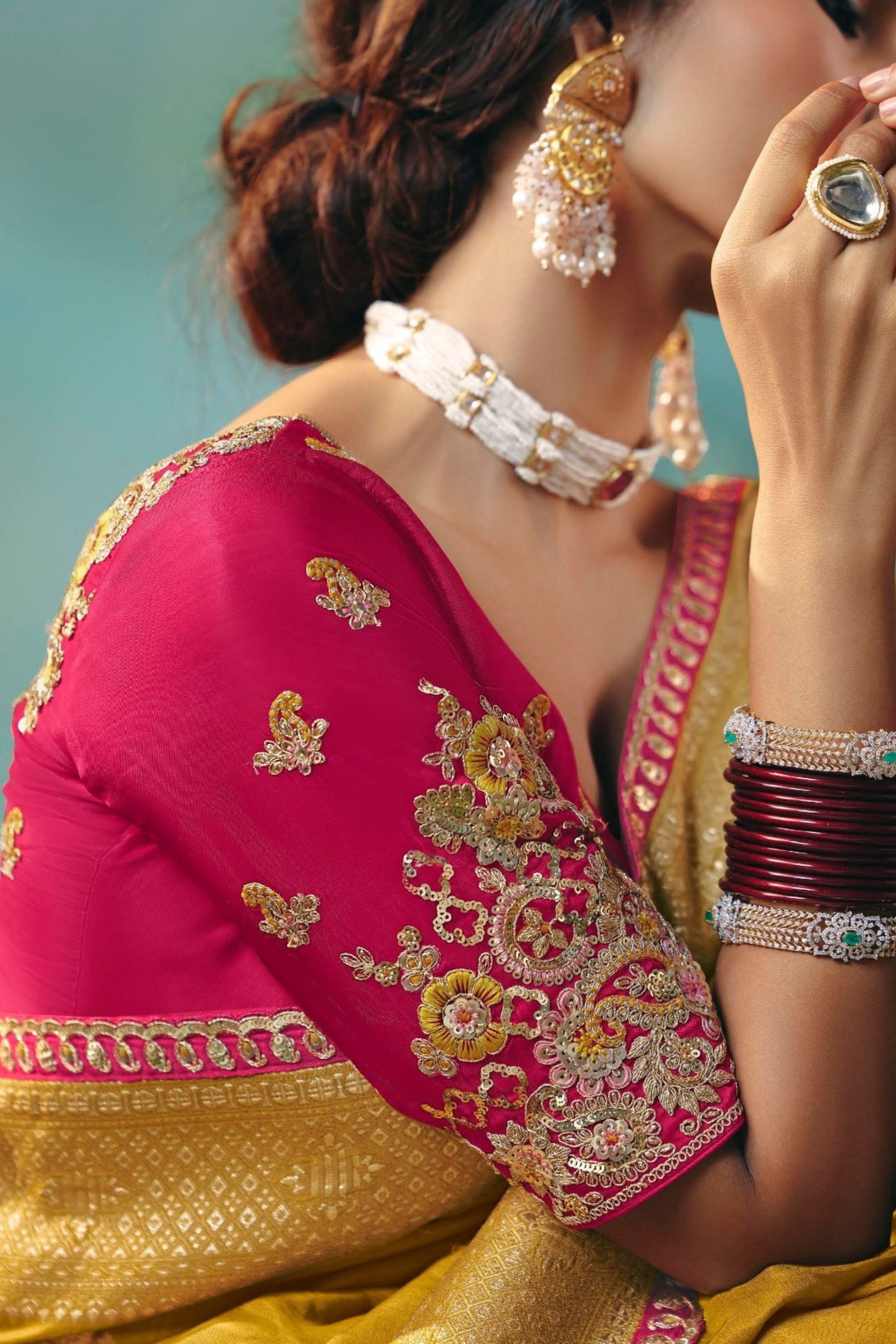Elevate your style with this Elegant Mustard Yellow Silk Saree, a stunning fusion of traditional Indian craftsmanship and modern elegance. Perfect for bridal events, weddings, festivals, and special occasions, this traditional Indian saree combines a rich mustard yellow base with intricate pink and gold embroidery to create a look that’s both opulent and timeless. Crafted from premium silk fabric, this pink and gold embroidered saree exudes luxury and comfort. The vibrant mustard yellow hue symbolizes warmth and positivity, while the delicate pink and gold threadwork adds a touch of sophistication. From floral motifs to geometric patterns, every detail is meticulously designed to reflect the artistry of Indian textiles, making it a standout piece for bridal wear or festive celebrations.