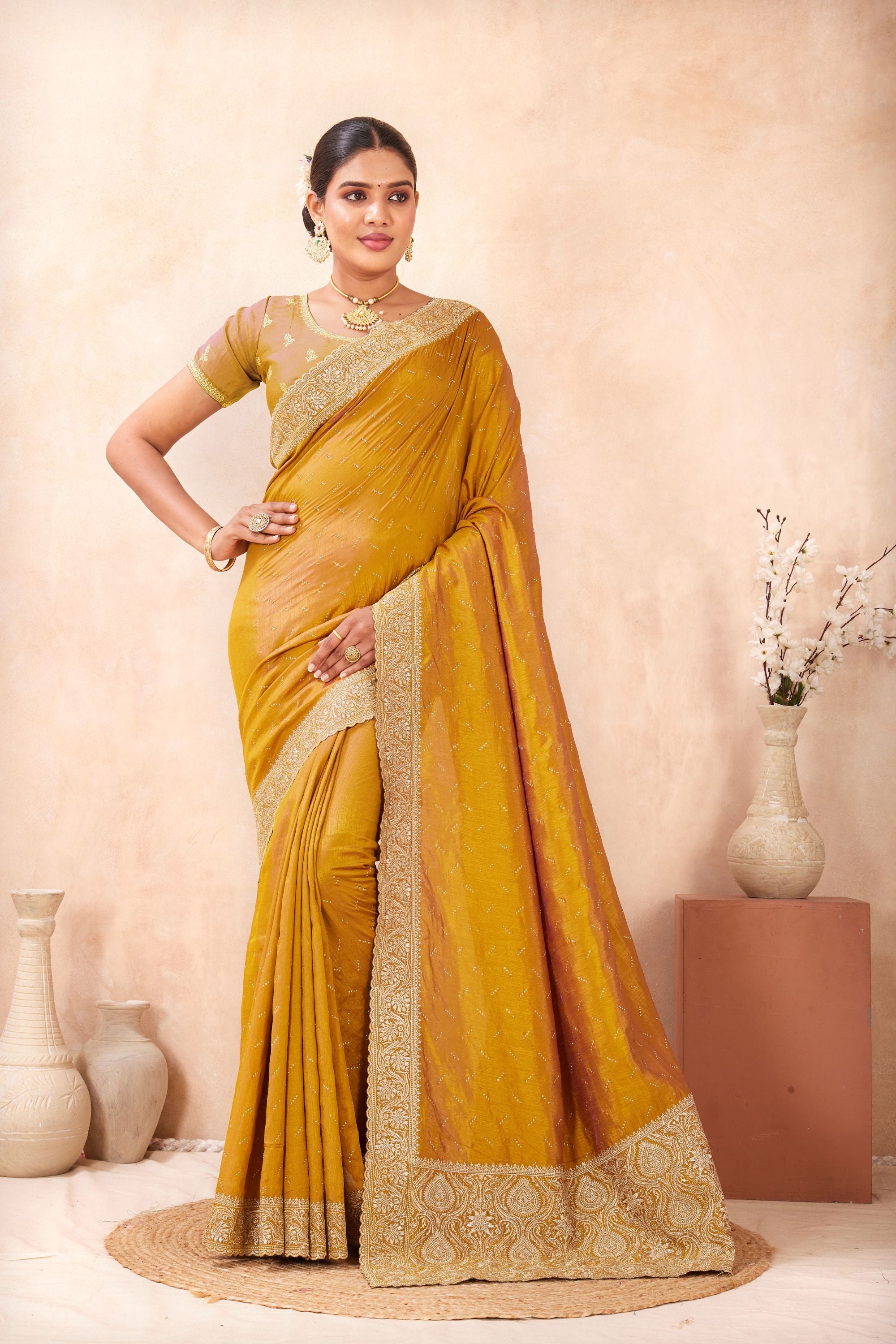 Mustard Yellow Embroidered Silk Saree with Heavy Zari Border Blouse