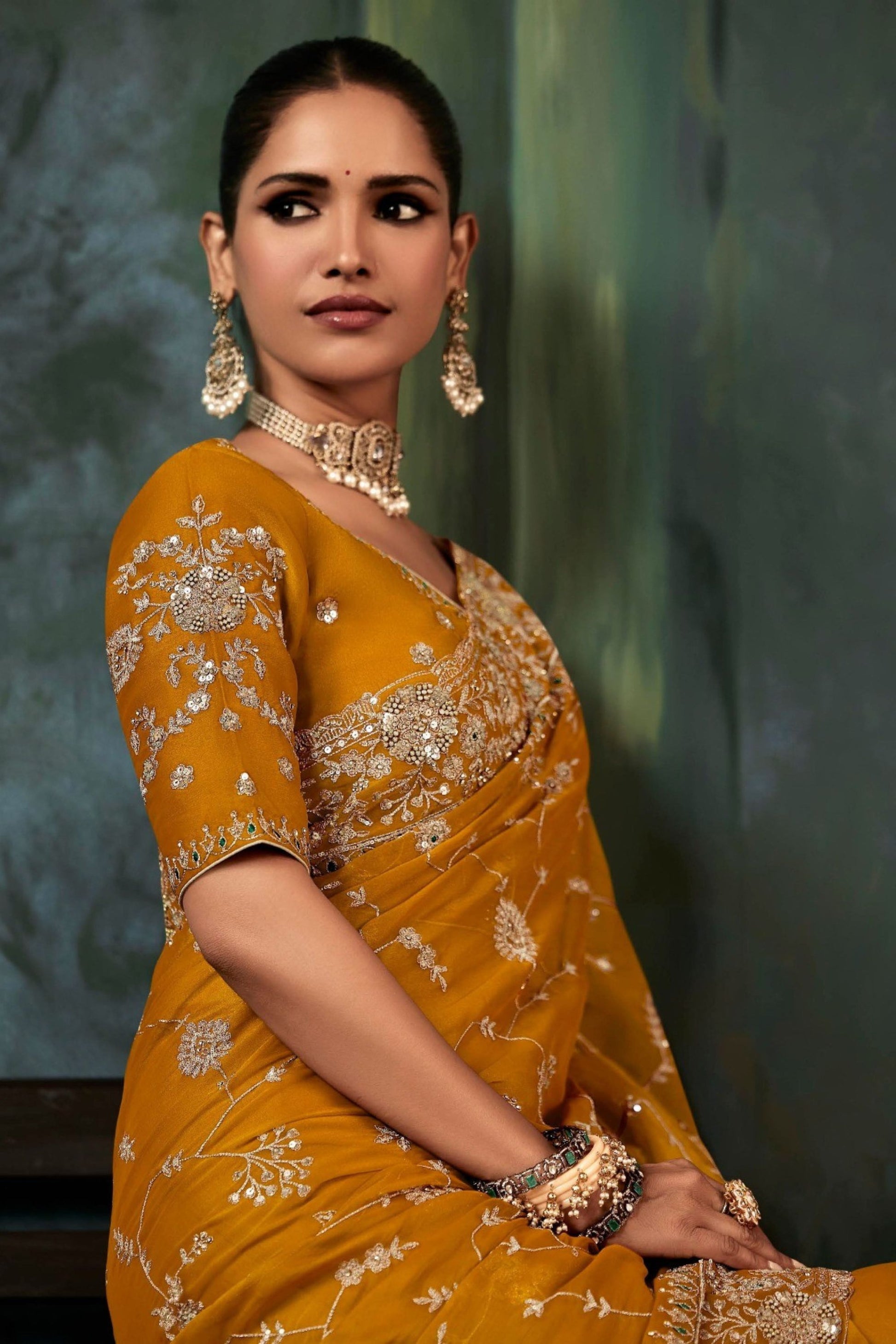 Elevate your traditional wardrobe with this Mustard Yellow Heavy Designer Georgette Saree with Matching Blouse , crafted to bring timeless elegance and luxurious charm to your festive and wedding look. Made from premium-quality georgette, this saree drapes beautifully and offers a lightweight, flowy silhouette that enhances every figure. The saree features intricate silver zari and thread embroidery, highlighted with floral motifs and a richly detailed border that adds a regal touch. Paired with a matching embroidered blouse, this ensemble is perfect for weddings, receptions, festive celebrations, and special occasions where you want to stand out with sophisticated grace. Whether styled with statement jewelry or kept minimal for modern elegance, this mustard embroidered saree is a stunning choice for bridesmaids, wedding guests, and festive fashion lovers.