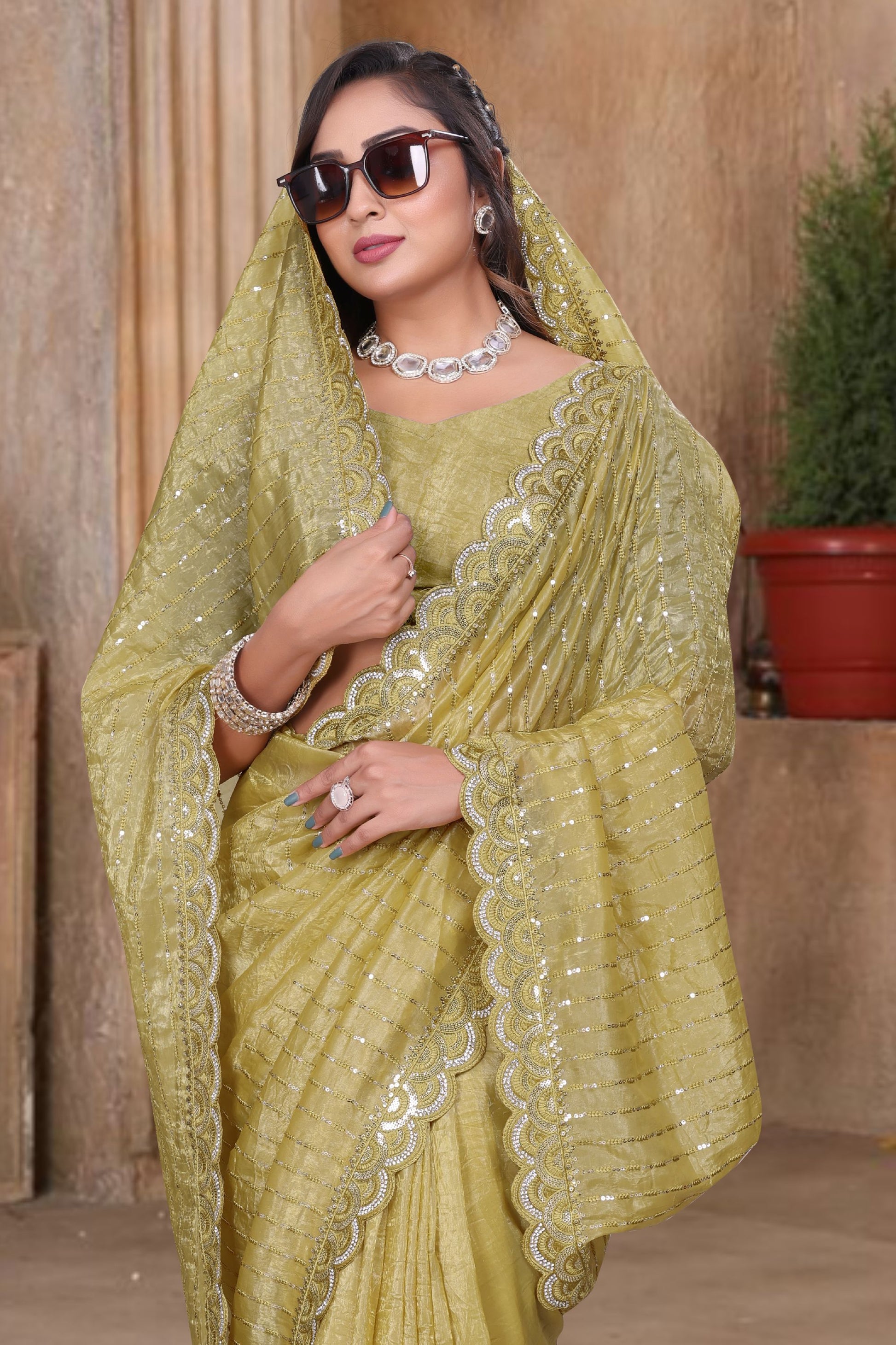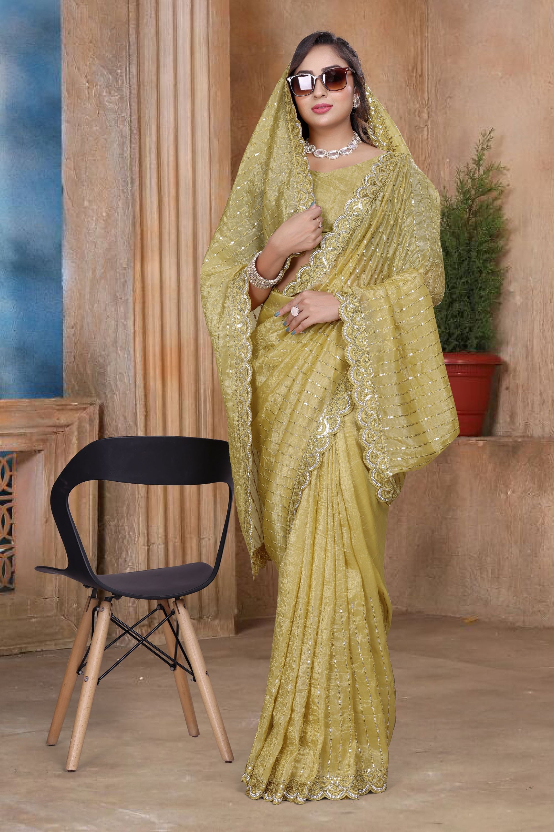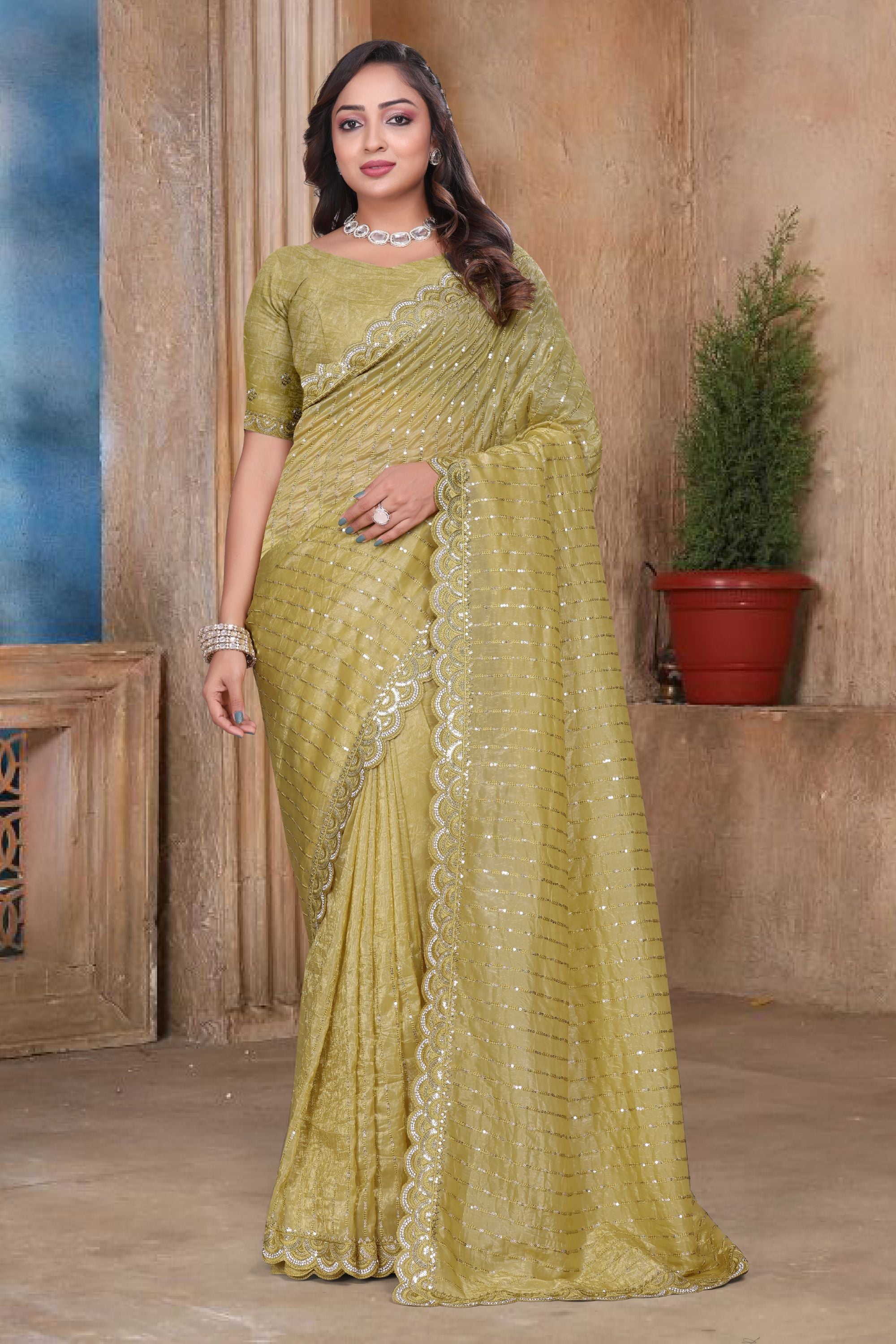 Make a bold and elegant statement with this Women's Mustard Yellow Sequin Embroidered Gold Crush Saree with Designer Blouse. Crafted from soft organza fabric with a luxurious gold crush texture, this saree features exquisite vertical sequin embroidery and a scalloped lace border that adds timeless charm. The rich mustard yellow color brings a radiant glow to your ethnic look, perfect for festive occasions, weddings, and evening events. Paired with a matching designer blouse in the same vibrant tone, the outfit offers a flattering fit and elevated style. Lightweight yet glamorous, this saree is the perfect blend of comfort and celebration-ready fashion.