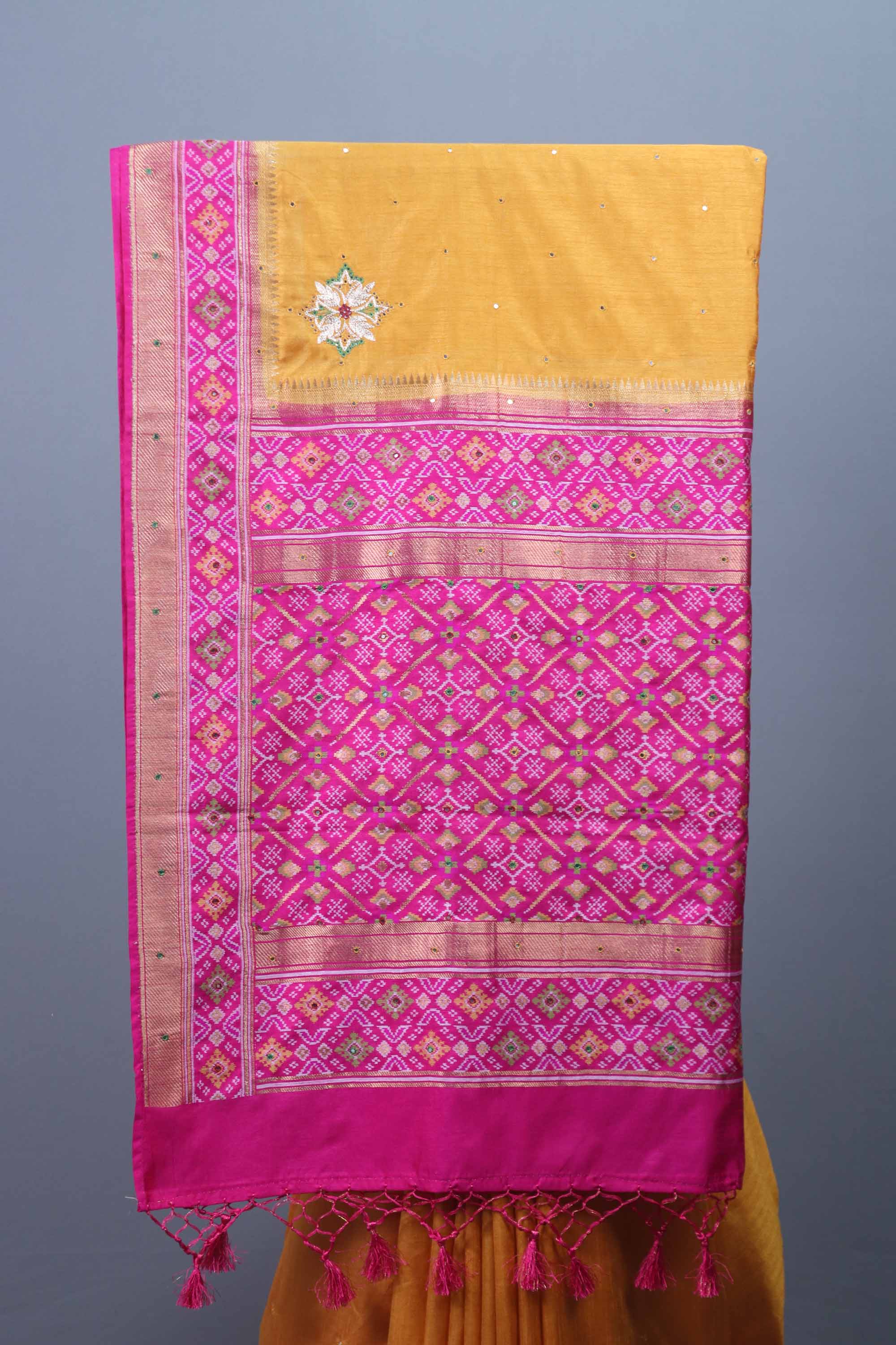 Mustard Yellow Silk Saree with Pink Woven Zari Border Tassels Pallu