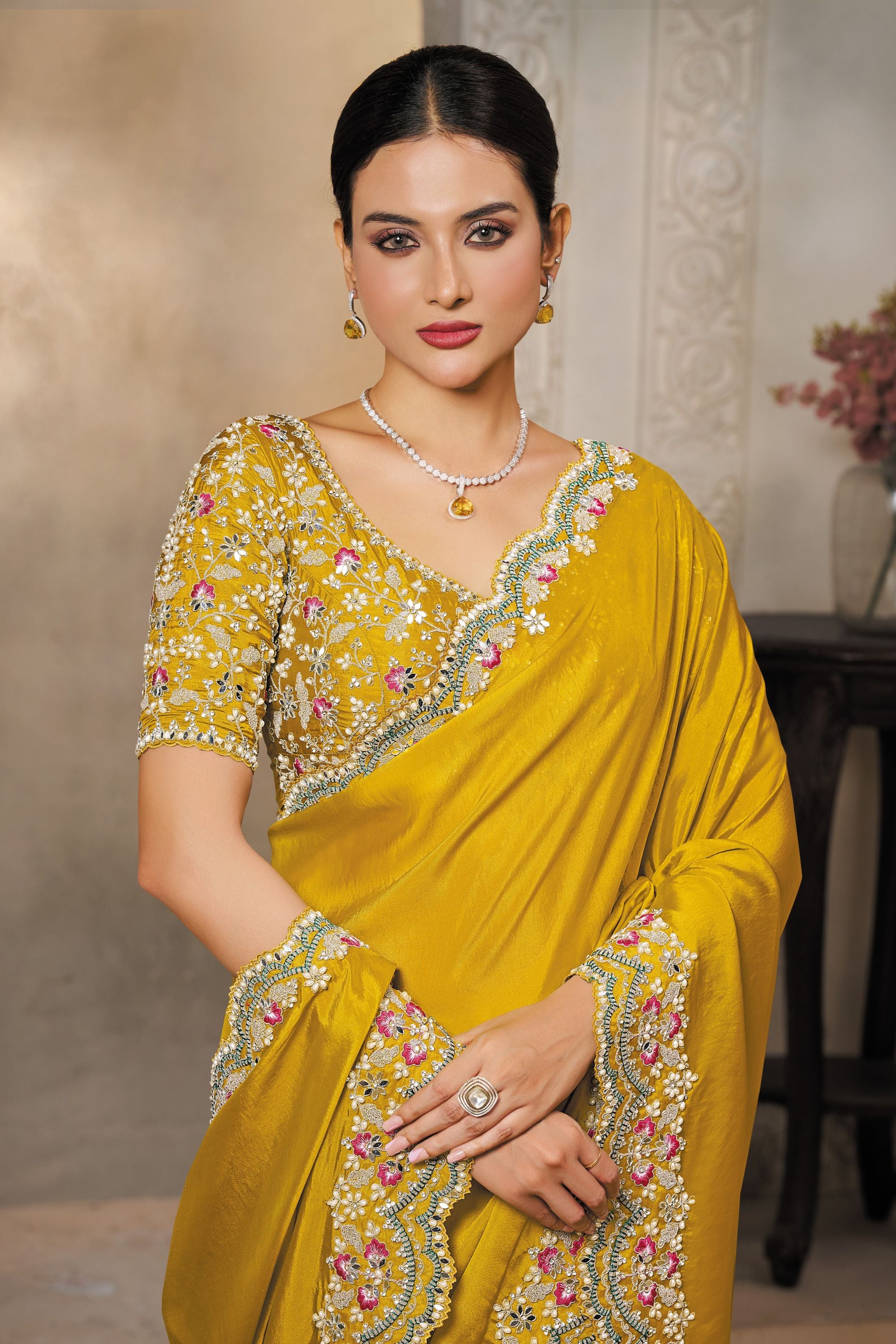Mustard Yellow Silk Saree with Stone and Zari Border Designer Saree
