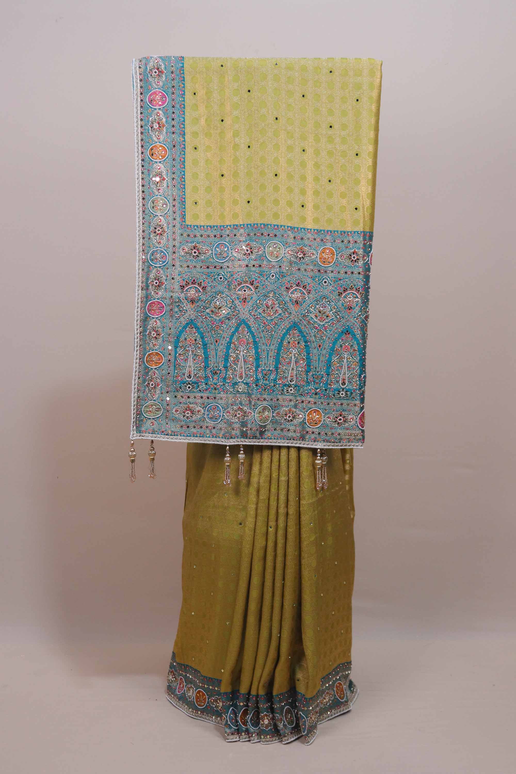 Mustard Yellow Turquoise Designer Silk Saree Heavy Embroidered Border