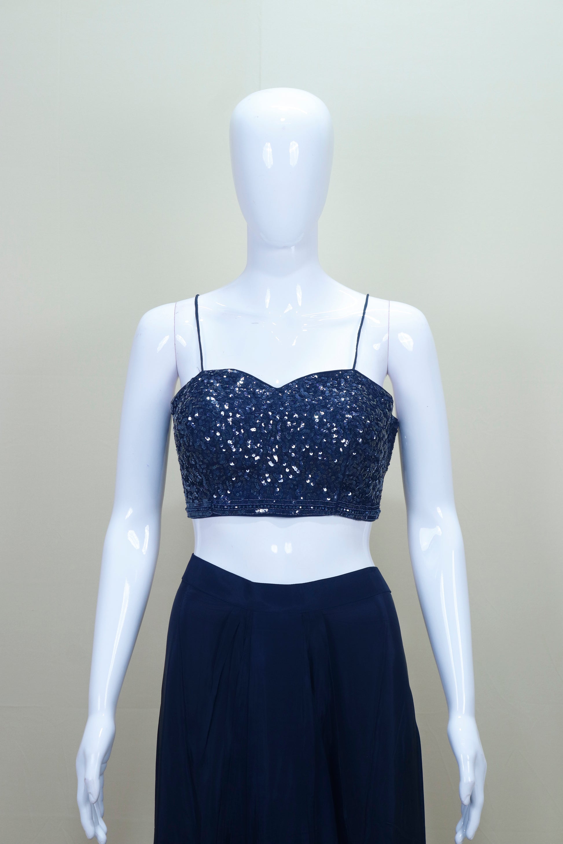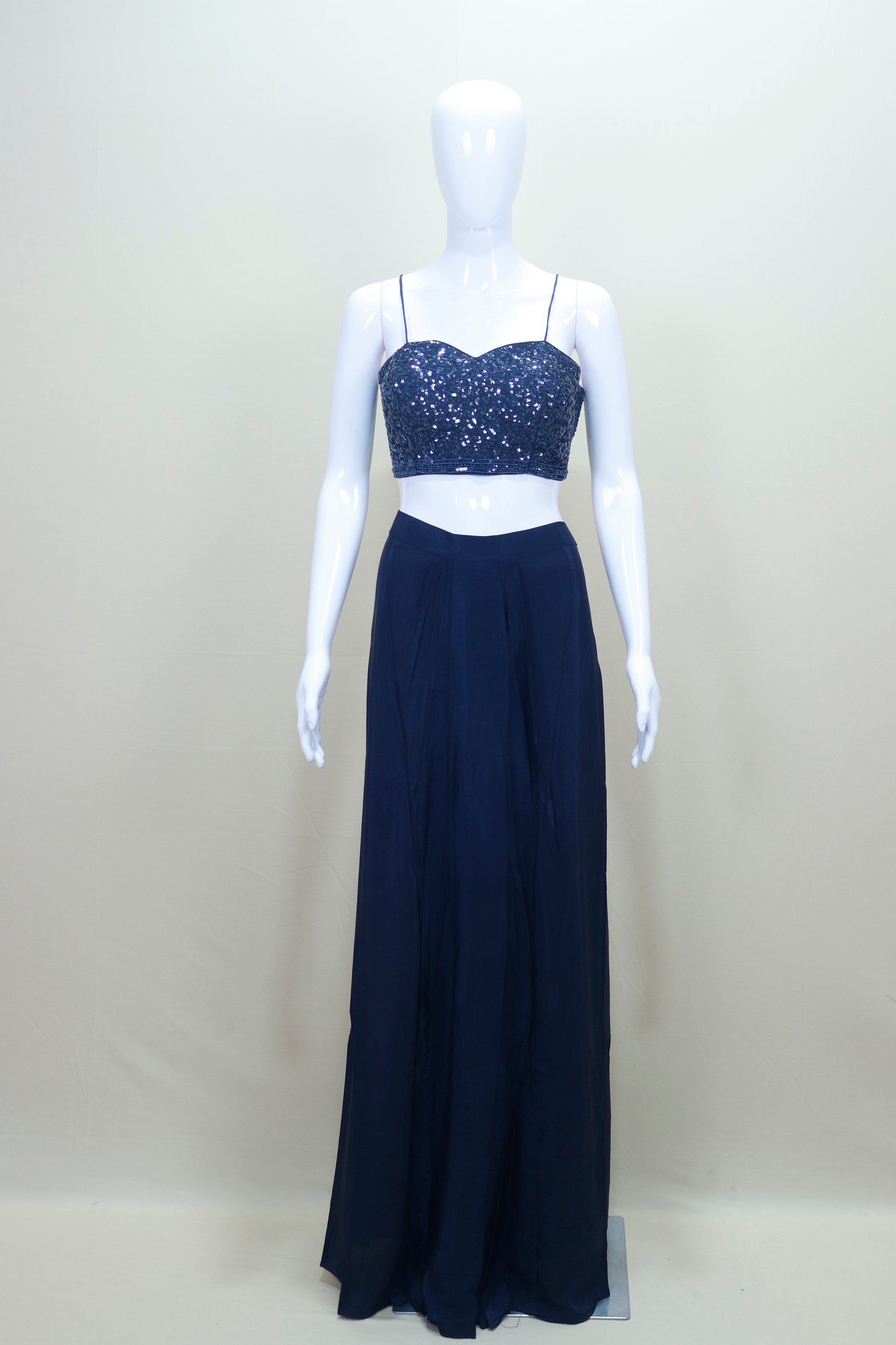 Elevate your ethnic wardrobe with this Navy Blue Designer Crop Top with Jacket and Palazzo Set Party wear Perfectly crafted for modern women, this stylish three-piece co-ord set includes a sequin-embellished crop top, a matching embroidered jacket, and flowy pants for a chic and comfortable look. The premium fabric ensures elegance with ease of wear, making it an ideal choice for weddings, receptions, festive occasions, and evening parties.