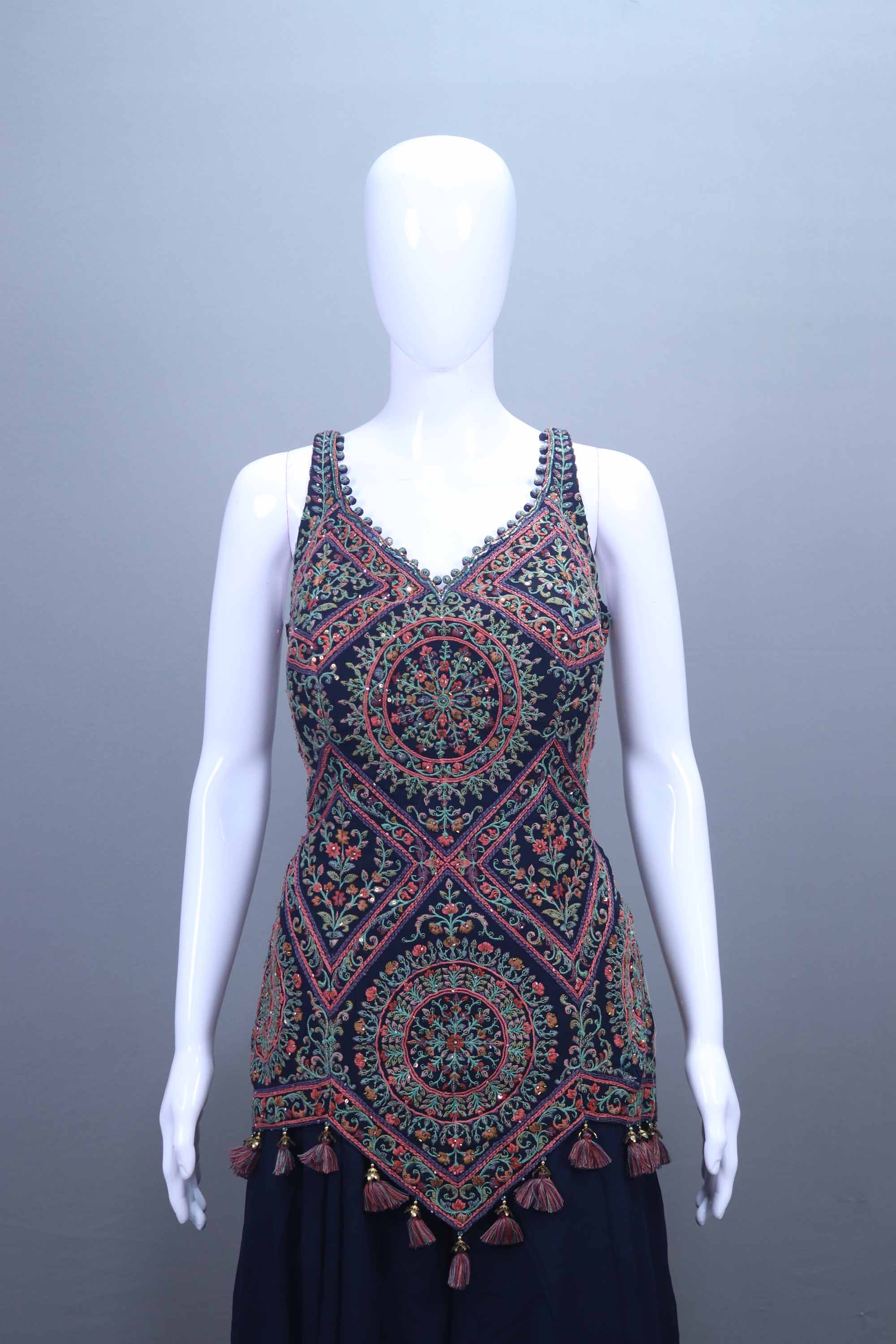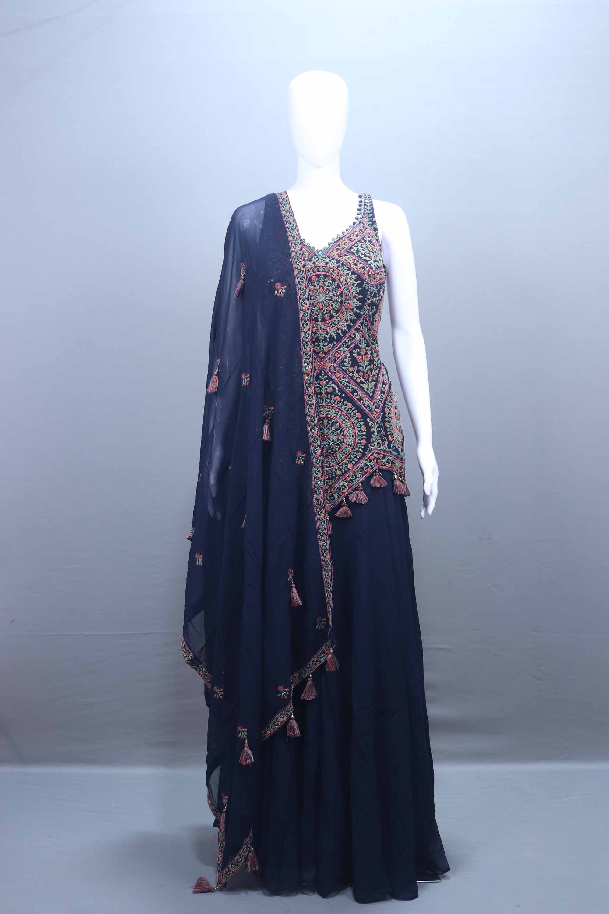 Add a touch of royal charm to your festive wardrobe with this Navy Blue Georgette Embroidered Sharara Set with Dupatta .Crafted from lightweight georgette fabric, this elegant ensemble features intricate multicolor thread embroidery with floral and geometric motifs. The sleeveless choli is richly embroidered with fine detailing, while the matching dupatta is adorned with tassels and embroidered borders that enhance its graceful appeal. Perfect for weddings, festive occasions, sangeet functions, and traditional events, this lehenga choli strikes the perfect balance between modern sophistication and ethnic artistry. The soft georgette fabric ensures comfort and effortless movement, making it ideal for long celebrations.