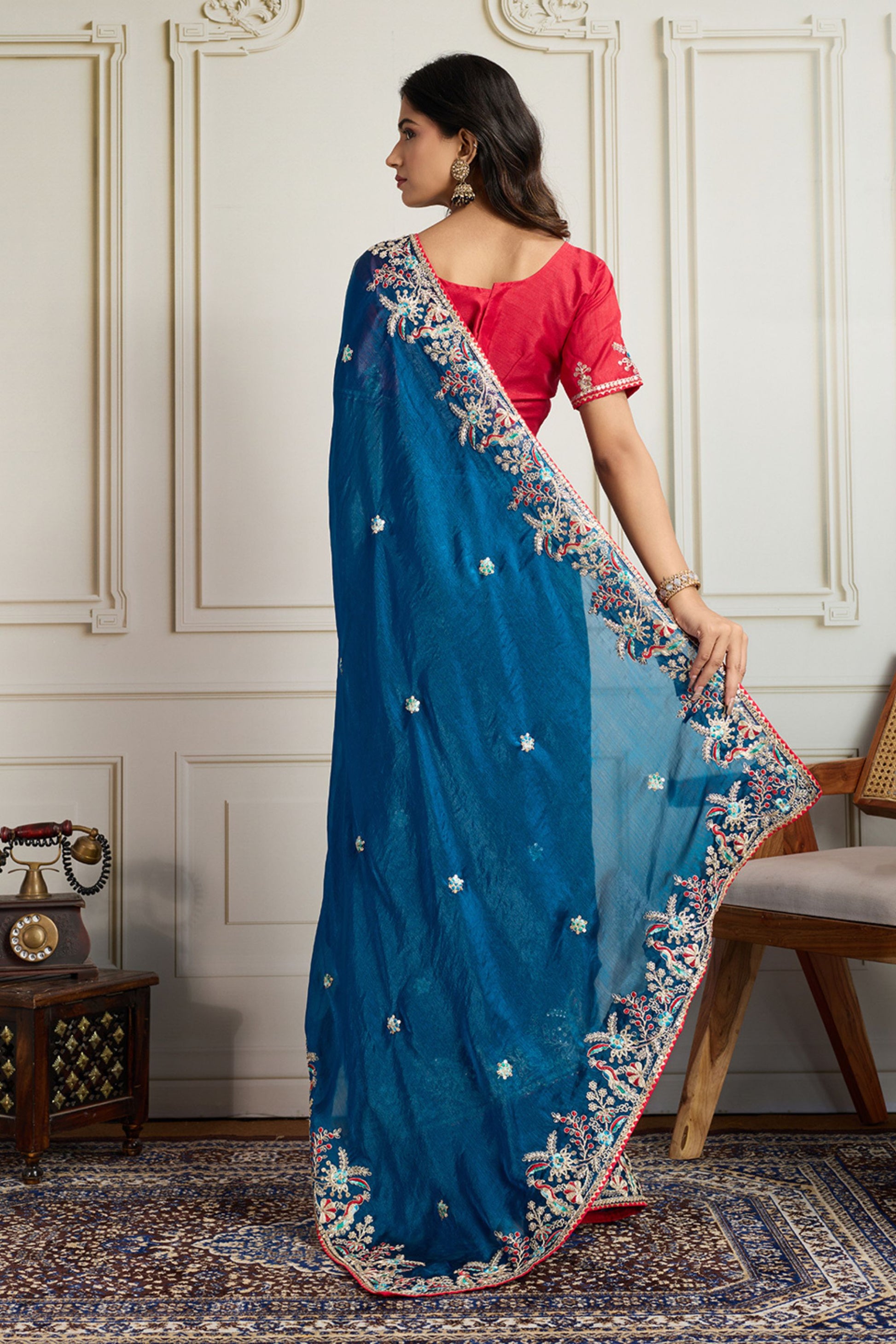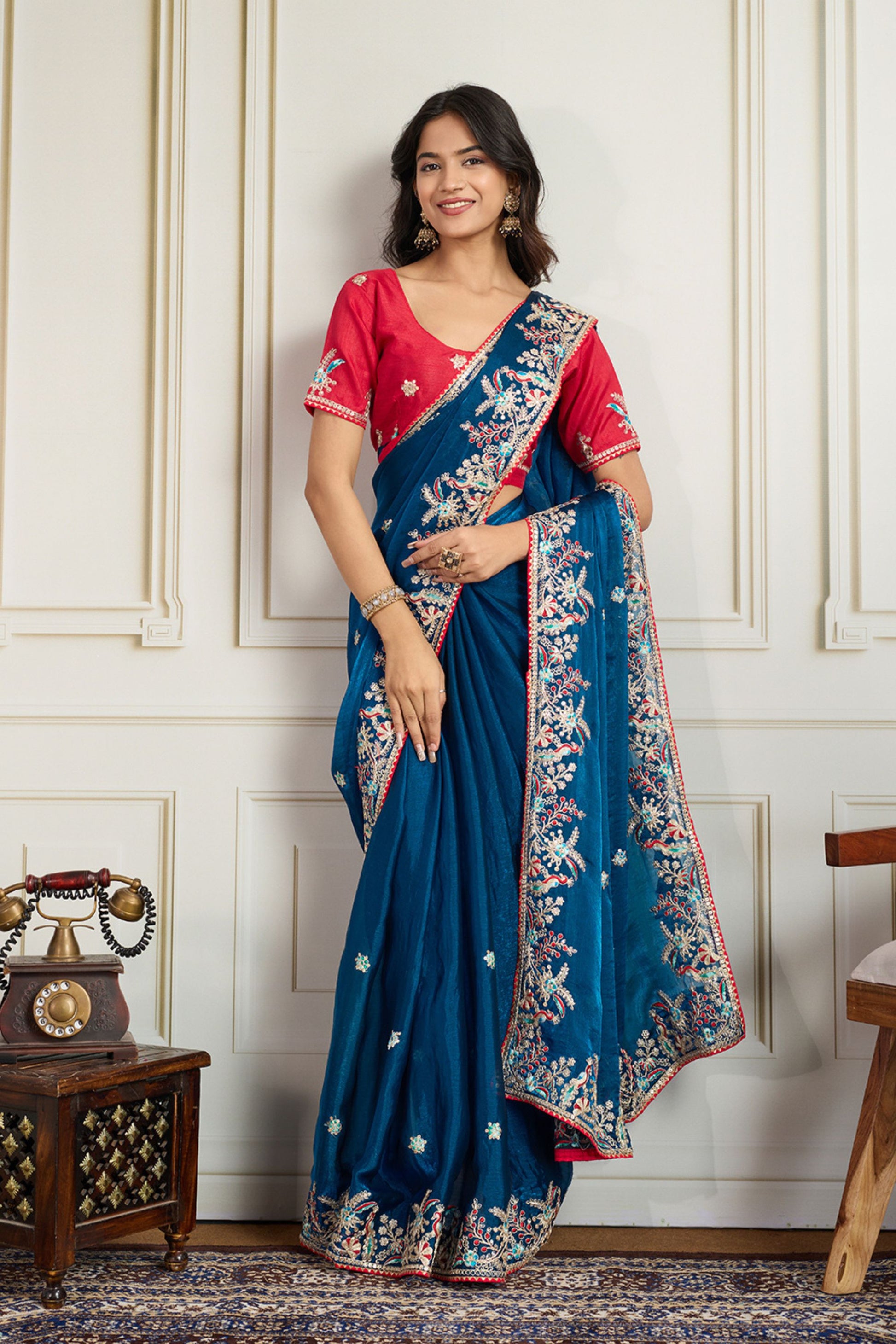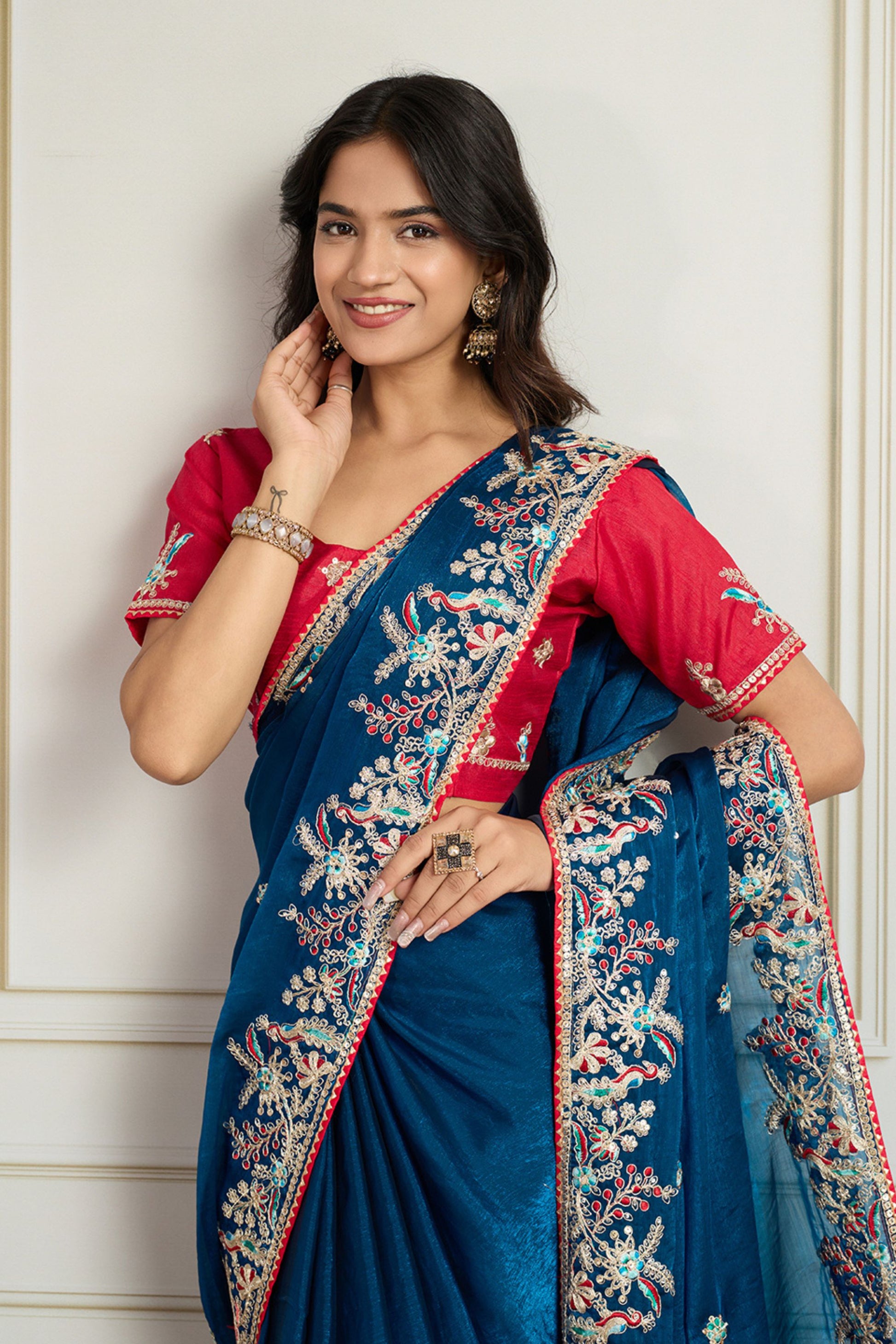 Navy Blue Saree with Red Blouse Designer Party Wear Silk Saree