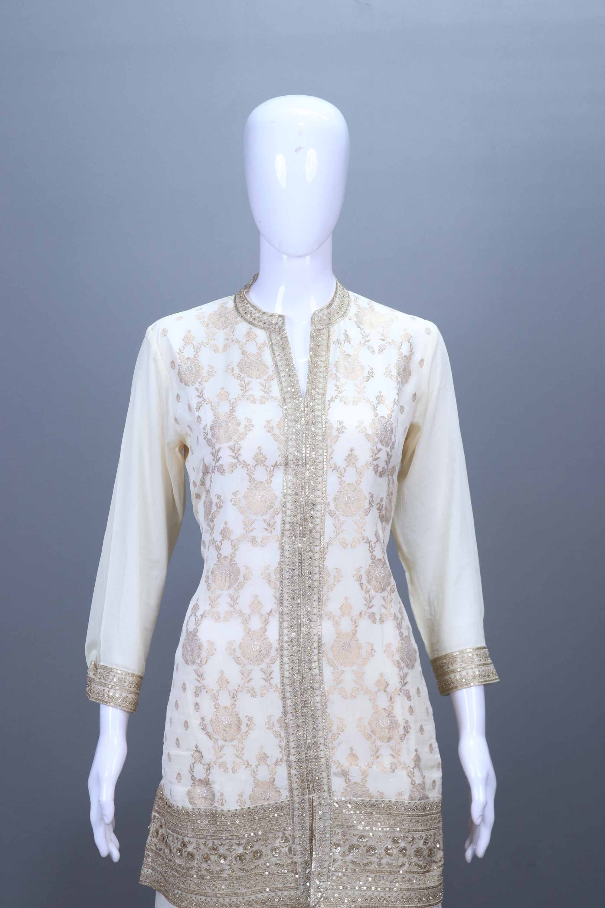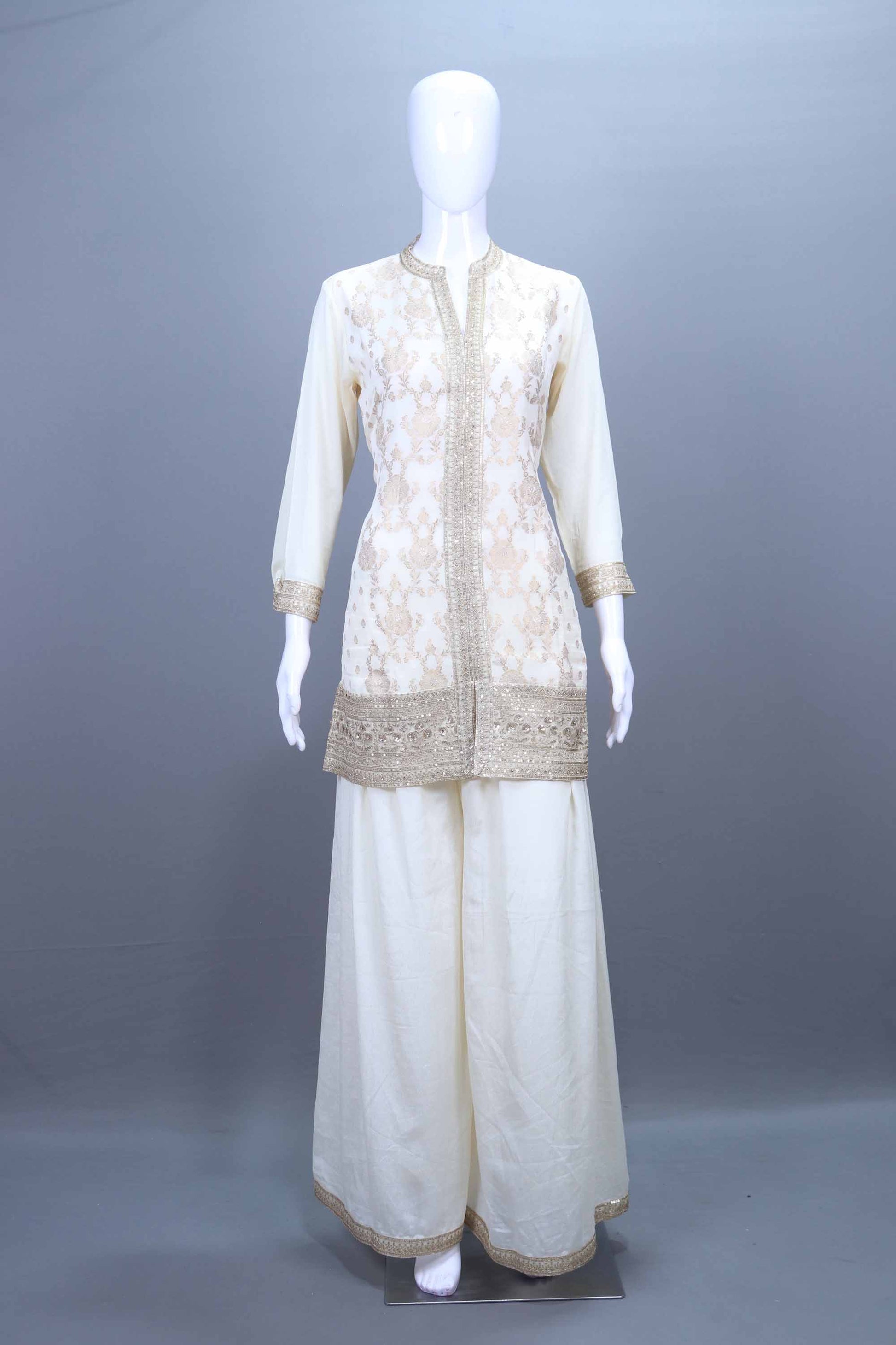 Elevate your festive style with this Off-White Embroidered Kurta Sharara Set with Dupatta crafted to add a touch of luxury to your ethnic wardrobe. Made from premium quality fabric, this outfit features intricate embroidery work on the kurta with detailed borders, showcasing fine craftsmanship and timeless elegance. The beautifully designed sharara pants offer a graceful flare, ensuring comfort and ease of movement, while the matching embroidered dupatta completes the look with sophistication. Perfect for weddings, festive occasions, parties, engagements, family gatherings and cultural celebrations, this designer suit ensures you stand out effortlessly.