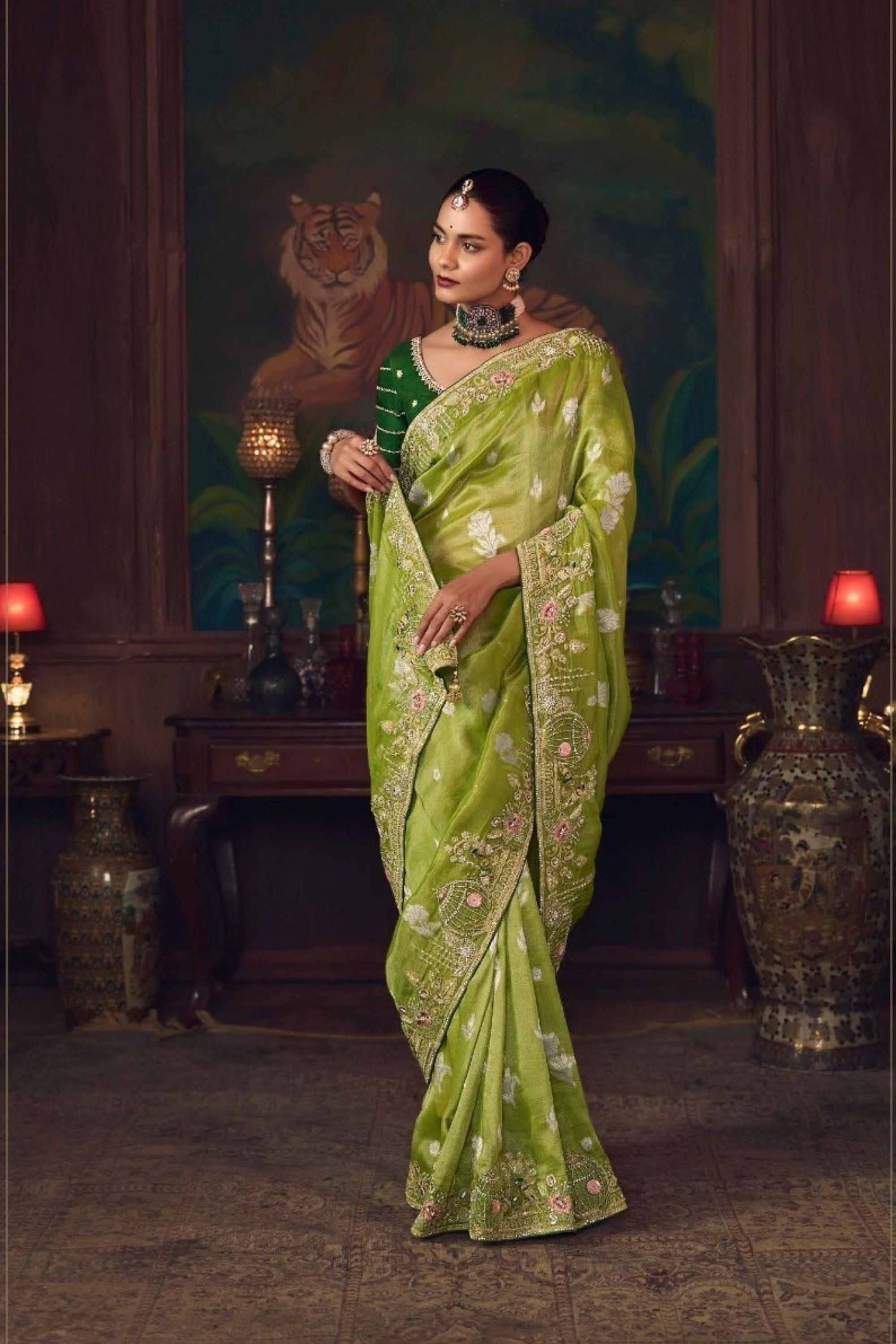 Drape yourself in timeless elegance with this  Olive Green Silk Saree with Designer Green Blouse, featuring exquisite hand embroidery and delicate zari work along the border. Crafted from premium silk fabric, this saree exudes luxury with its soft texture and rich sheen. The designer embroidered green blouse perfectly complements the saree, creating a regal and sophisticated look ideal for weddings, festive events, and grand celebrations. The saree showcases intricate floral motifs and shimmering threadwork that add depth and glamour to its traditional charm. Lightweight yet opulent, it ensures all-day comfort while making a stunning style statement.