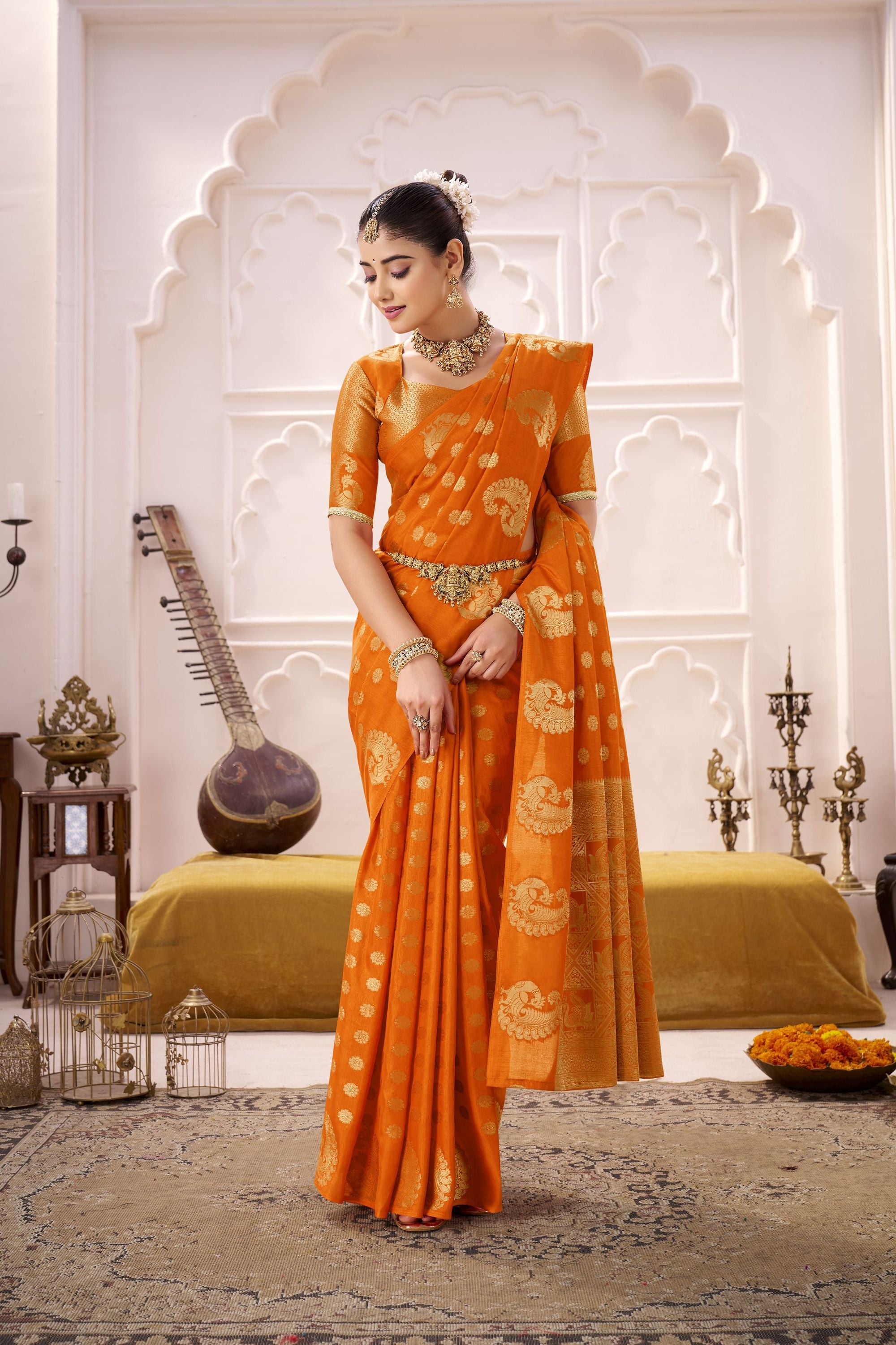 Orange Banarasi Silk Saree with Gold Zari Buta Traditional Pallu