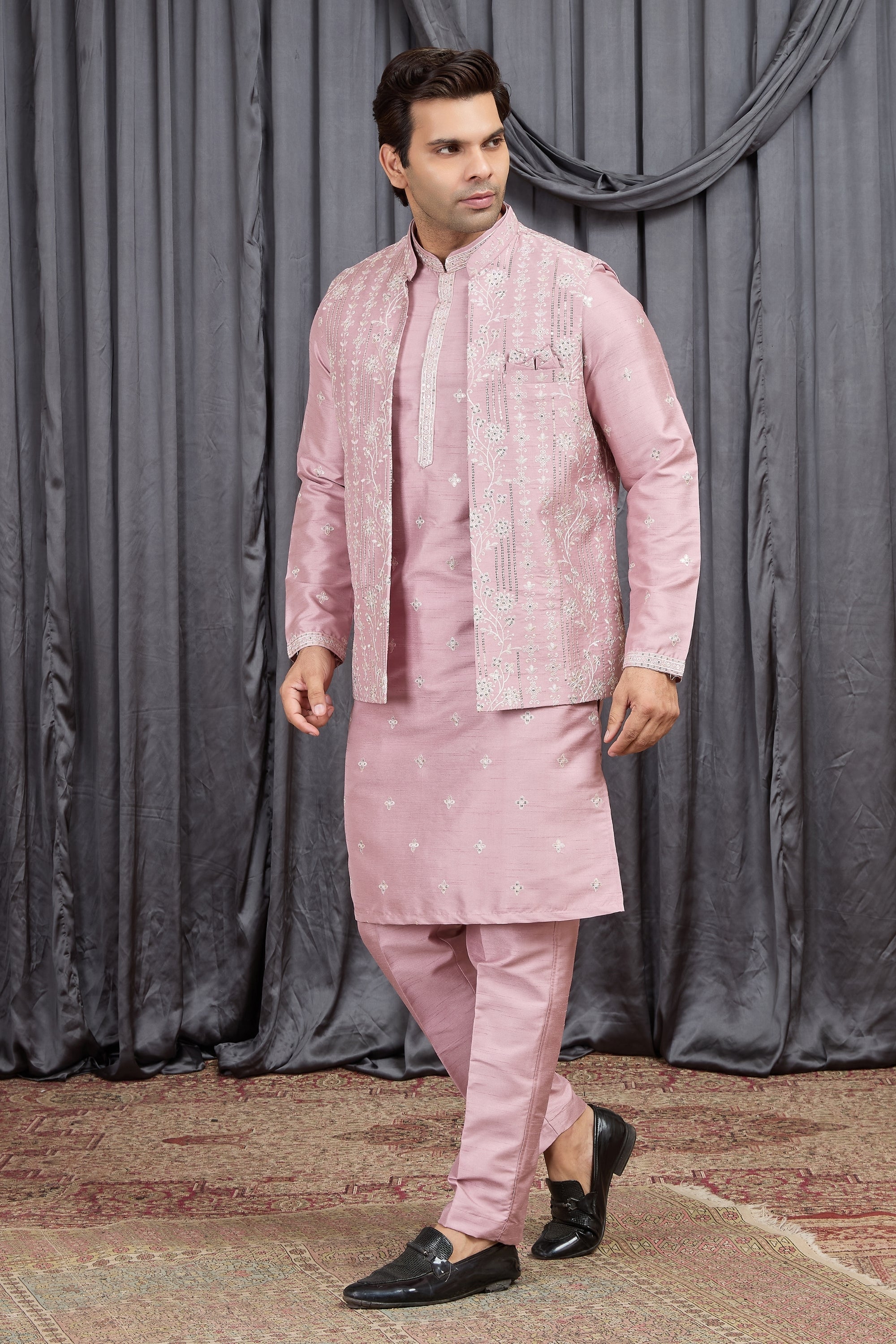 Upgrade your festive wardrobe with this Outstanding Pink Art Silk Embroidered Wedding Kurta Pyjama with Jacket for Men, designed to combine traditional charm with modern style. This sophisticated ethnic outfit features a graceful pink kurta paired with a matching pyjama and a beautifully embroidered sleeveless jacket, making it a perfect choice for weddings and festive celebrations. Crafted from premium Art Silk fabric, this kurta set offers a luxurious texture, lightweight comfort, and a refined appearance. The intricate thread embroidery on the jacket and subtle motifs on the kurta enhance the overall design, giving the outfit a royal and elegant look. This stylish ensemble is ideal for groomsmen, wedding guests, festive gatherings, receptions, and cultural events.